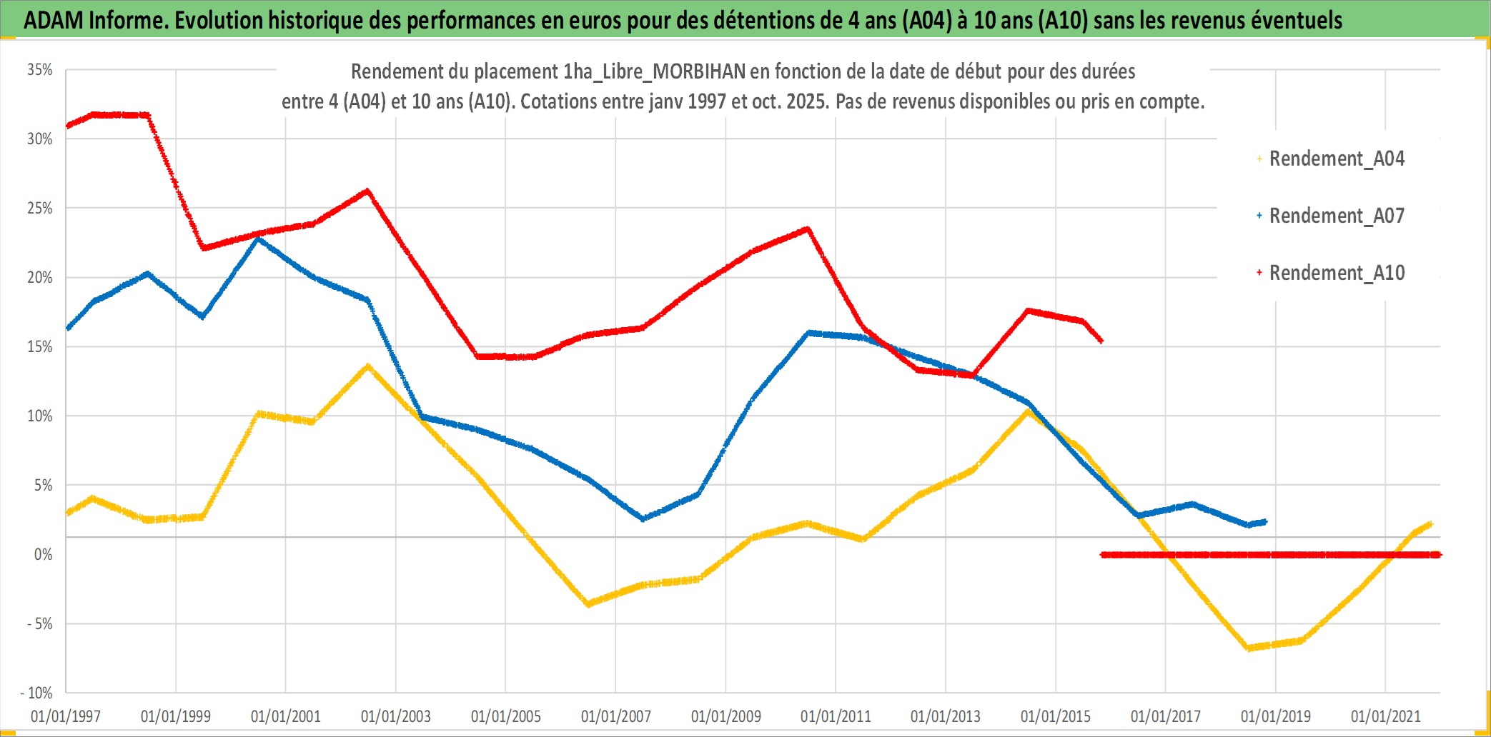 Site dédié aux investisseursPage dédiée sur site financeAnalyse des valorisations hebdomadaires de l'actif 1ha_Libre_MORBIHAN. Cet actif est cote en EUR. Les valorisations couvrent les semaines 1997W01 a 2025W44. Les fermages de ce bien foncier sont pris egaux a 2,5% annuels de la valeur venale du bien.