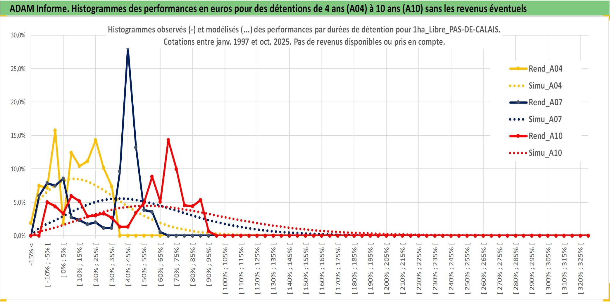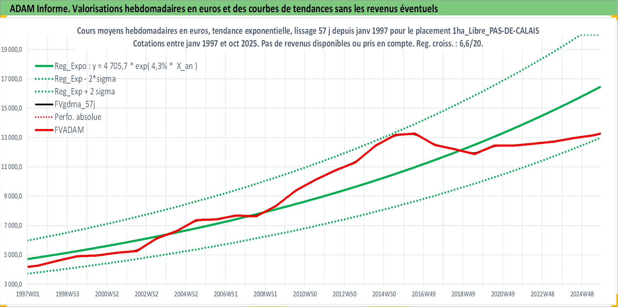 Site dédié aux investisseursPage dédiée sur site financeAnalyse des valorisations hebdomadaires de l'actif 1ha_Libre_PAS-DE-CALAIS. Cet actif est cote en EUR. Les valorisations couvrent les semaines 1997W01 a 2025W44. Les fermages de ce bien foncier sont pris egaux a 2,5% annuels de la valeur venale du bien.