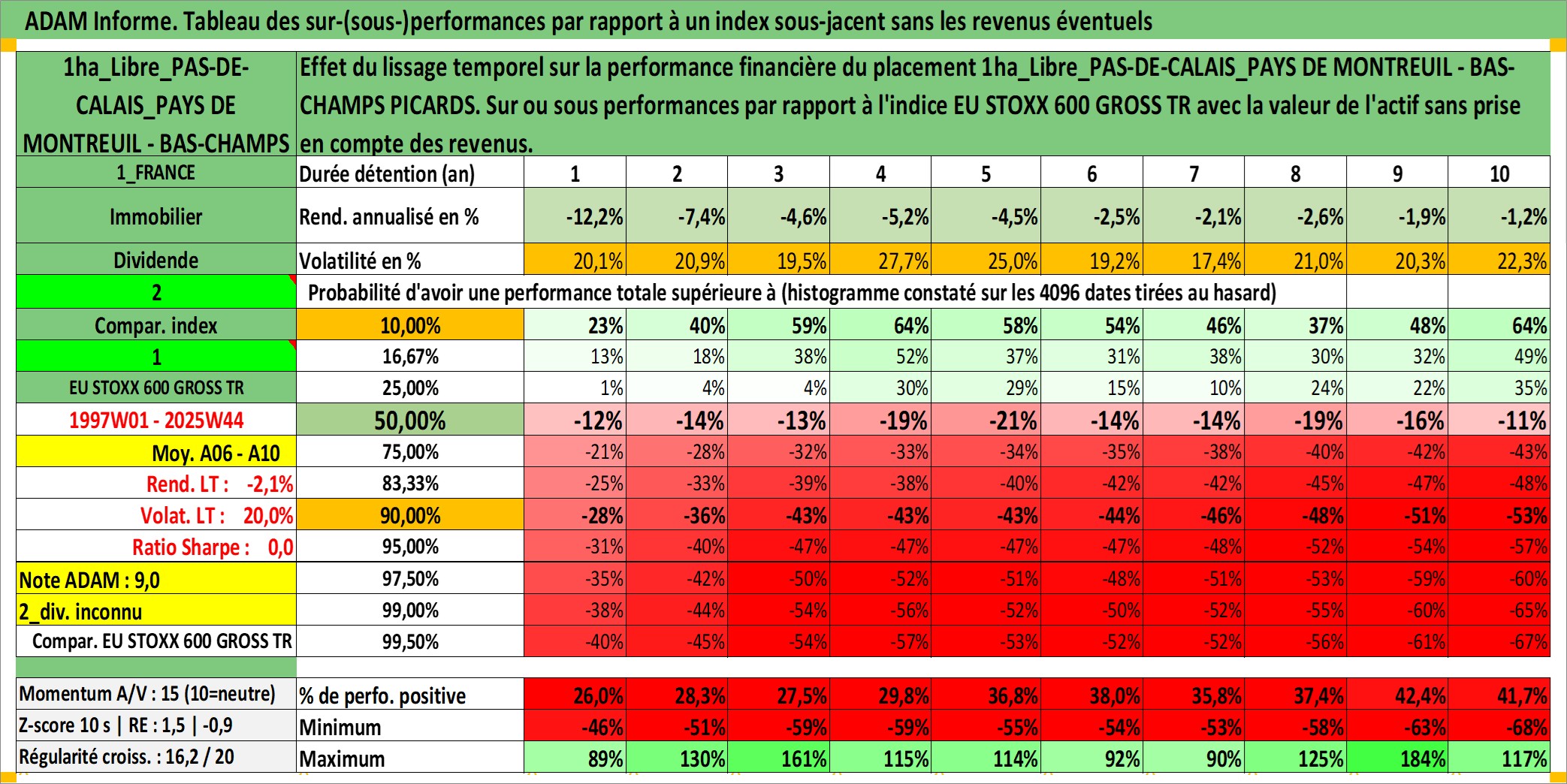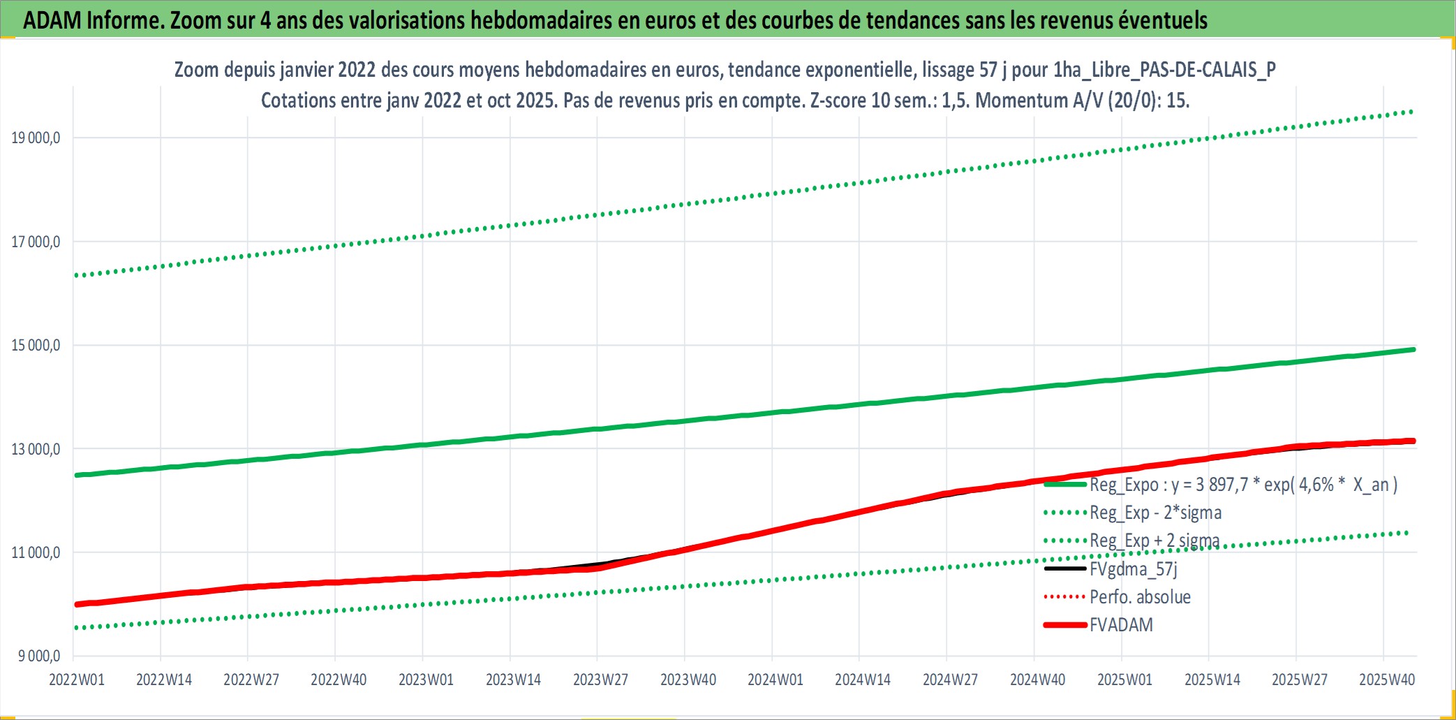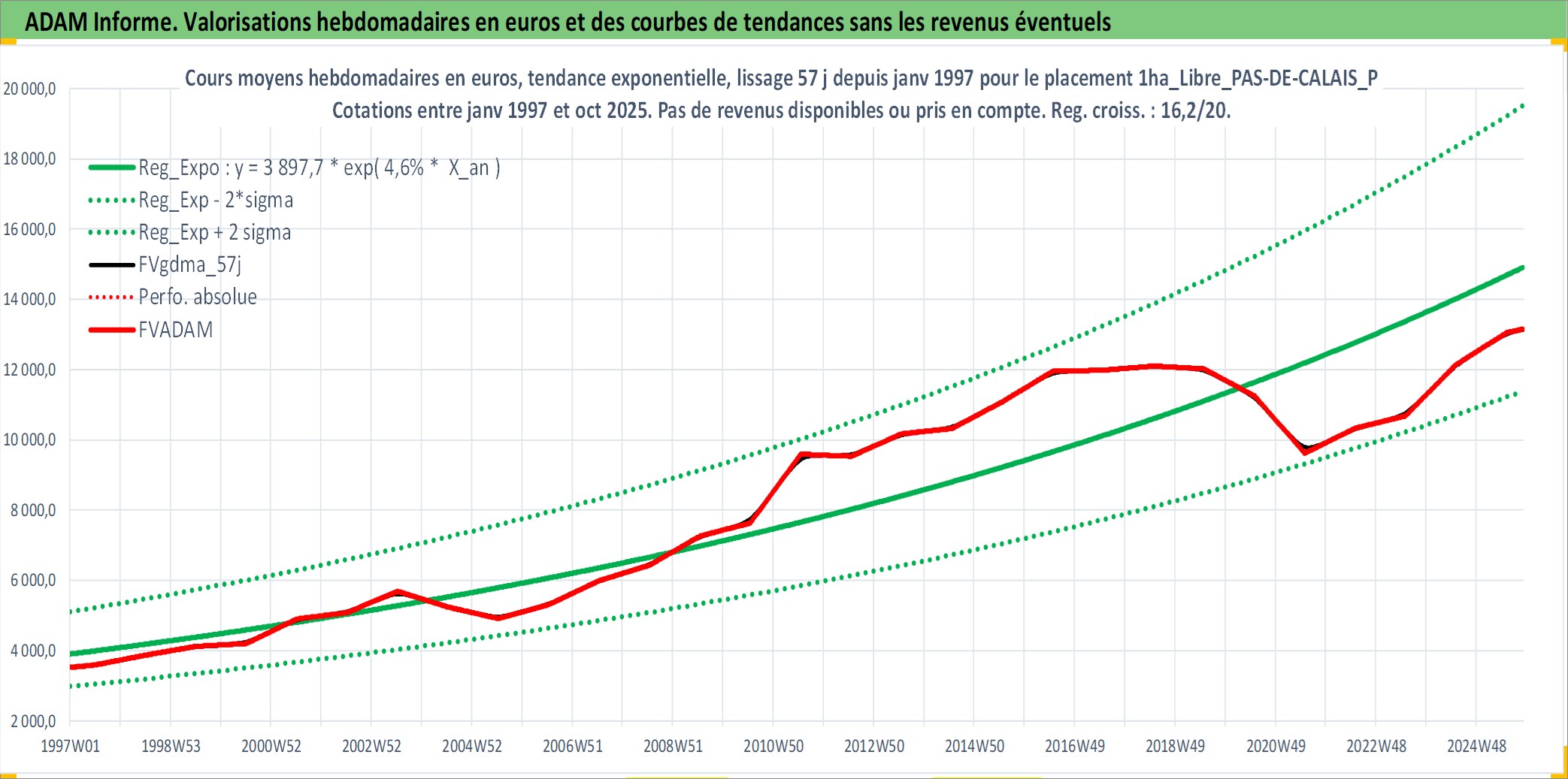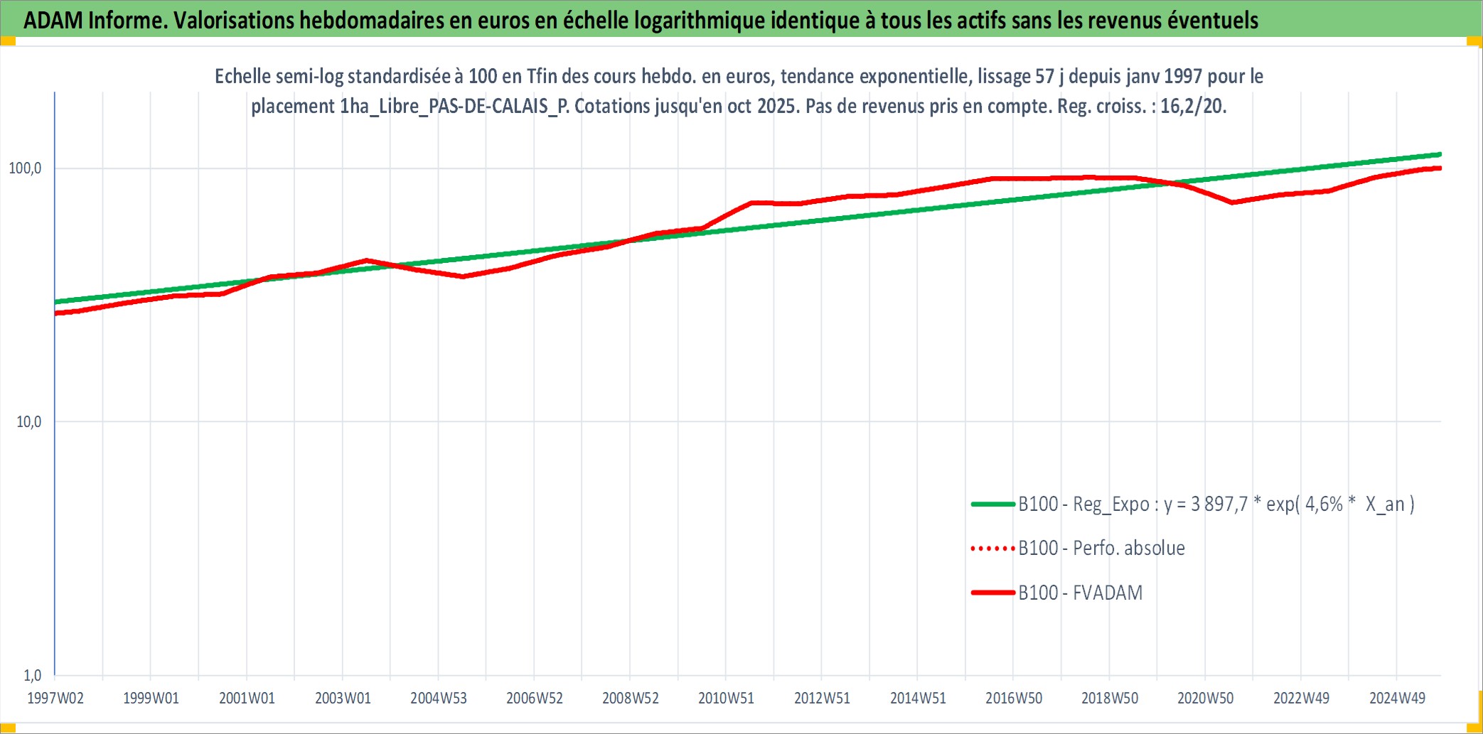 Site dédié aux investisseursPage dédiée sur site financeAnalyse des valorisations hebdomadaires de l'actif 1ha_Libre_PAS-DE-CALAIS_PAYS DE MONTREUIL - BAS-CHAMPS PICARDS. Cet actif est cote en EUR. Les valorisations couvrent les semaines 1997W01 a 2025W44. Les fermages de ce bien foncier sont pris egaux a 2,5% annuels de la valeur venale du bien.