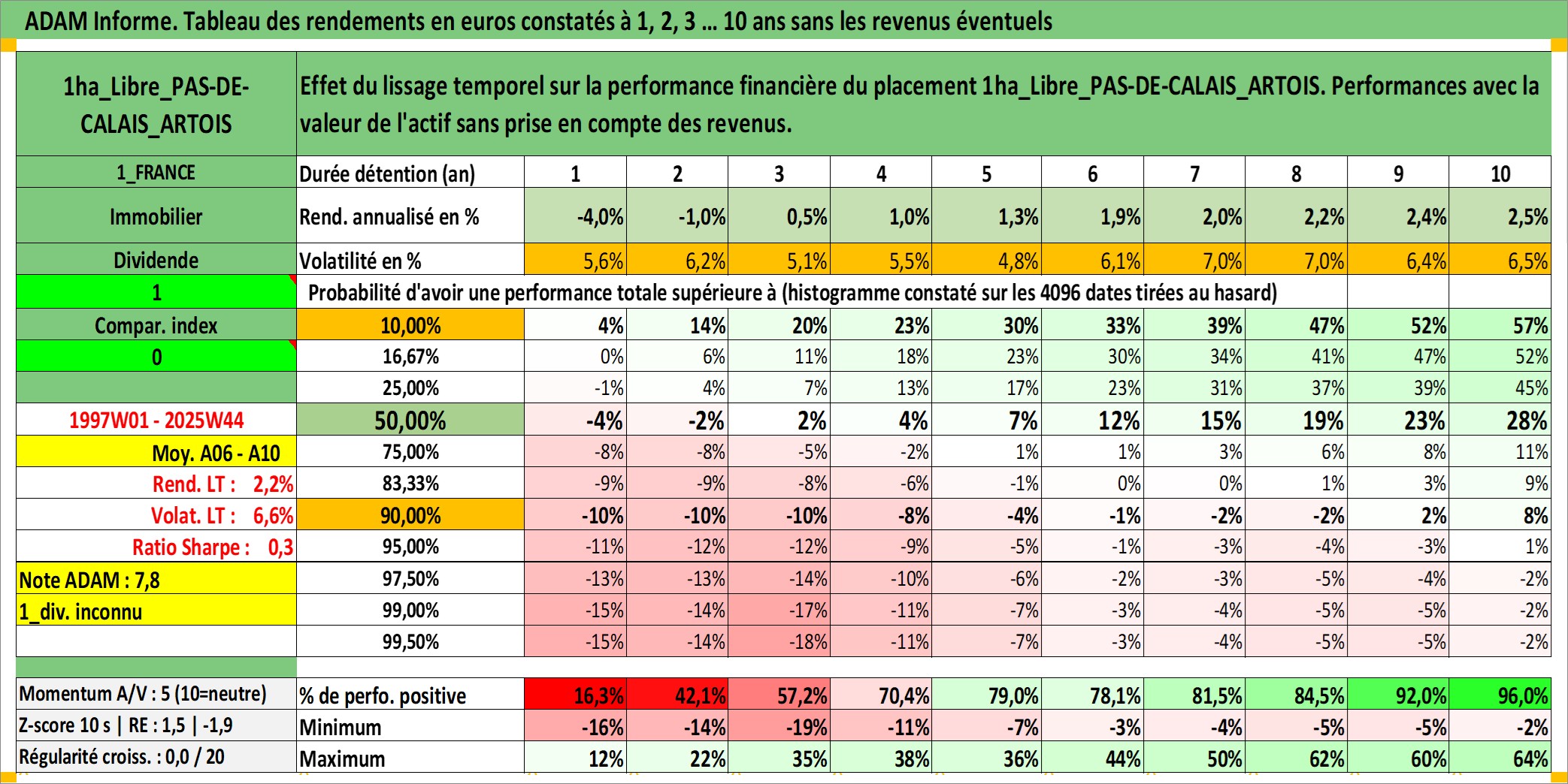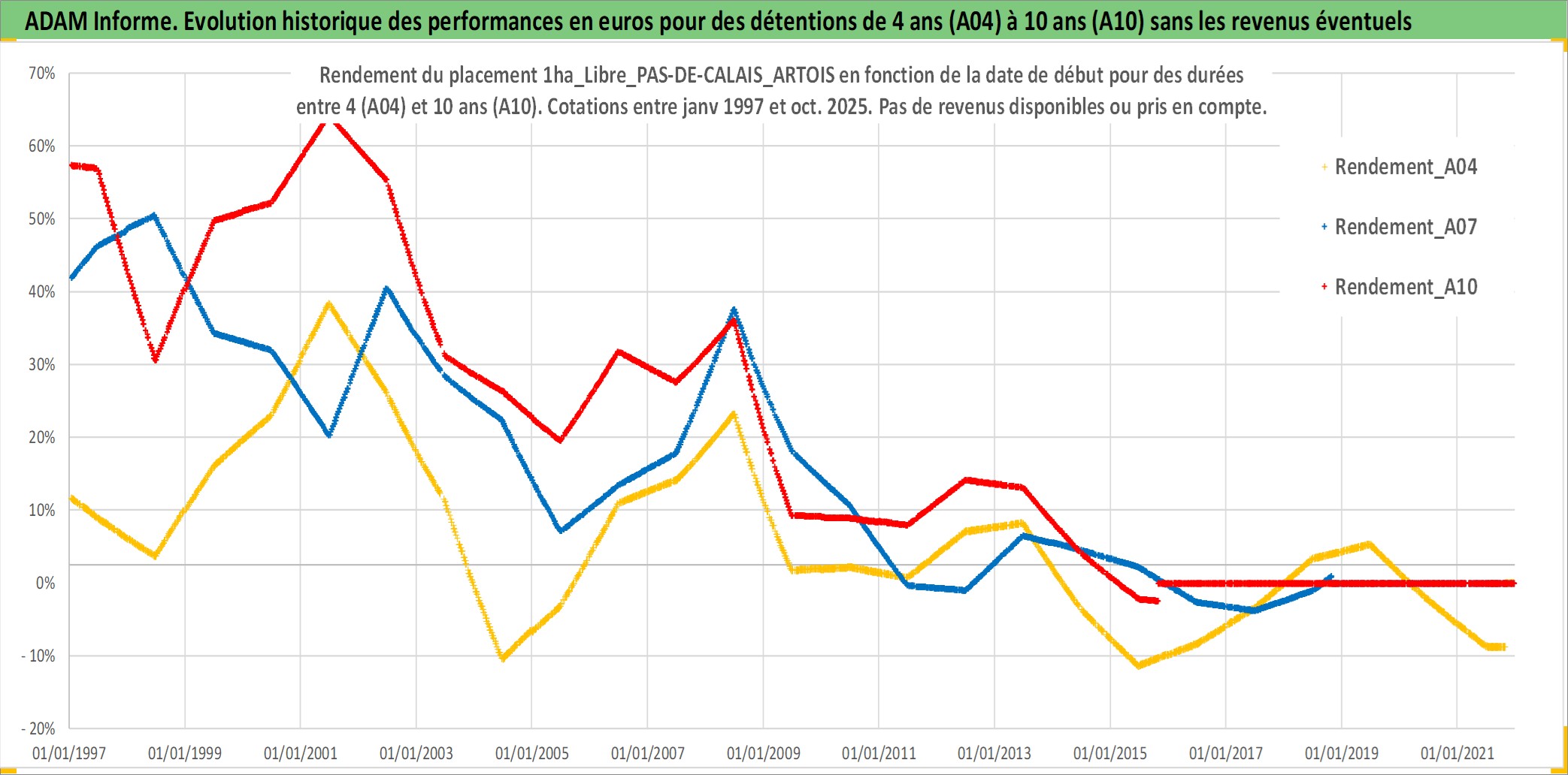 Site dédié aux investisseursPage dédiée sur site financeAnalyse des valorisations hebdomadaires de l'actif 1ha_Libre_PAS-DE-CALAIS_ARTOIS. Cet actif est cote en EUR. Les valorisations couvrent les semaines 1997W01 a 2025W44. Les fermages de ce bien foncier sont pris egaux a 2,5% annuels de la valeur venale du bien.