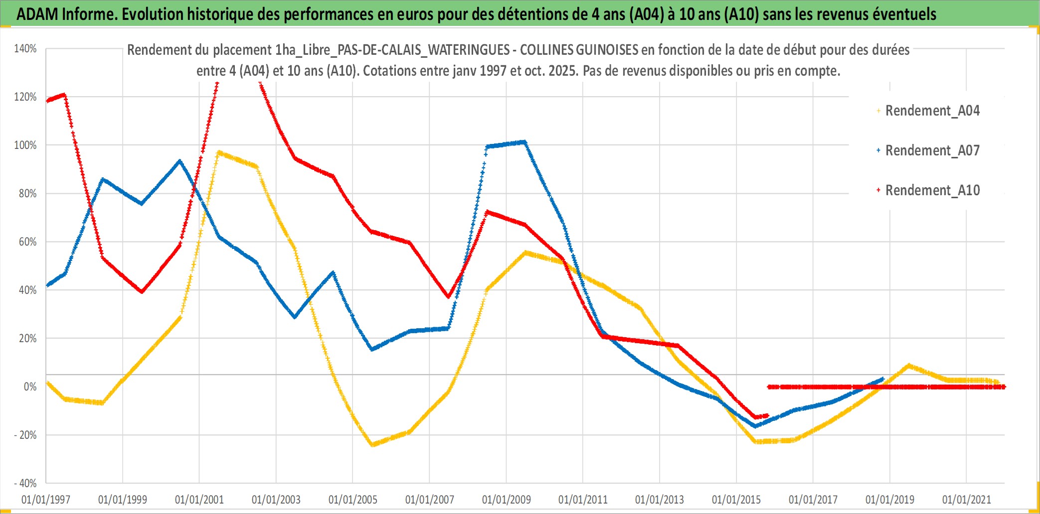 Site dédié aux investisseursPage dédiée sur site financeAnalyse des valorisations hebdomadaires de l'actif 1ha_Libre_PAS-DE-CALAIS_WATERINGUES - COLLINES GUINOISES. Cet actif est cote en EUR. Les valorisations couvrent les semaines 1997W01 a 2025W44. Les fermages de ce bien foncier sont pris egaux a 2,5% annuels de la valeur venale du bien.