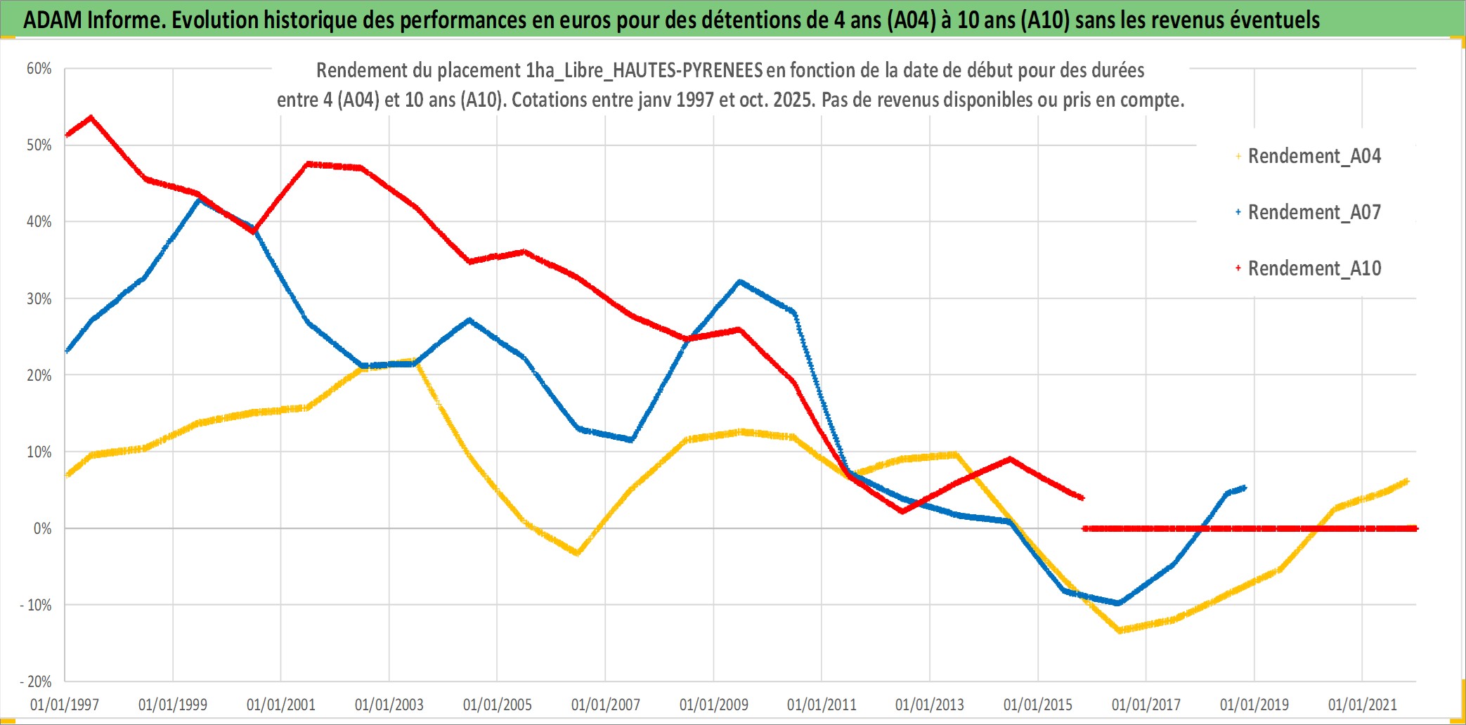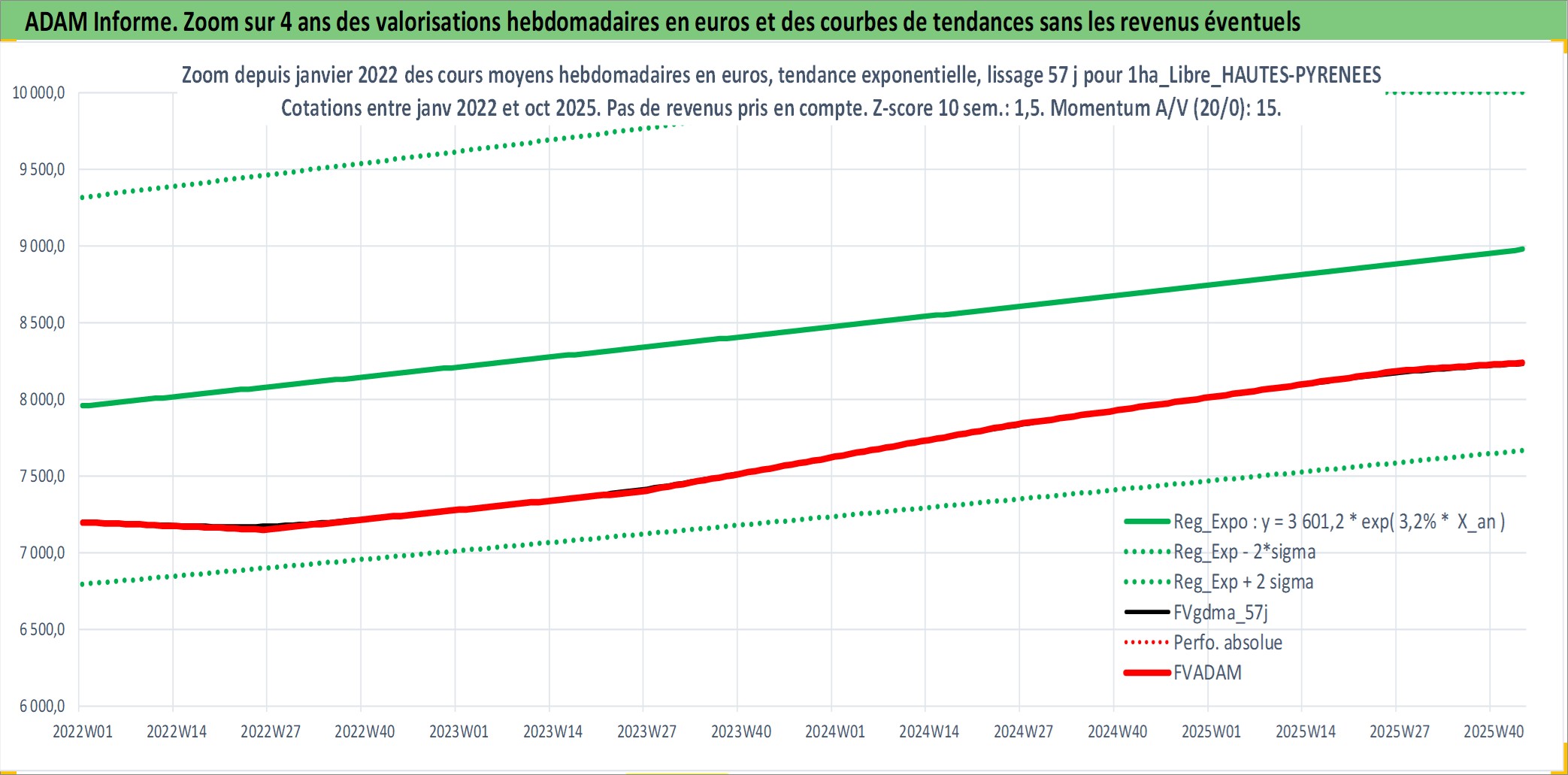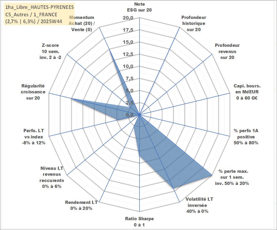 Site dédié aux investisseursPage dédiée sur site financeAnalyse des valorisations hebdomadaires de l'actif 1ha_Libre_HAUTES-PYRENEES. Cet actif est cote en EUR. Les valorisations couvrent les semaines 1997W01 a 2025W44. Les fermages de ce bien foncier sont pris egaux a 2,5% annuels de la valeur venale du bien.