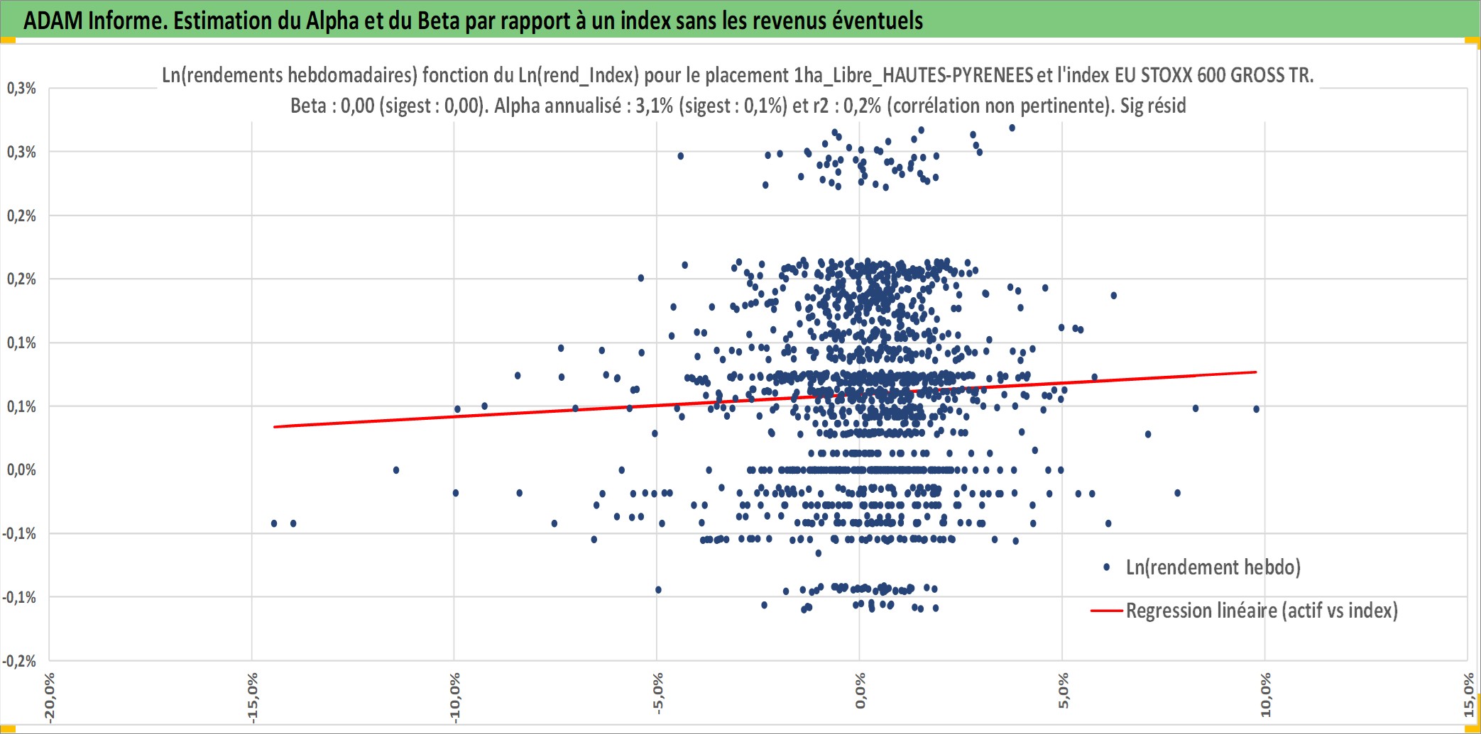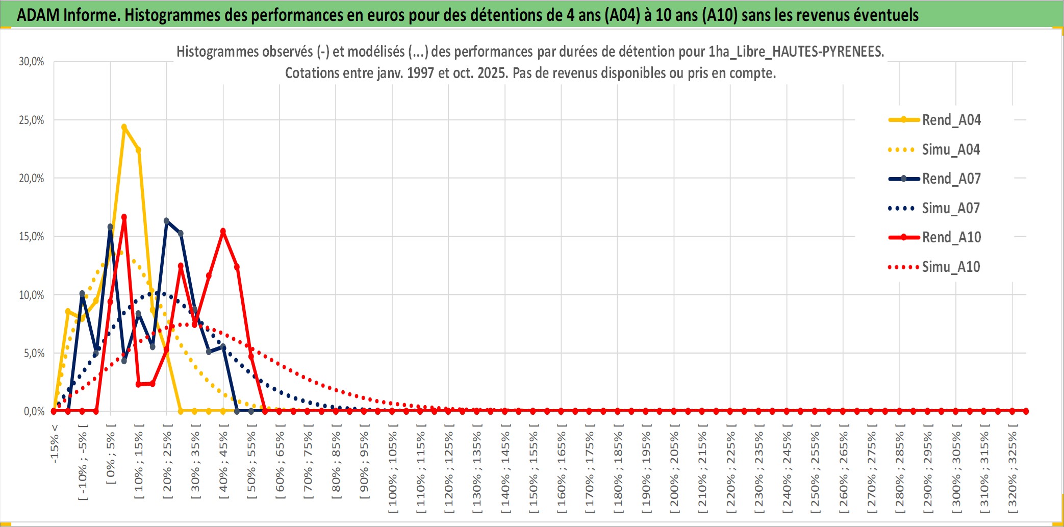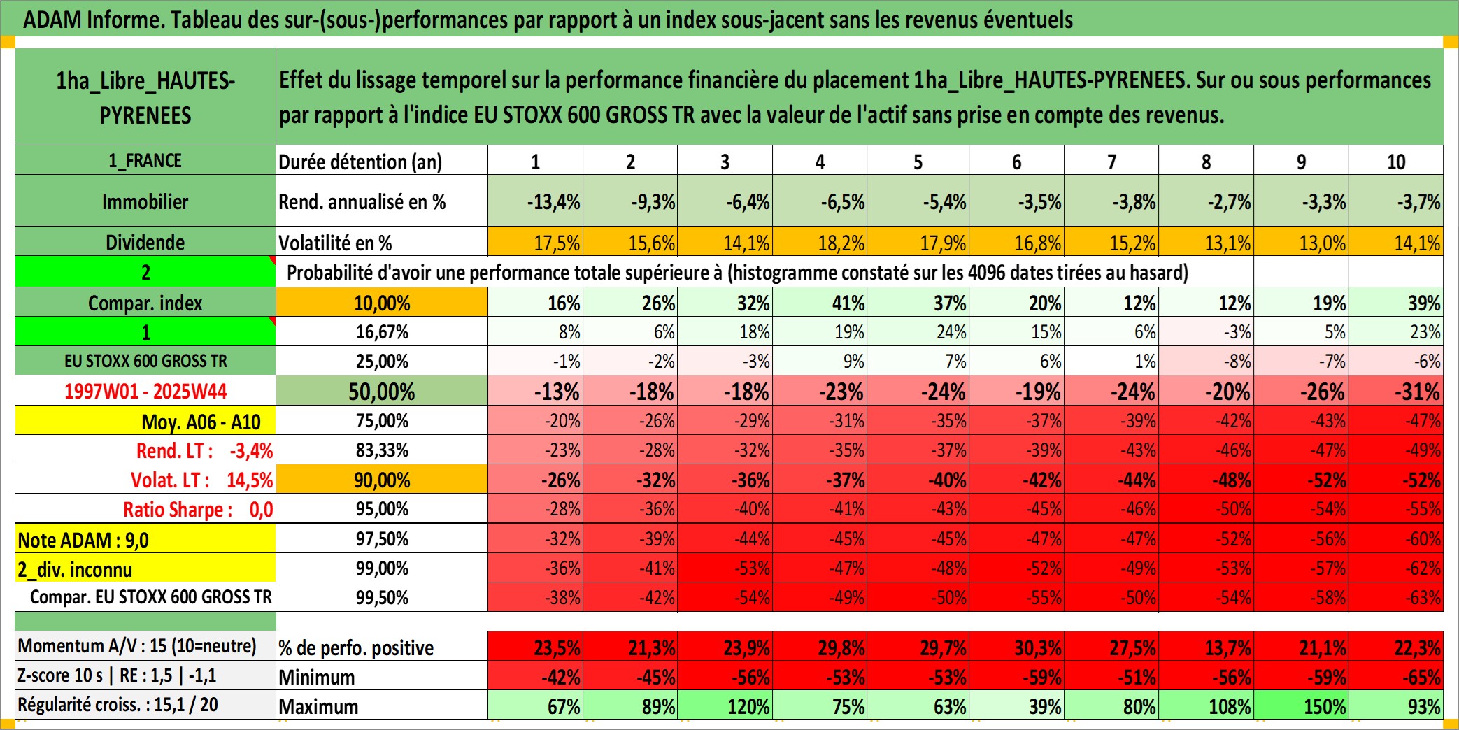 Site dédié aux investisseursPage dédiée sur site financeAnalyse des valorisations hebdomadaires de l'actif 1ha_Libre_HAUTES-PYRENEES. Cet actif est cote en EUR. Les valorisations couvrent les semaines 1997W01 a 2025W44. Les fermages de ce bien foncier sont pris egaux a 2,5% annuels de la valeur venale du bien.
