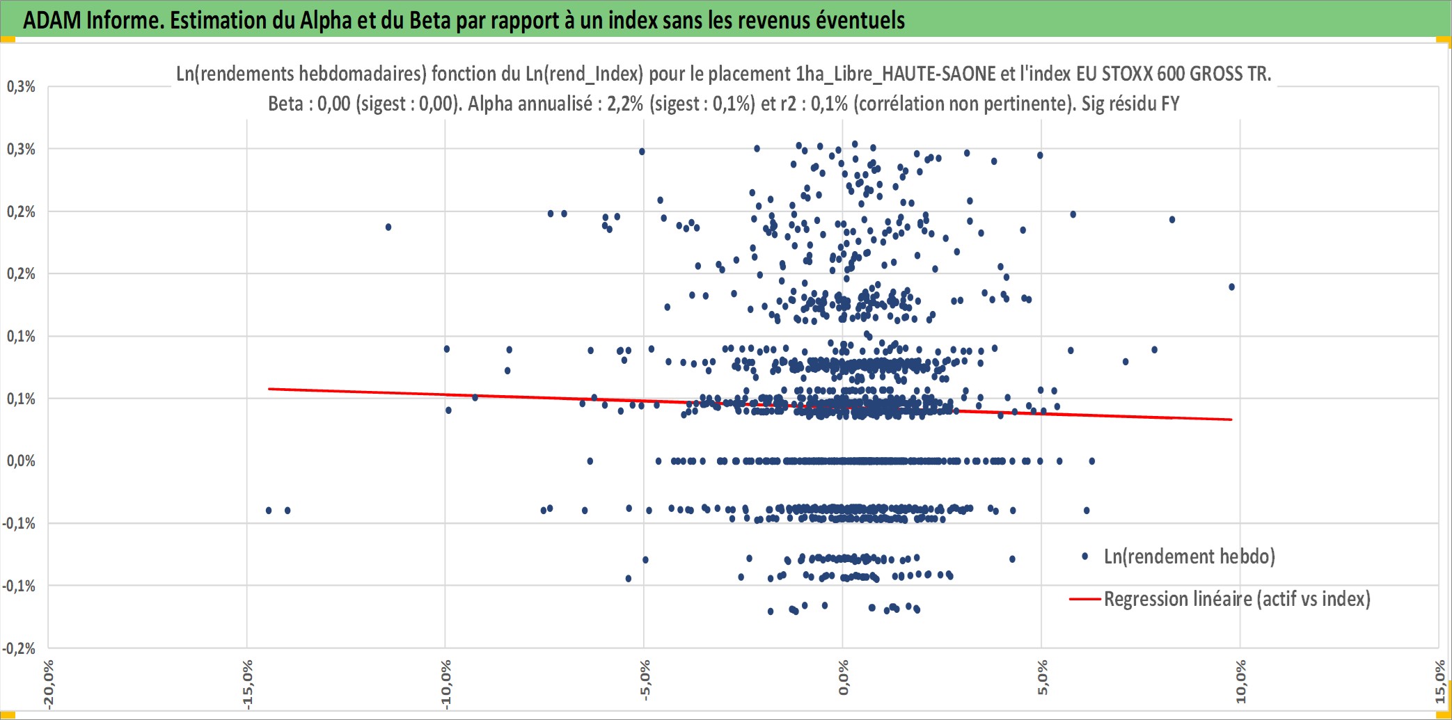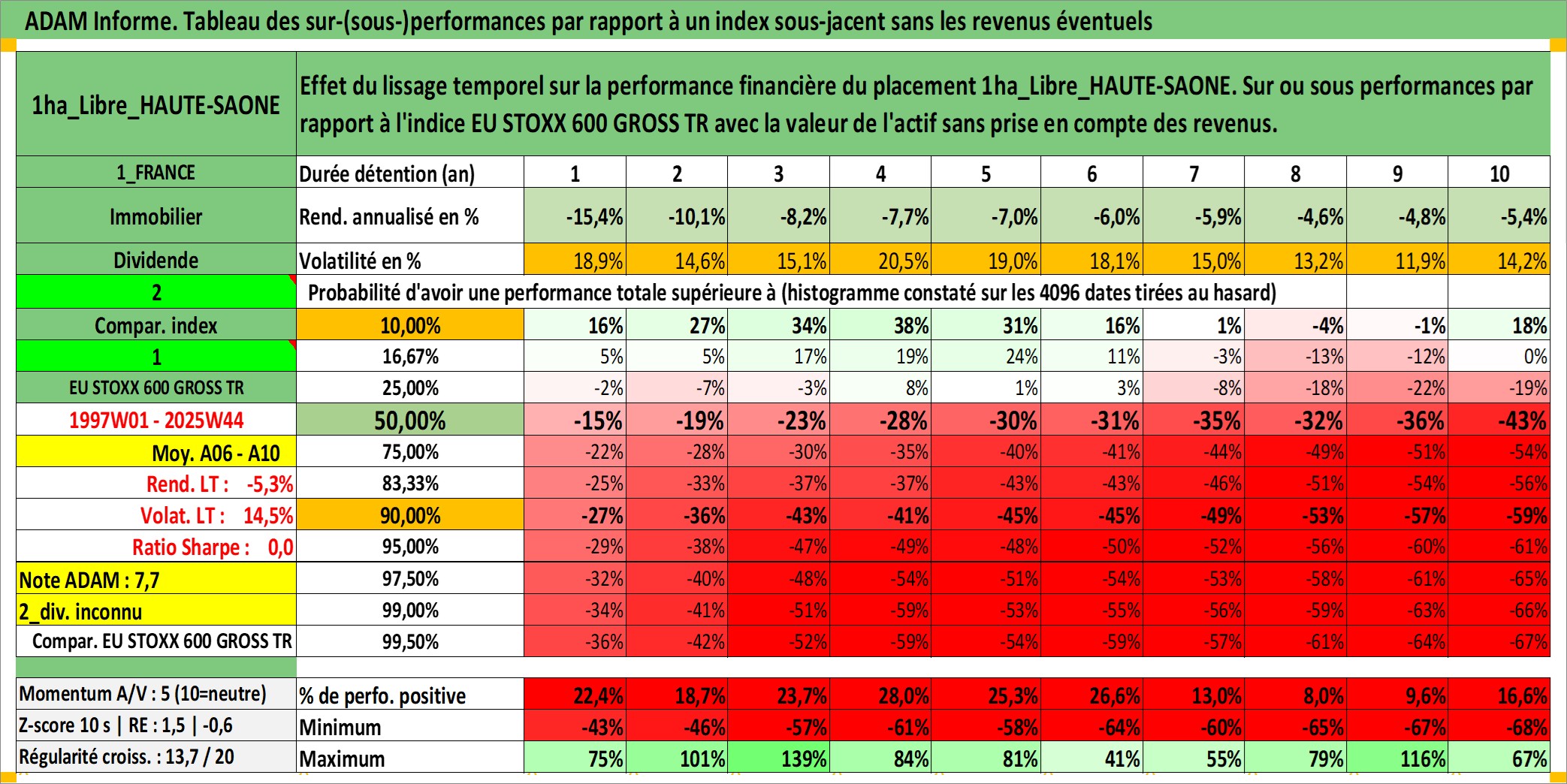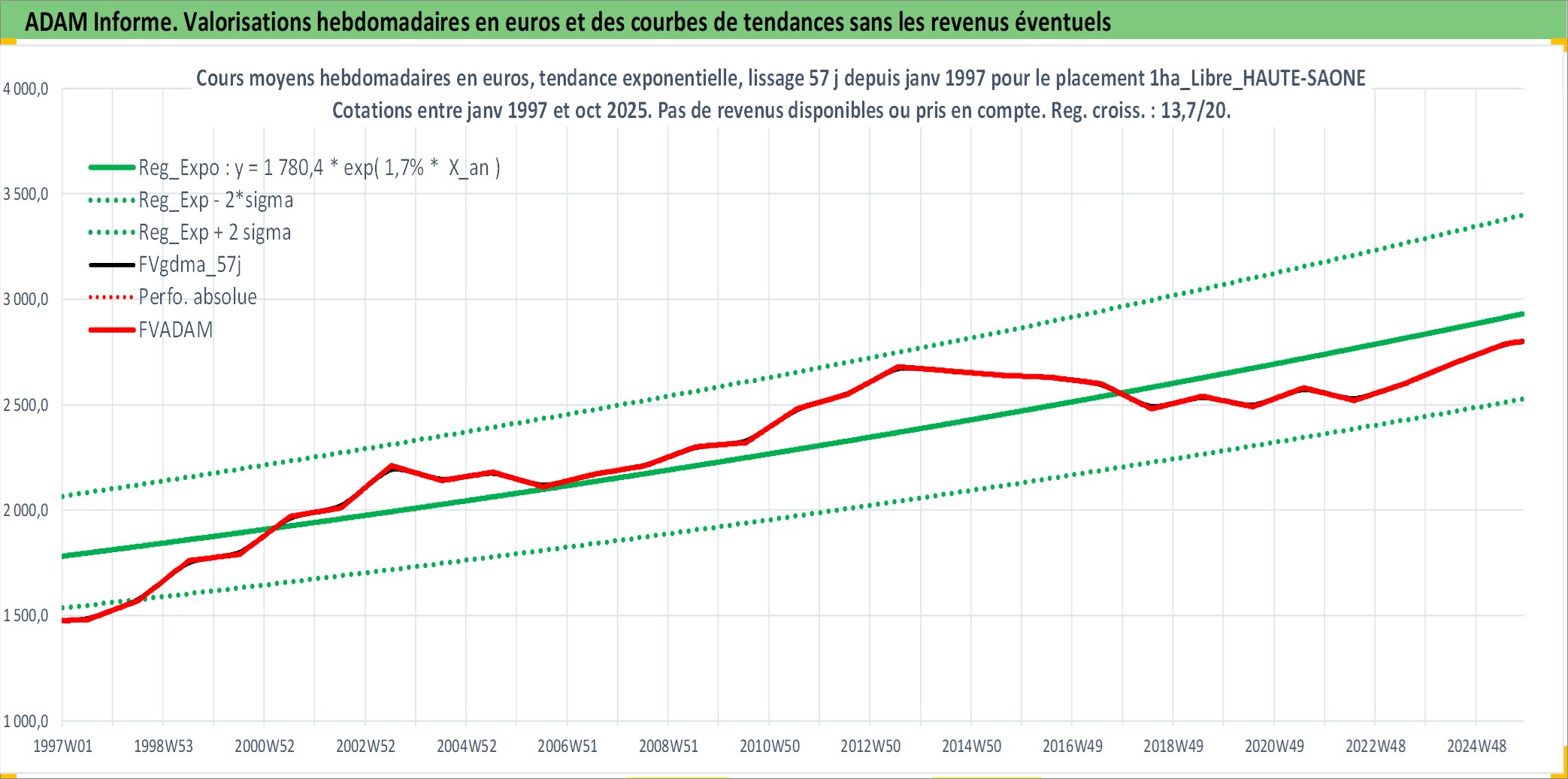Site dédié aux investisseursPage dédiée sur site financeAnalyse des valorisations hebdomadaires de l'actif 1ha_Libre_HAUTE-SAONE. Cet actif est cote en EUR. Les valorisations couvrent les semaines 1997W01 a 2025W44. Les fermages de ce bien foncier sont pris egaux a 2,5% annuels de la valeur venale du bien.