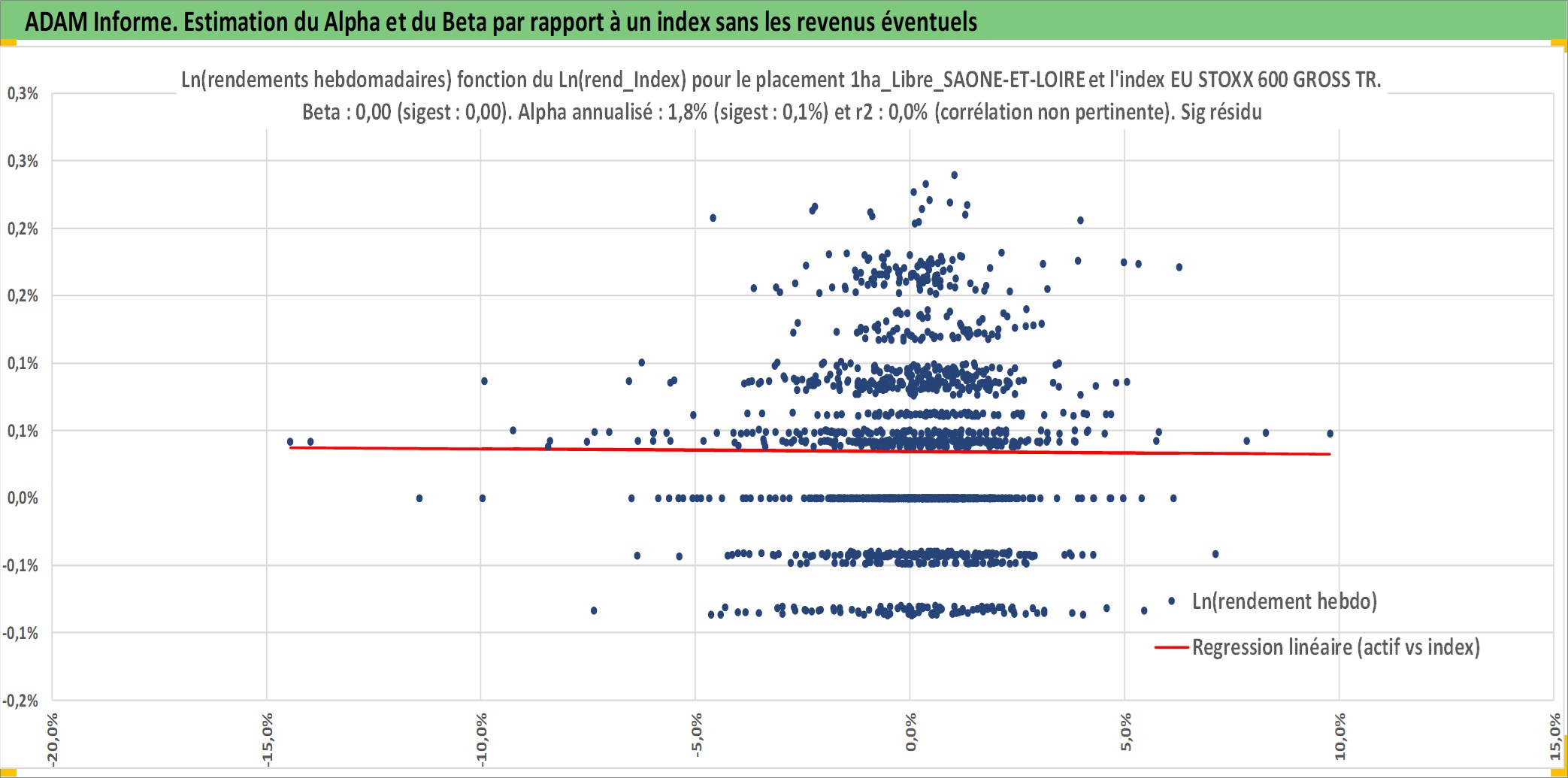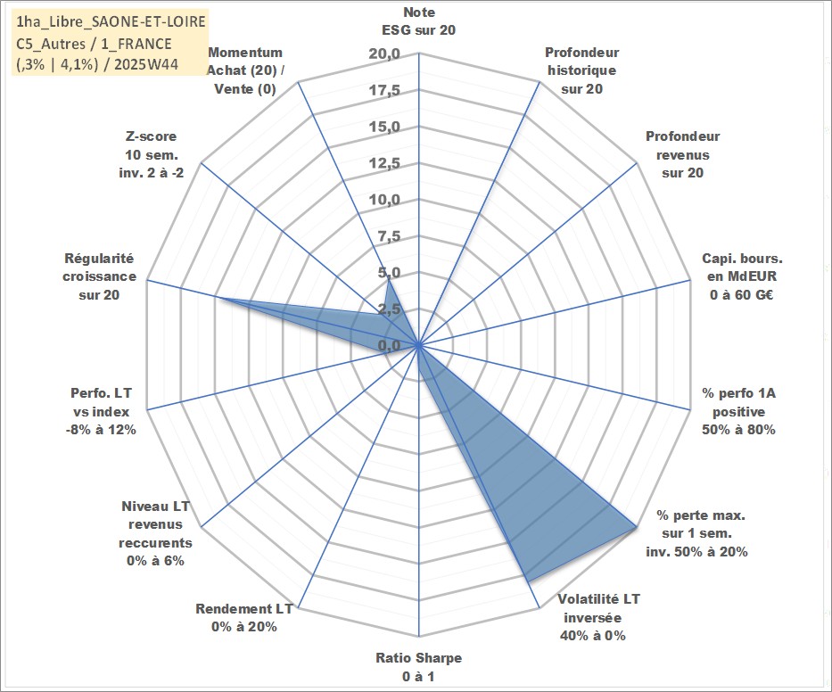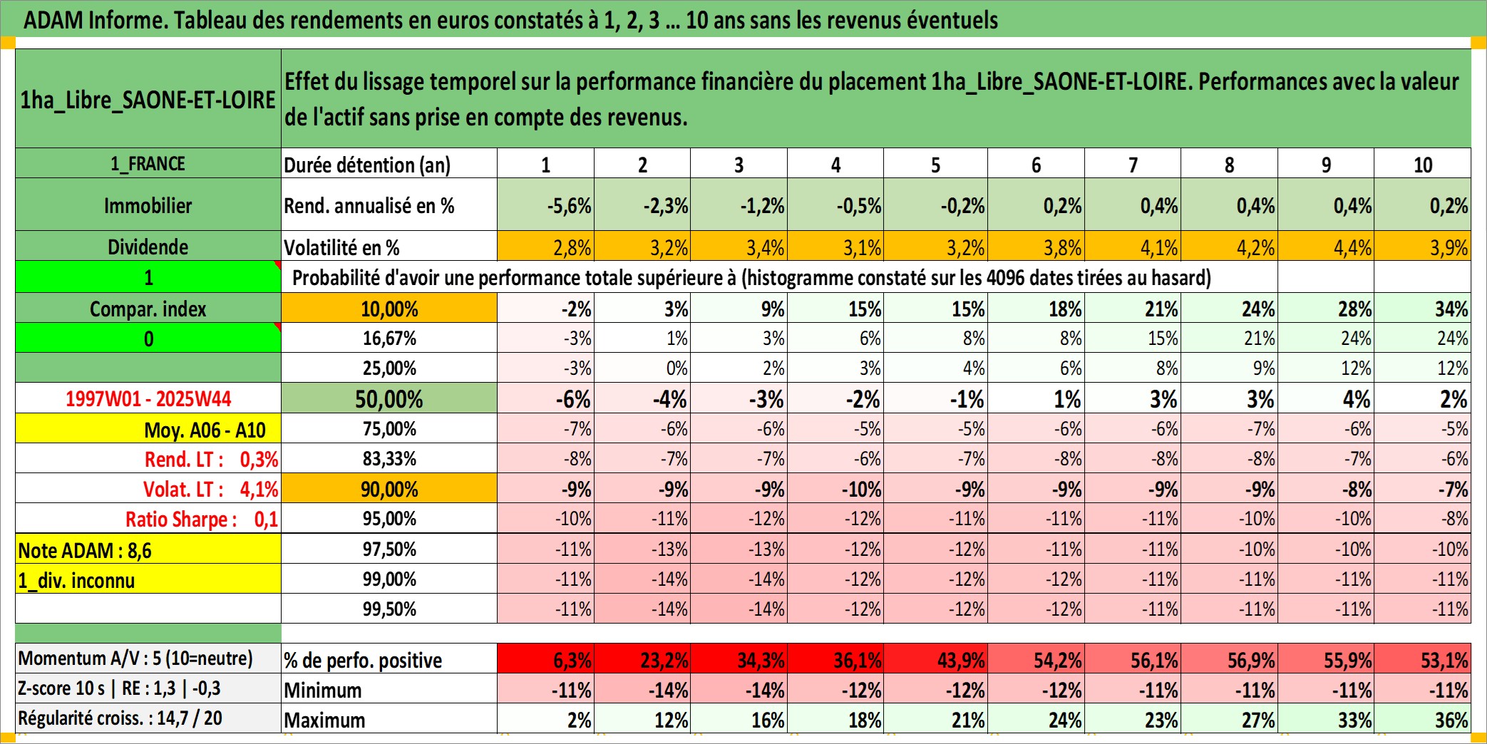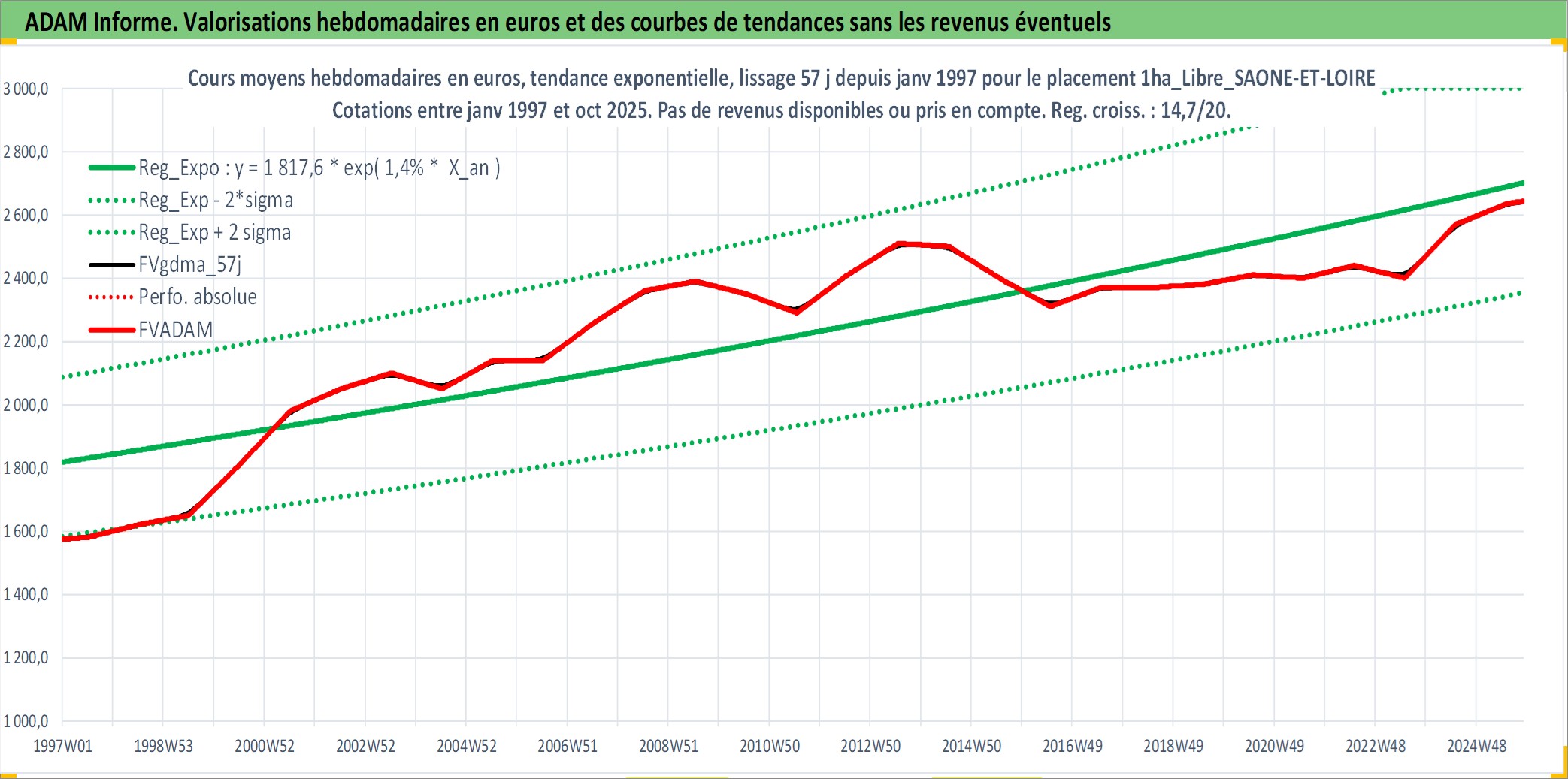 Site dédié aux investisseursPage dédiée sur site financeAnalyse des valorisations hebdomadaires de l'actif 1ha_Libre_SAONE-ET-LOIRE. Cet actif est cote en EUR. Les valorisations couvrent les semaines 1997W01 a 2025W44. Les fermages de ce bien foncier sont pris egaux a 2,5% annuels de la valeur venale du bien.