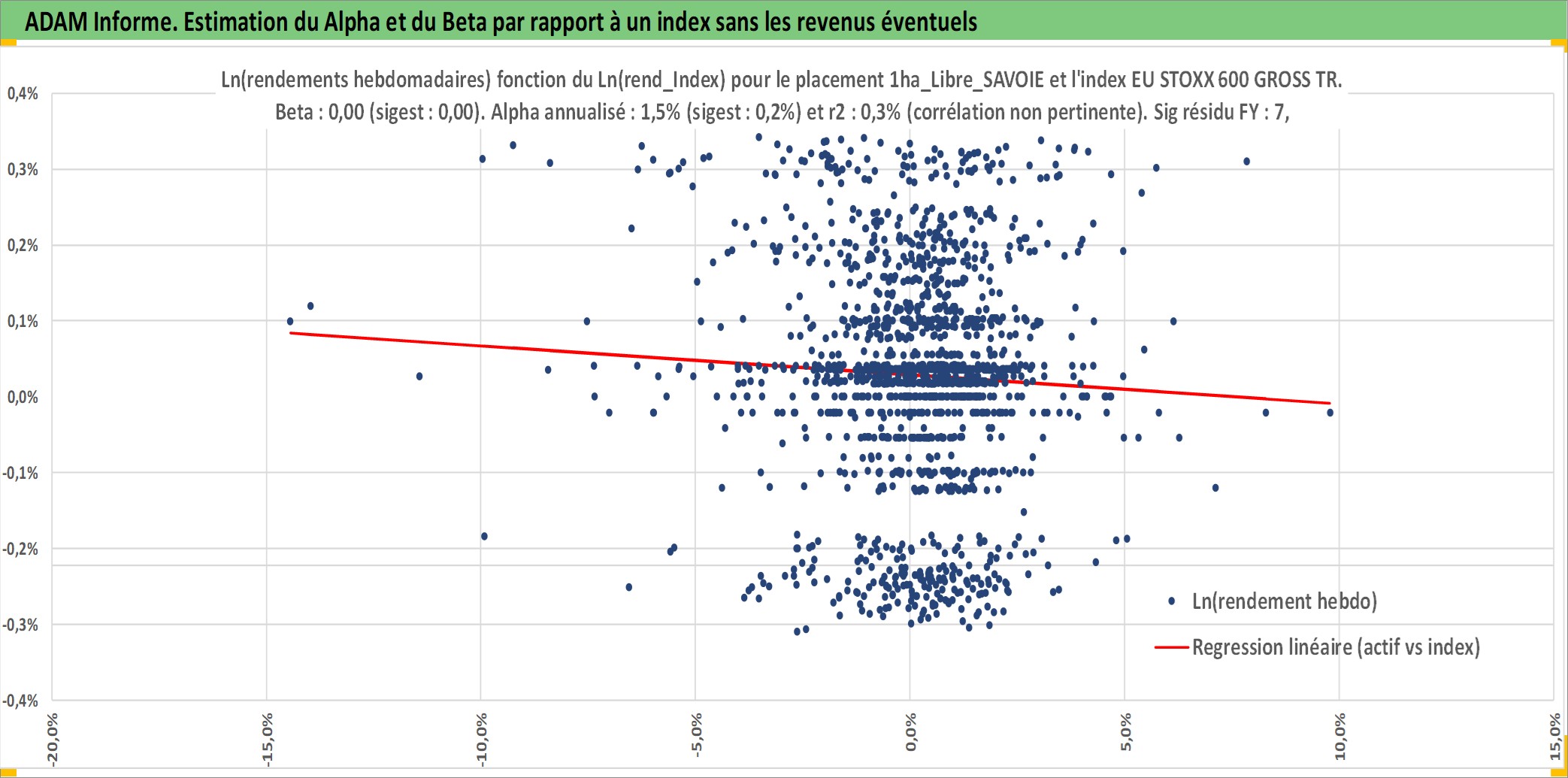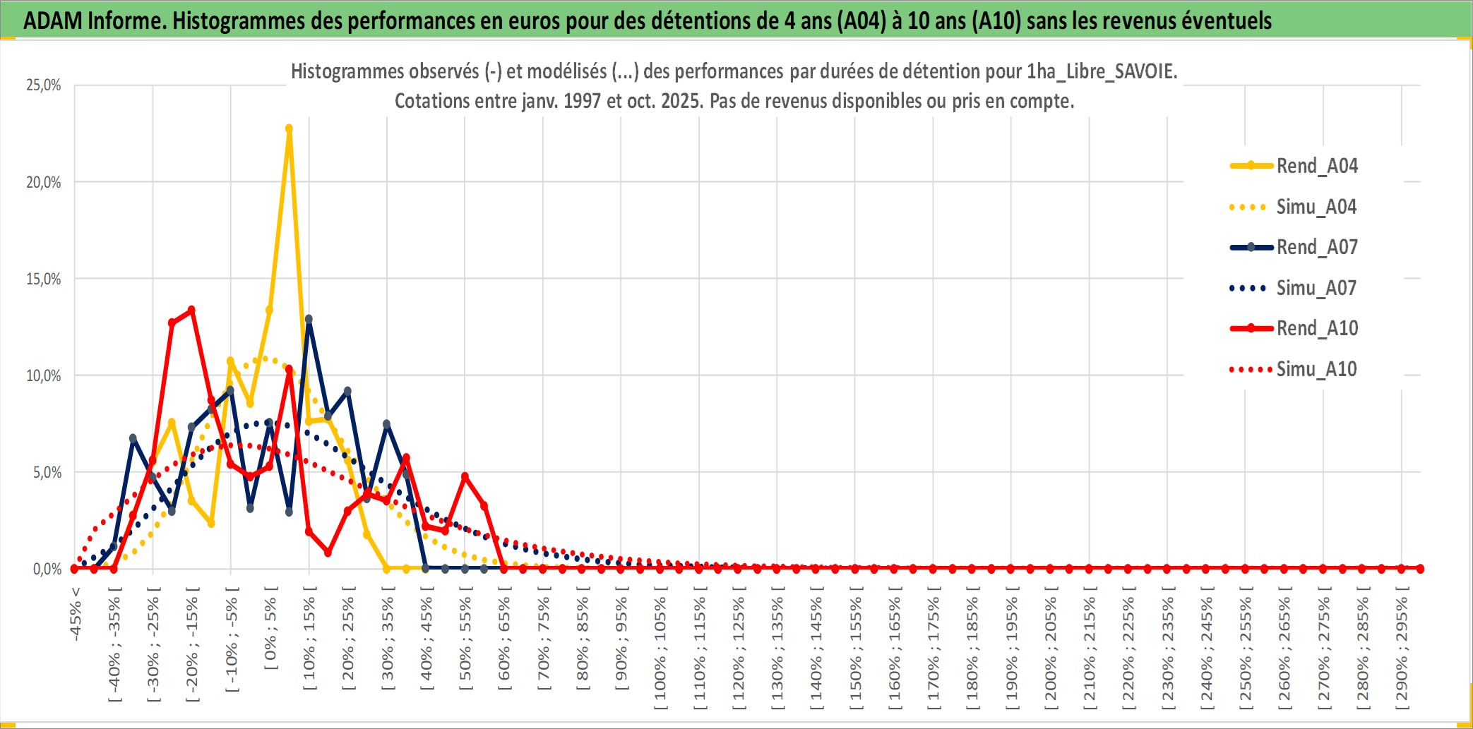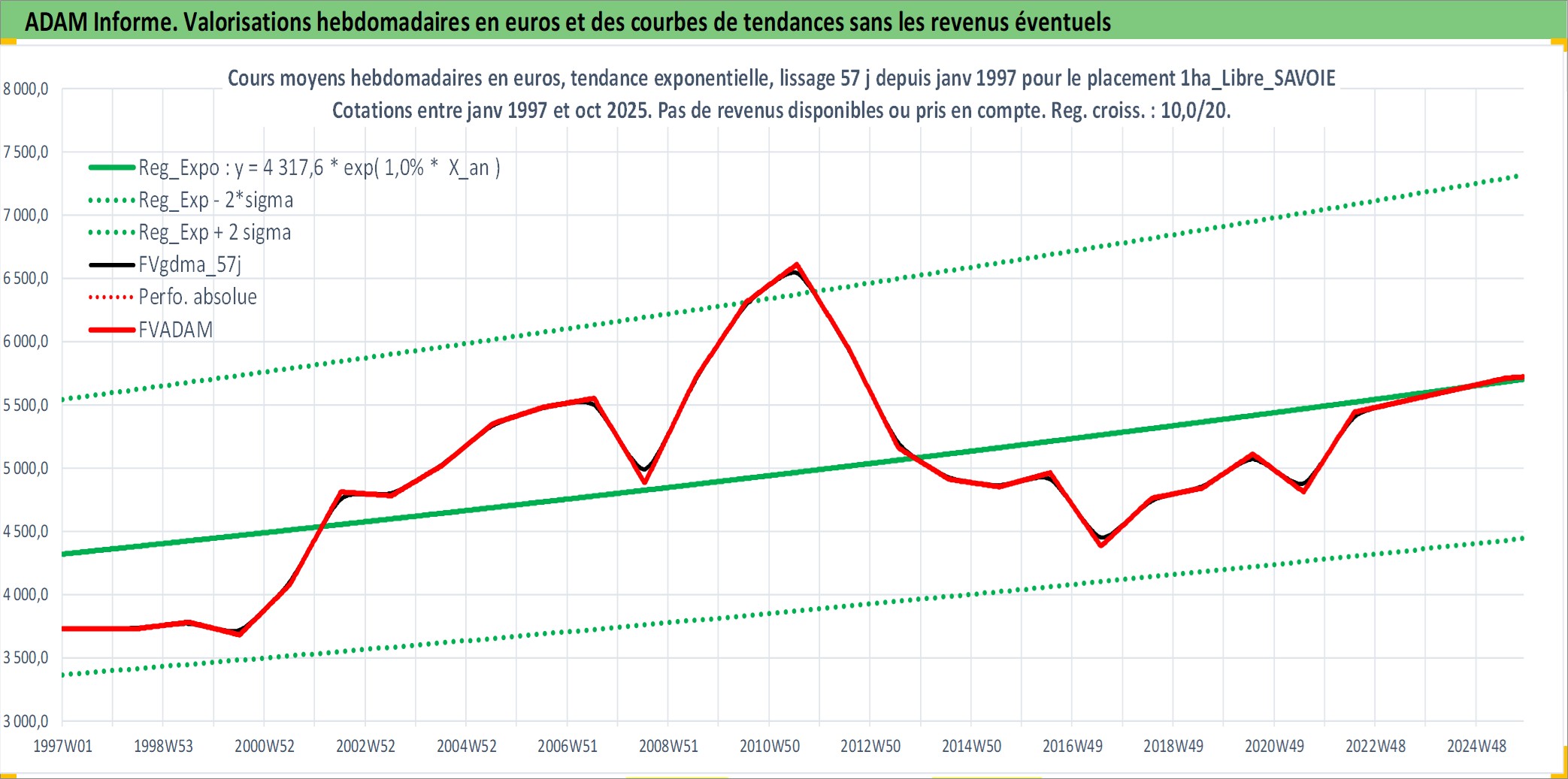 Site dédié aux investisseursPage dédiée sur site financeAnalyse des valorisations hebdomadaires de l'actif 1ha_Libre_SAVOIE. Cet actif est cote en EUR. Les valorisations couvrent les semaines 1997W01 a 2025W44. Les fermages de ce bien foncier sont pris egaux a 2,5% annuels de la valeur venale du bien.