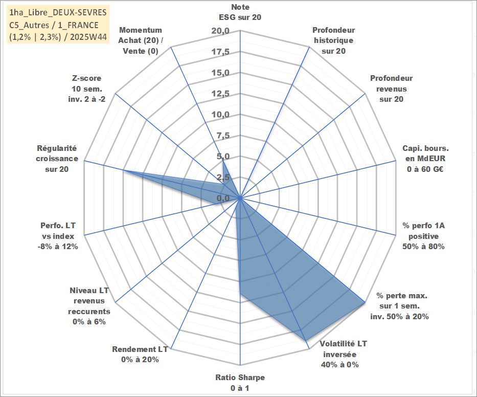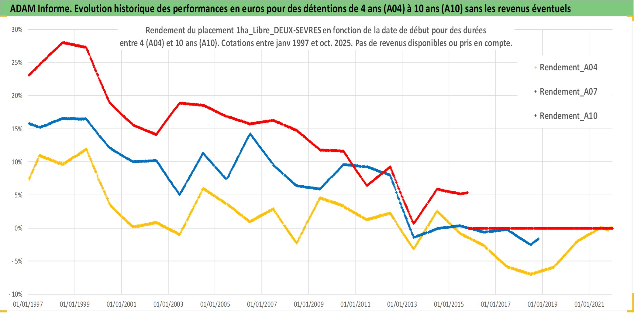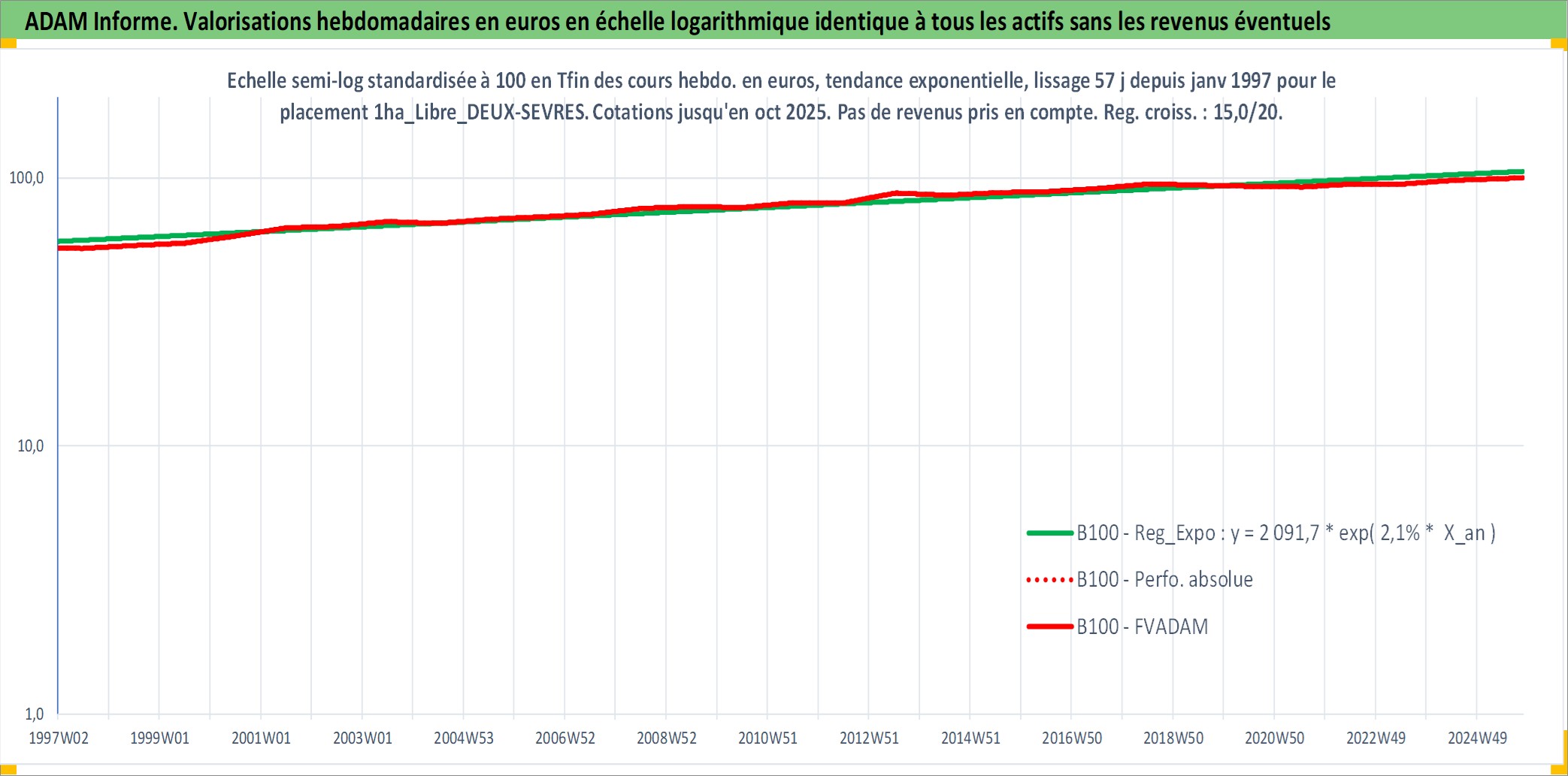 Site dédié aux investisseursPage dédiée sur site financeAnalyse des valorisations hebdomadaires de l'actif 1ha_Libre_DEUX-SEVRES. Cet actif est cote en EUR. Les valorisations couvrent les semaines 1997W01 a 2025W44. Les fermages de ce bien foncier sont pris egaux a 2,5% annuels de la valeur venale du bien.