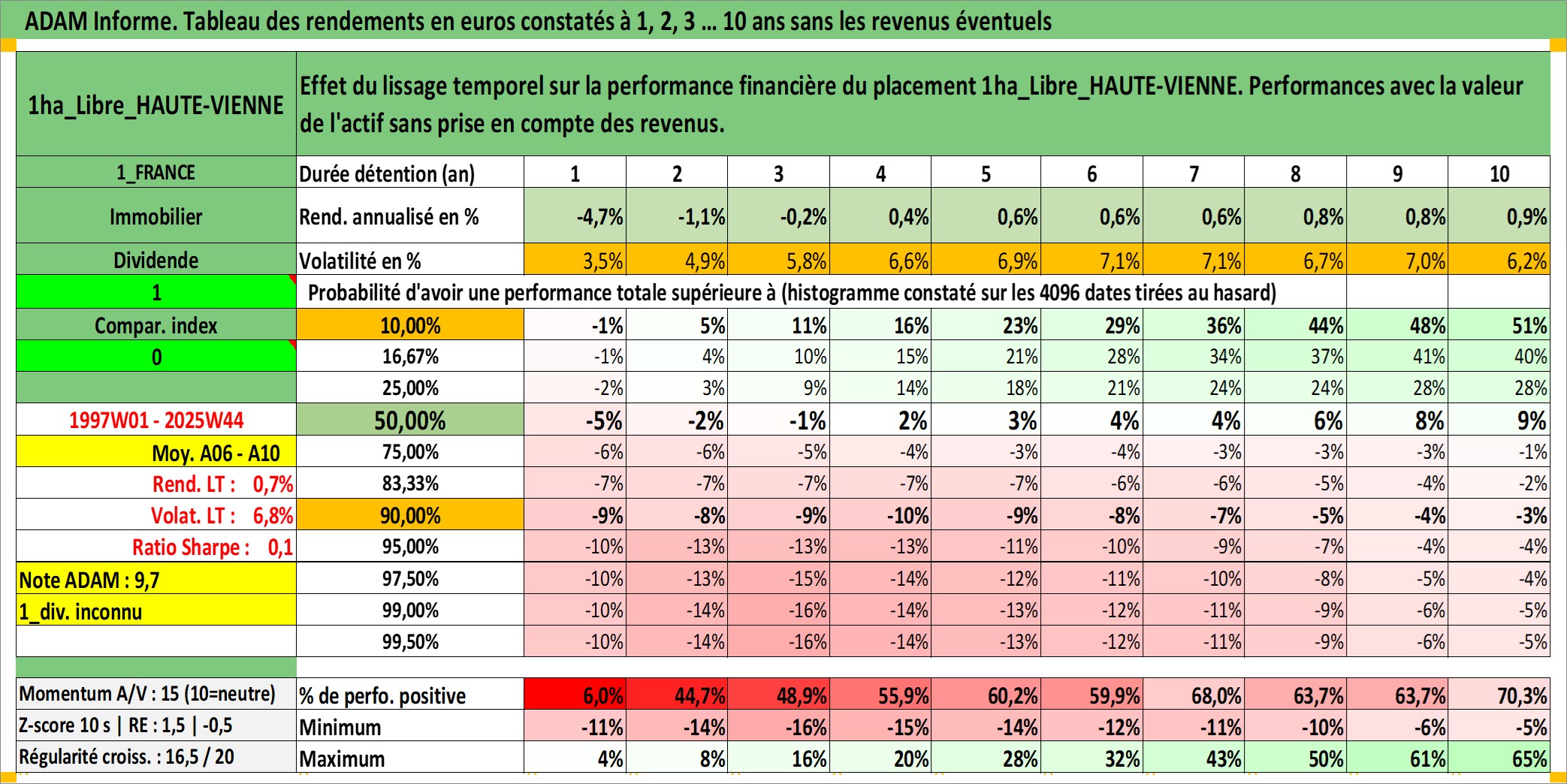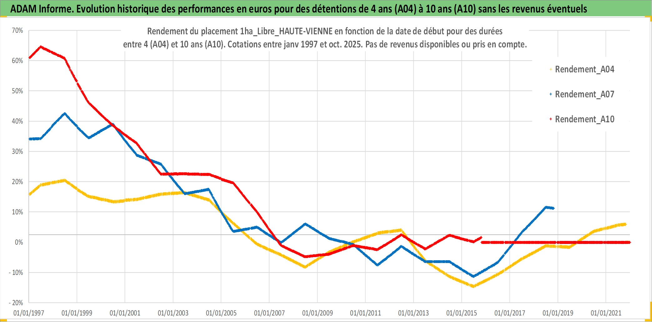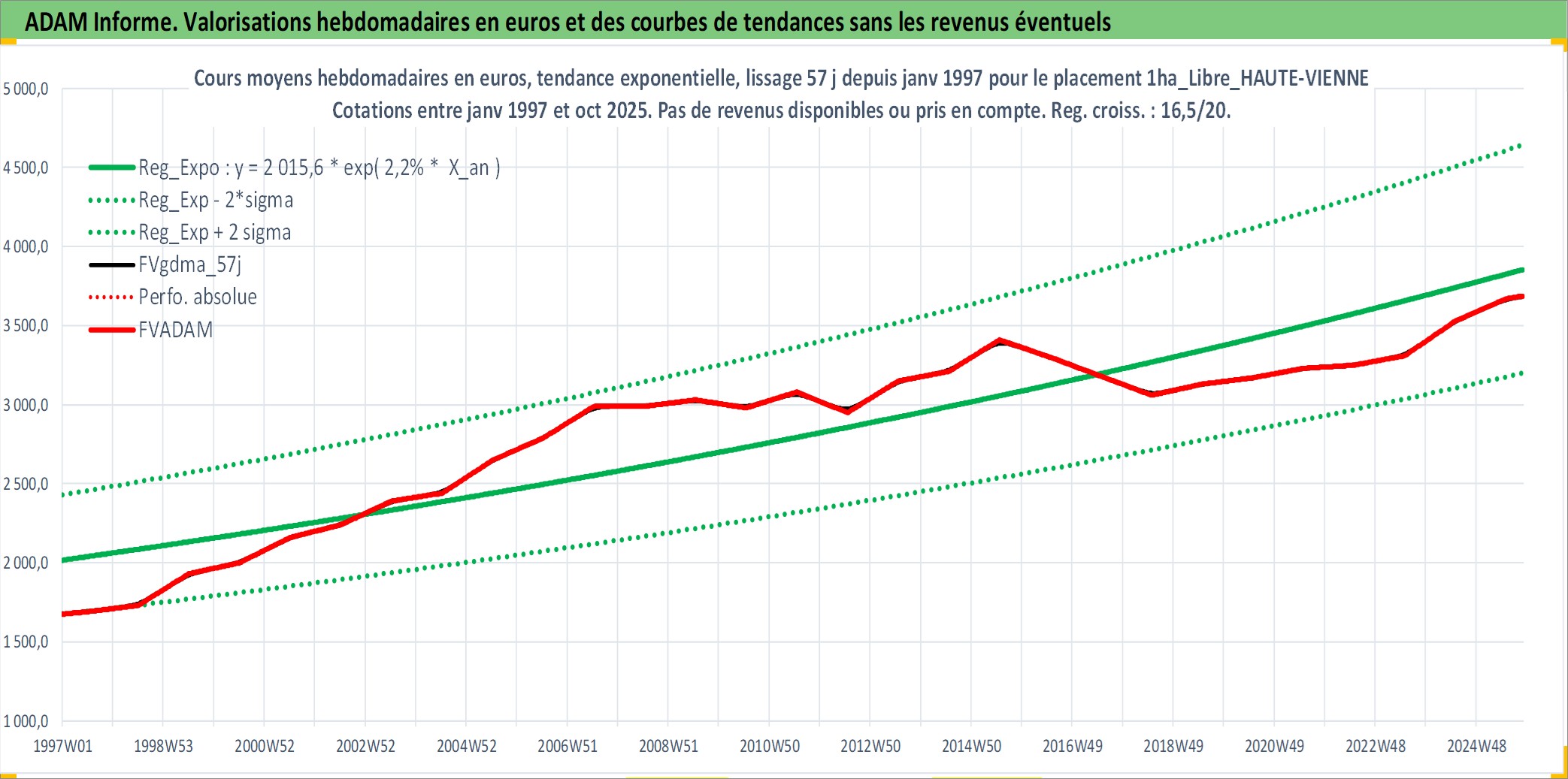Site dédié aux investisseursPage dédiée sur site financeAnalyse des valorisations hebdomadaires de l'actif 1ha_Libre_HAUTE-VIENNE. Cet actif est cote en EUR. Les valorisations couvrent les semaines 1997W01 a 2025W44. Les fermages de ce bien foncier sont pris egaux a 2,5% annuels de la valeur venale du bien.