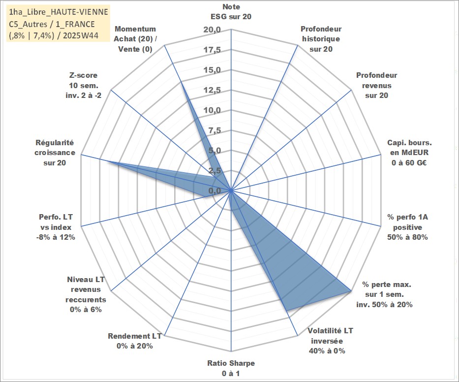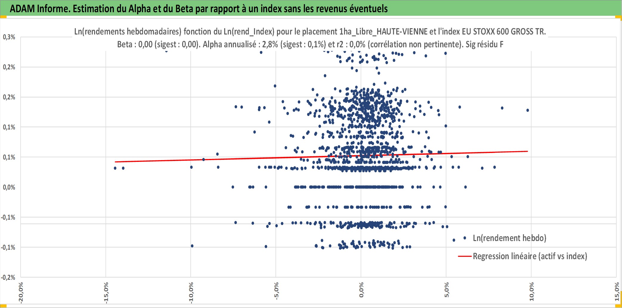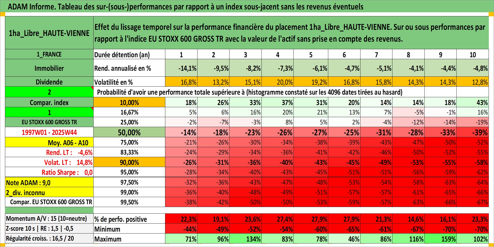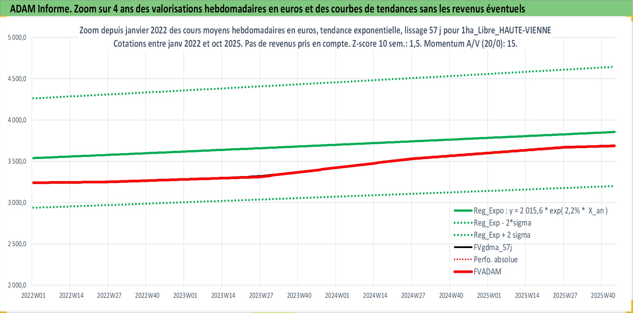 Site dédié aux investisseursPage dédiée sur site financeAnalyse des valorisations hebdomadaires de l'actif 1ha_Libre_HAUTE-VIENNE. Cet actif est cote en EUR. Les valorisations couvrent les semaines 1997W01 a 2025W44. Les fermages de ce bien foncier sont pris egaux a 2,5% annuels de la valeur venale du bien.