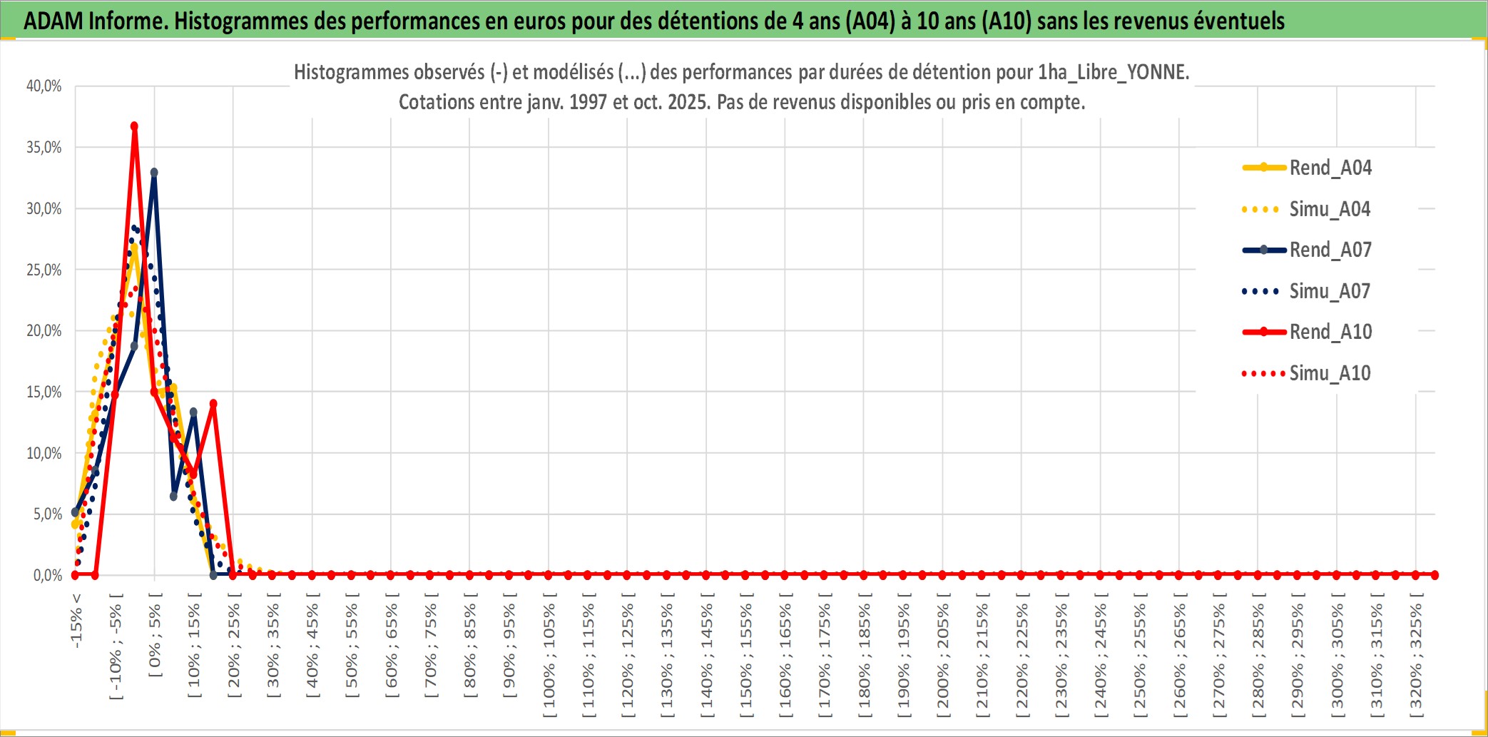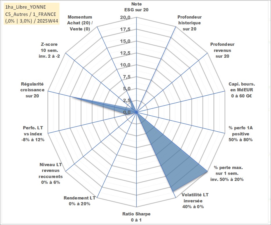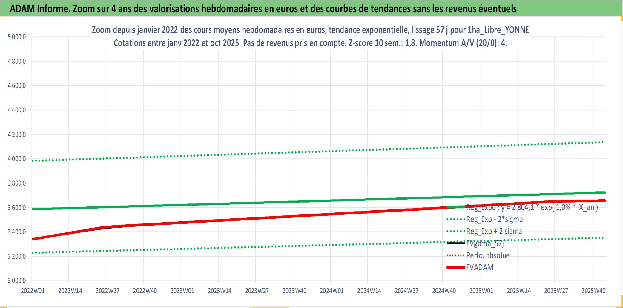 Site dédié aux investisseursPage dédiée sur site financeAnalyse des valorisations hebdomadaires de l'actif 1ha_Libre_YONNE. Cet actif est cote en EUR. Les valorisations couvrent les semaines 1997W01 a 2025W44. Les fermages de ce bien foncier sont pris egaux a 2,5% annuels de la valeur venale du bien.