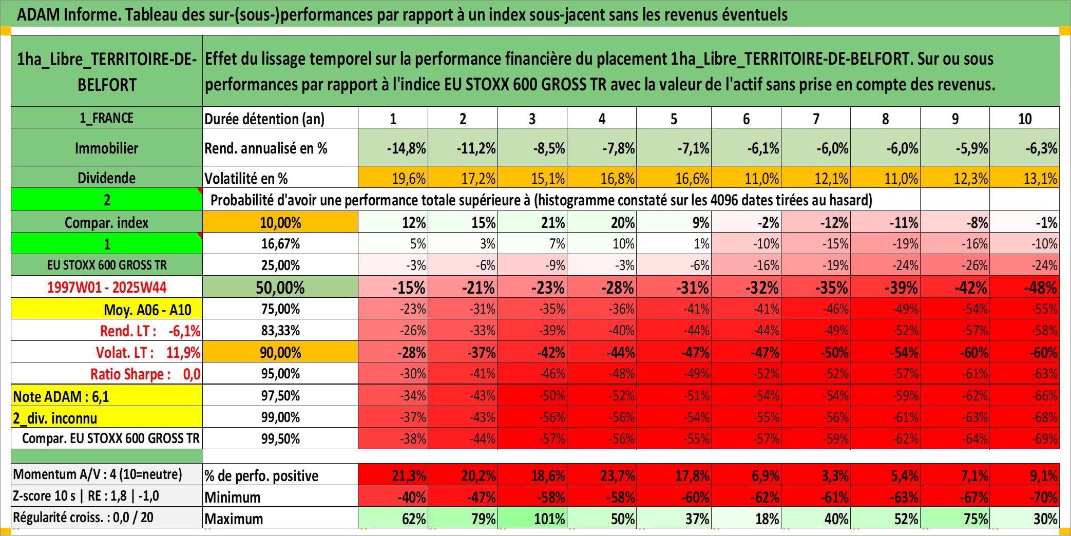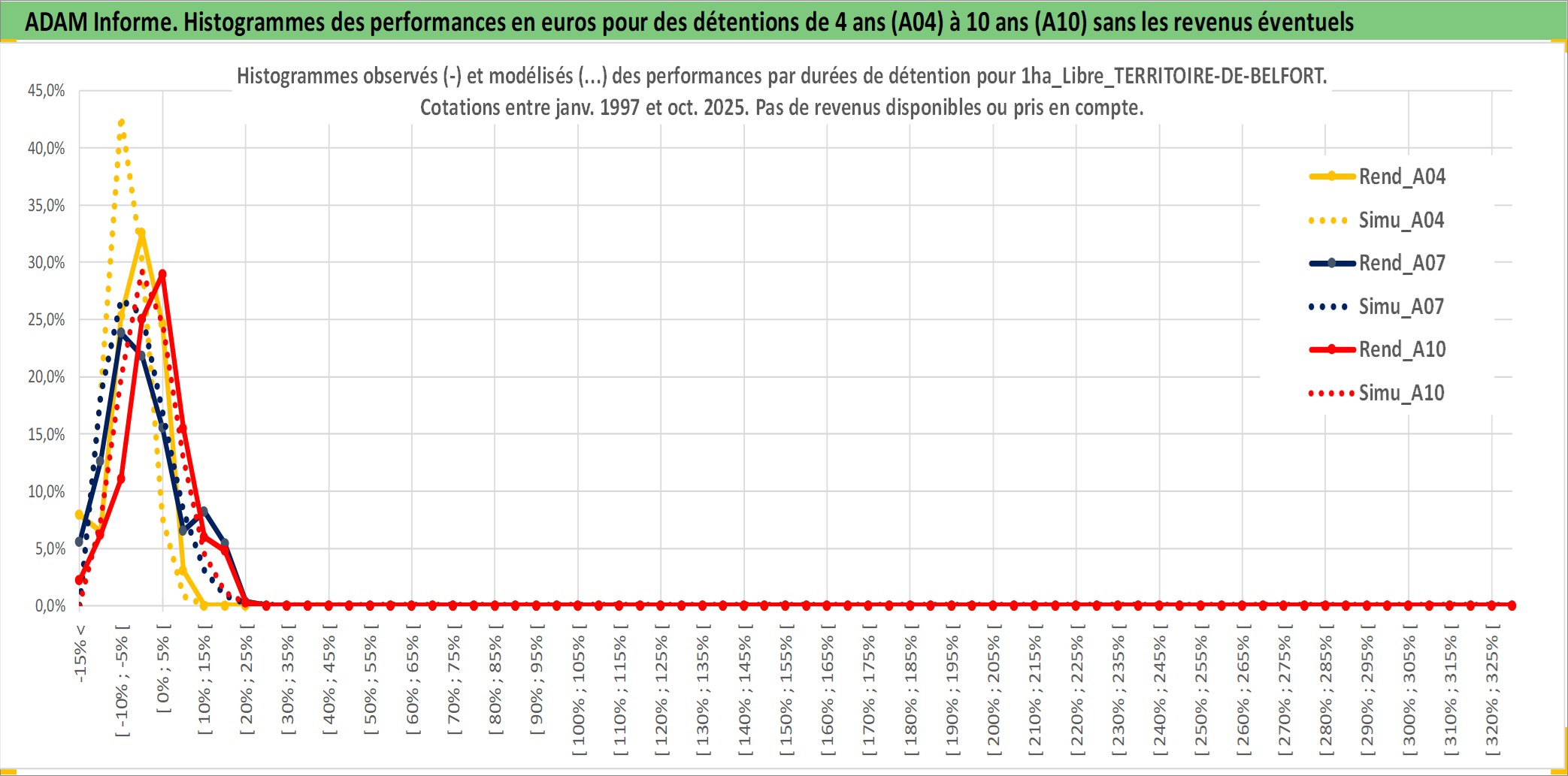 Site dédié aux investisseursPage dédiée sur site financeAnalyse des valorisations hebdomadaires de l'actif 1ha_Libre_TERRITOIRE-DE-BELFORT. Cet actif est cote en EUR. Les valorisations couvrent les semaines 1997W01 a 2025W44. Les fermages de ce bien foncier sont pris egaux a 2,5% annuels de la valeur venale du bien.