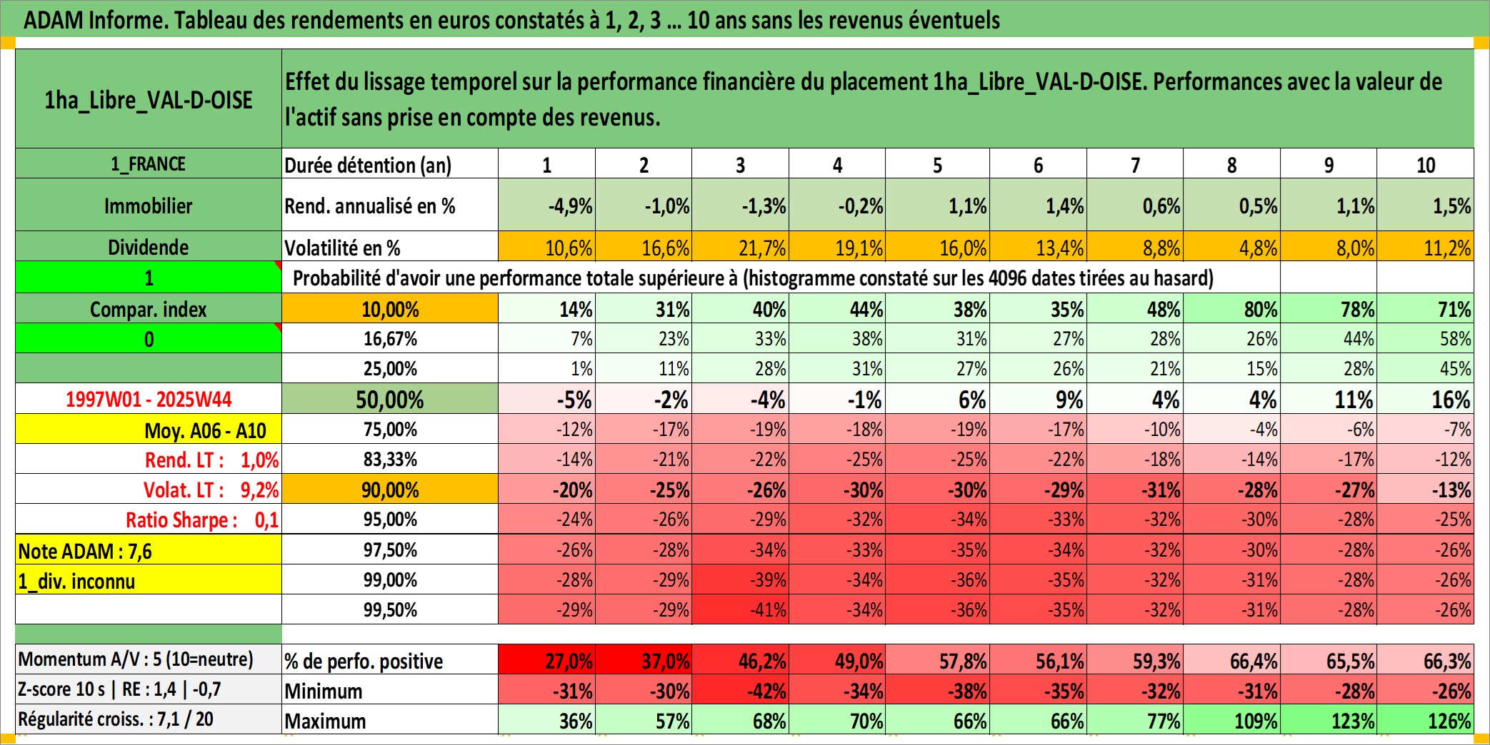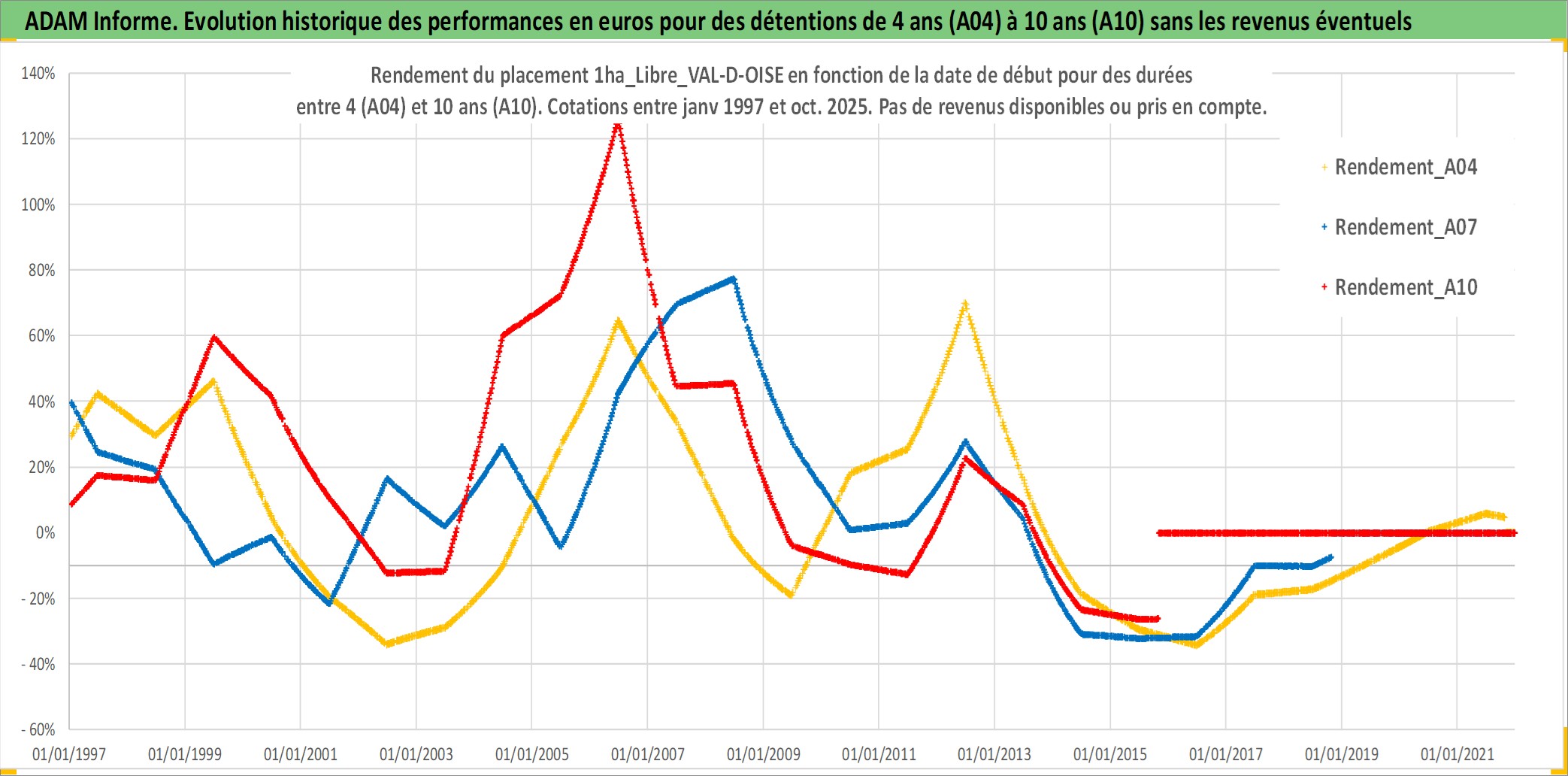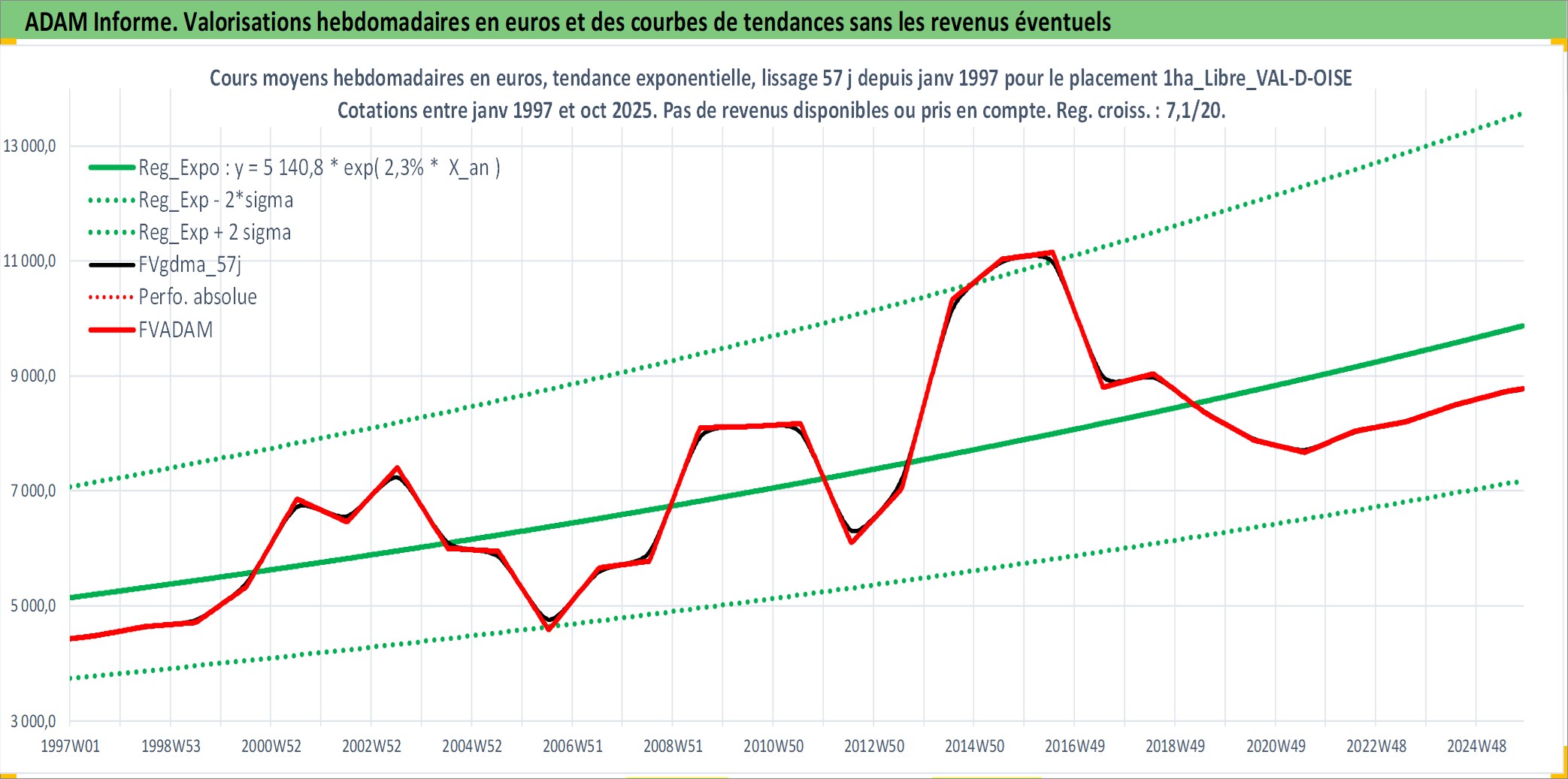 Site dédié aux investisseursPage dédiée sur site financeAnalyse des valorisations hebdomadaires de l'actif 1ha_Libre_VAL-D-OISE. Cet actif est cote en EUR. Les valorisations couvrent les semaines 1997W01 a 2025W44. Les fermages de ce bien foncier sont pris egaux a 2,5% annuels de la valeur venale du bien.