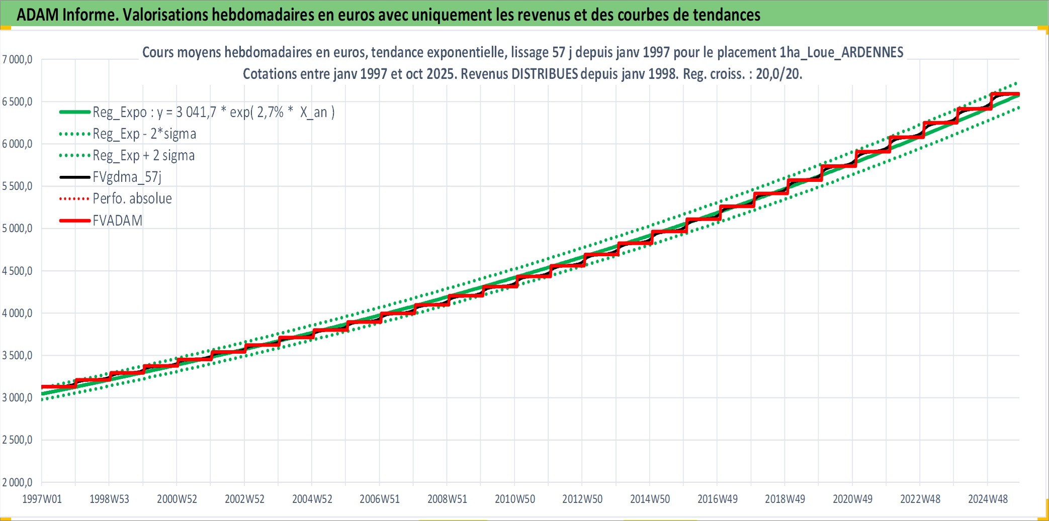 Site dédié aux investisseursPage dédiée sur site financeAnalyse des valorisations hebdomadaires de l'actif 1ha_Loue_ARDENNES. Cet actif est cote en EUR. Les valorisations couvrent les semaines 1997W01 a 2025W44. Les fermages de ce bien foncier sont pris egaux a 2,5% annuels de la valeur venale du bien.