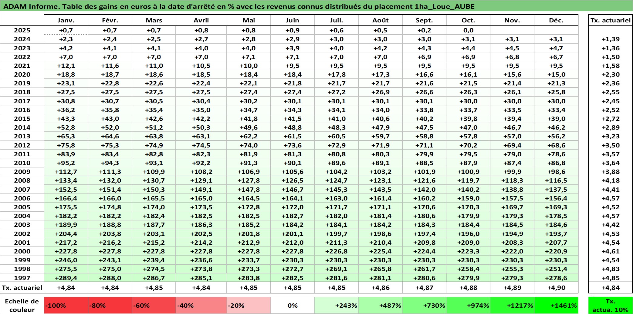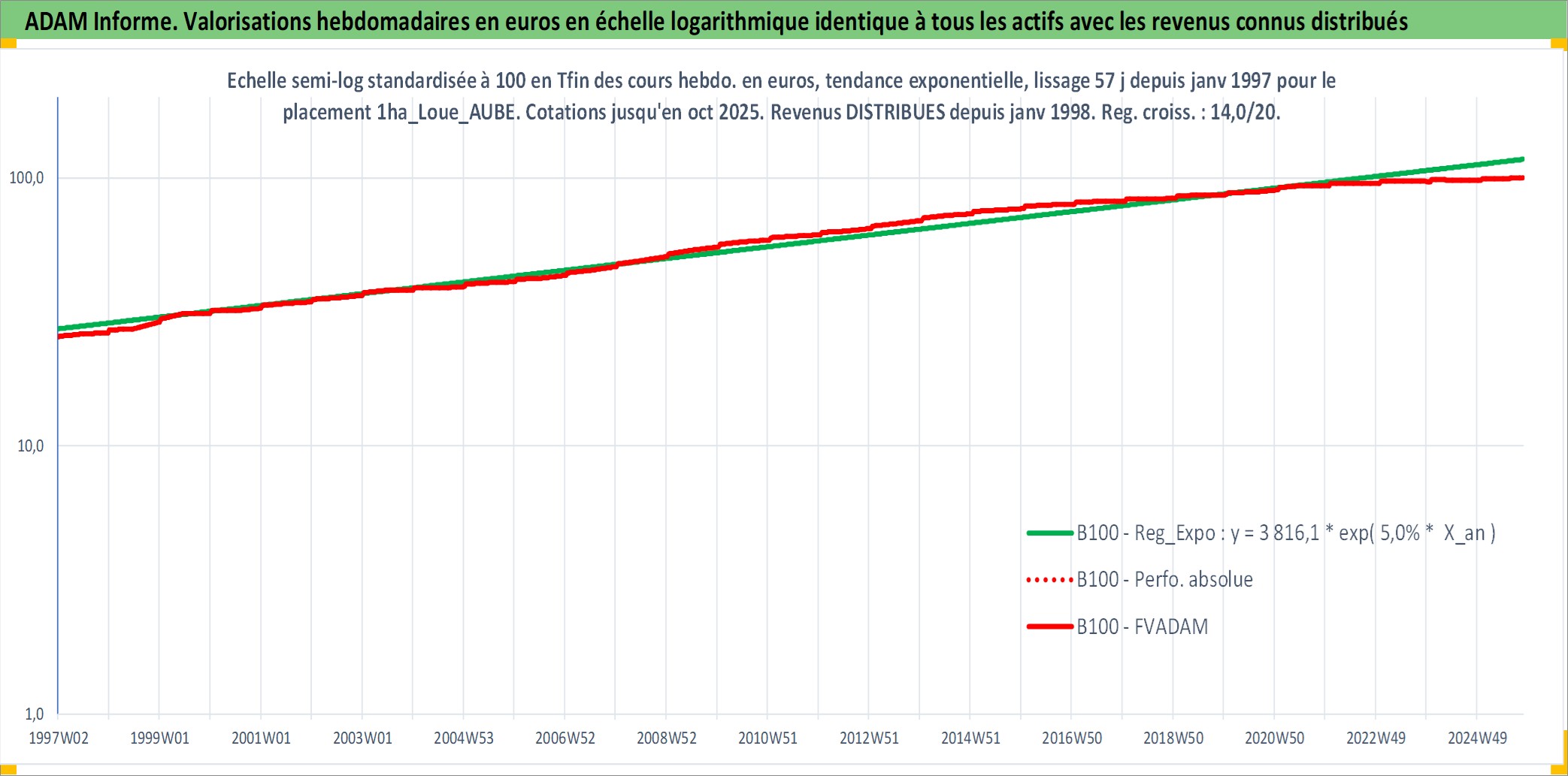Site dédié aux investisseursPage dédiée sur site financeAnalyse des valorisations hebdomadaires de l'actif 1ha_Loue_AUBE. Cet actif est cote en EUR. Les valorisations couvrent les semaines 1997W01 a 2025W44. Les fermages de ce bien foncier sont pris egaux a 2,5% annuels de la valeur venale du bien.