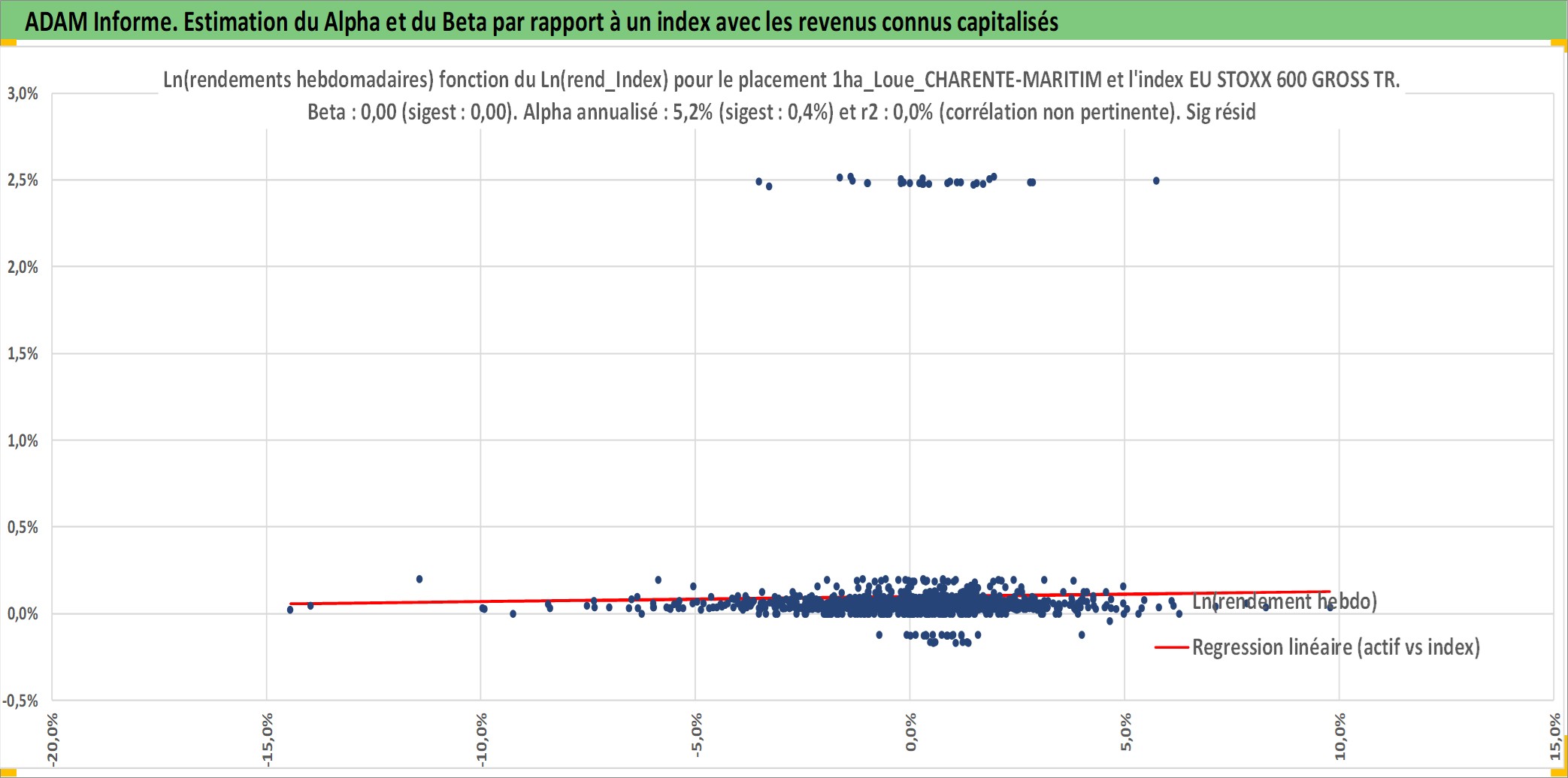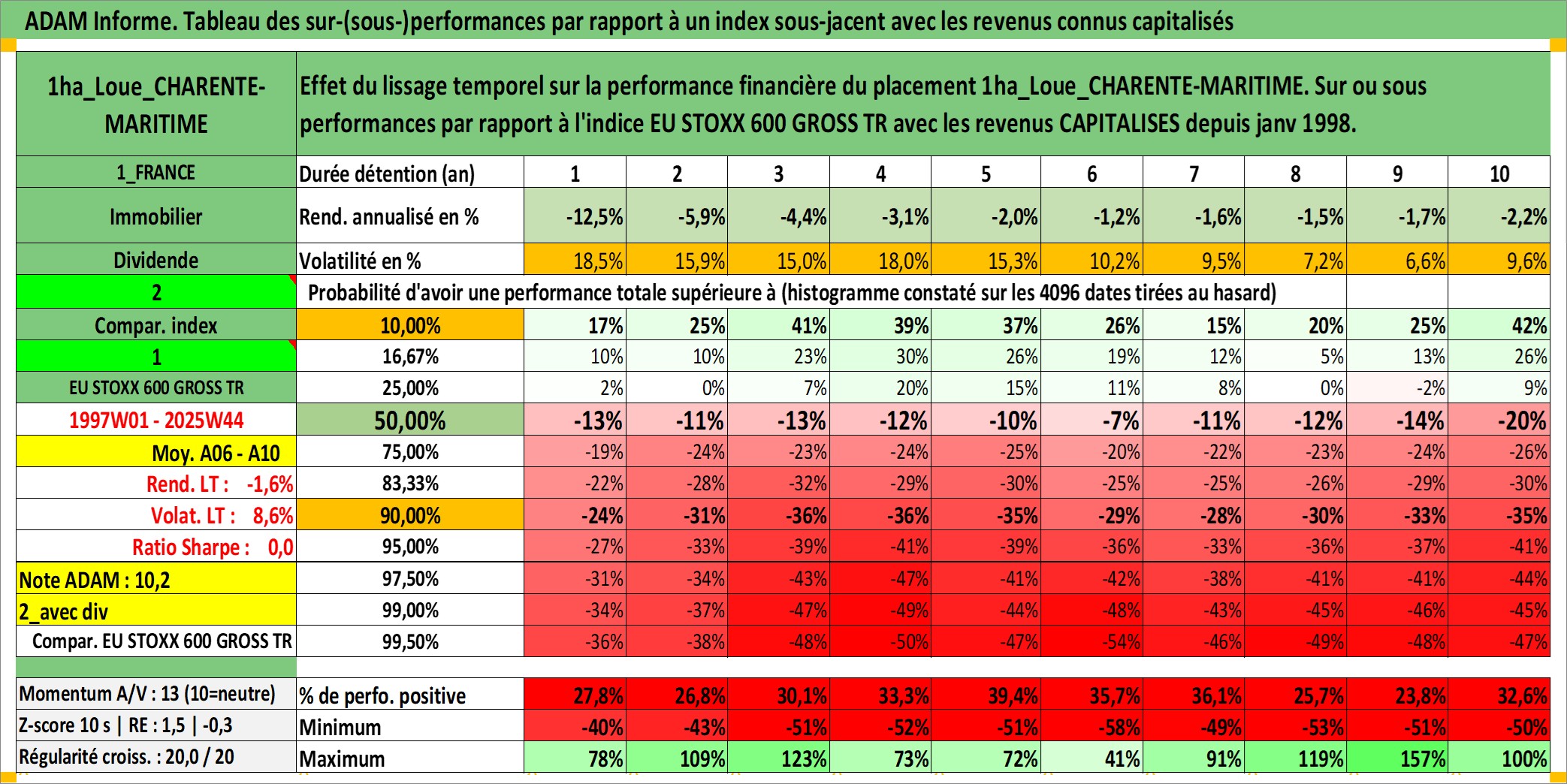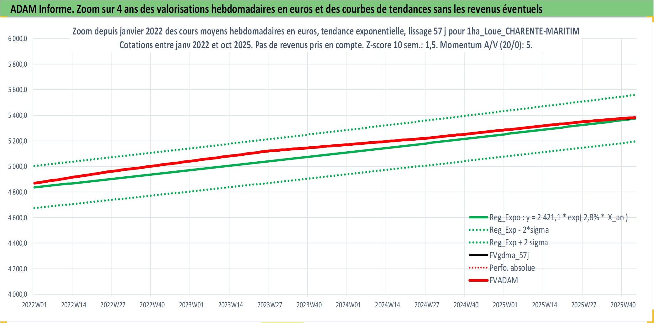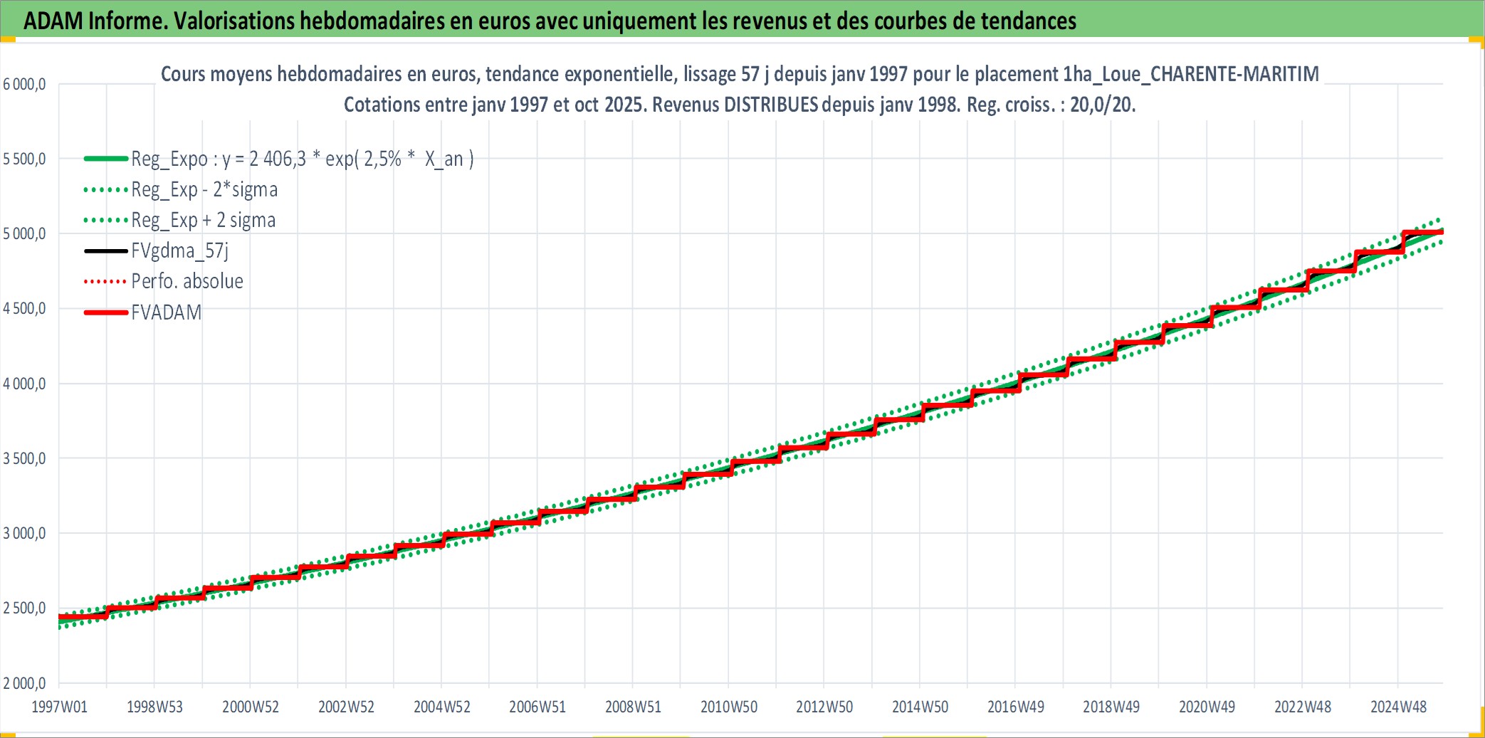 Site dédié aux investisseursPage dédiée sur site financeAnalyse des valorisations hebdomadaires de l'actif 1ha_Loue_CHARENTE-MARITIME. Cet actif est cote en EUR. Les valorisations couvrent les semaines 1997W01 a 2025W44. Les fermages de ce bien foncier sont pris egaux a 2,5% annuels de la valeur venale du bien.