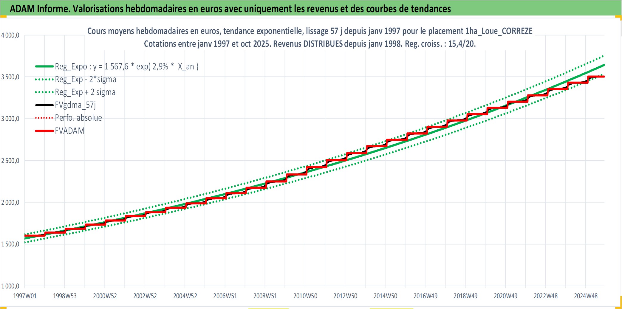 Site dédié aux investisseursPage dédiée sur site financeAnalyse des valorisations hebdomadaires de l'actif 1ha_Loue_CORREZE. Cet actif est cote en EUR. Les valorisations couvrent les semaines 1997W01 a 2025W44. Les fermages de ce bien foncier sont pris egaux a 2,5% annuels de la valeur venale du bien.