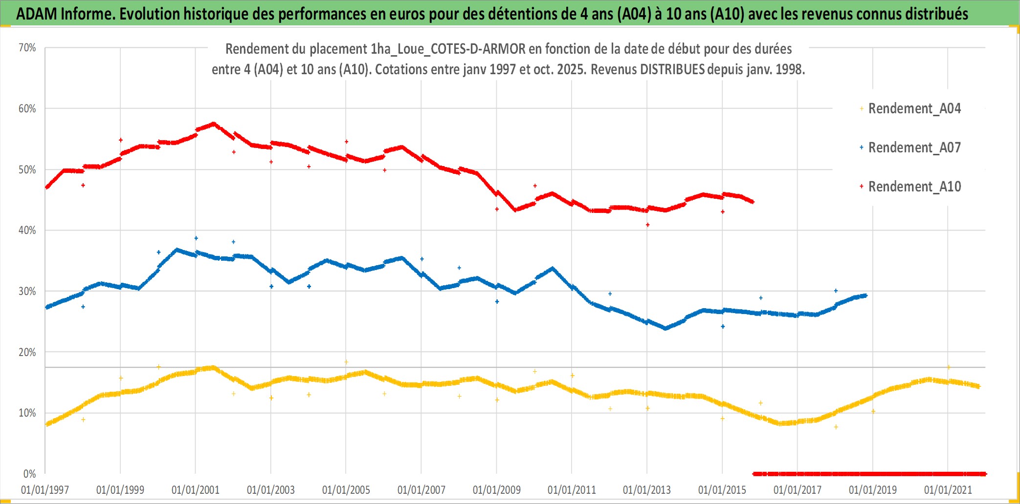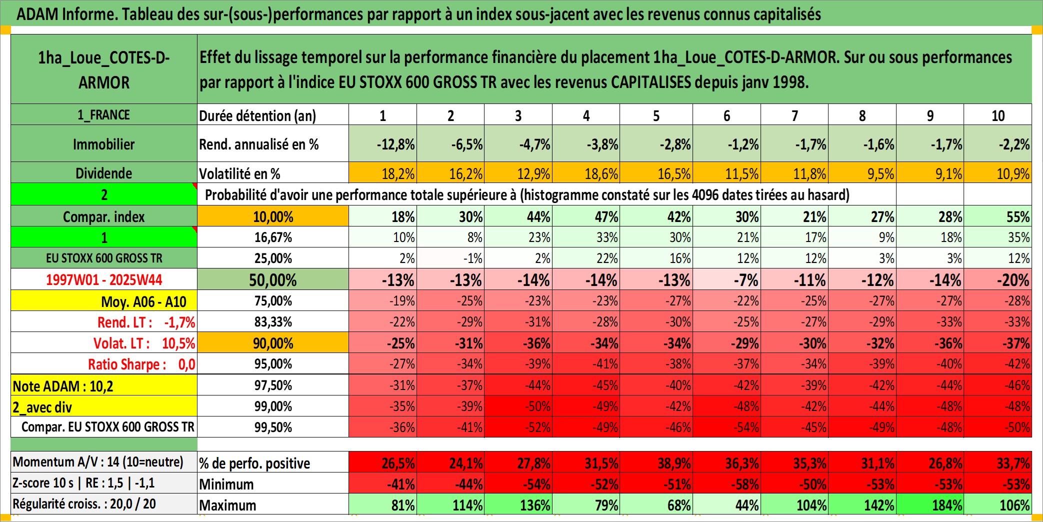 Site dédié aux investisseursPage dédiée sur site financeAnalyse des valorisations hebdomadaires de l'actif 1ha_Loue_COTES-D-ARMOR. Cet actif est cote en EUR. Les valorisations couvrent les semaines 1997W01 a 2025W44. Les fermages de ce bien foncier sont pris egaux a 2,5% annuels de la valeur venale du bien.
