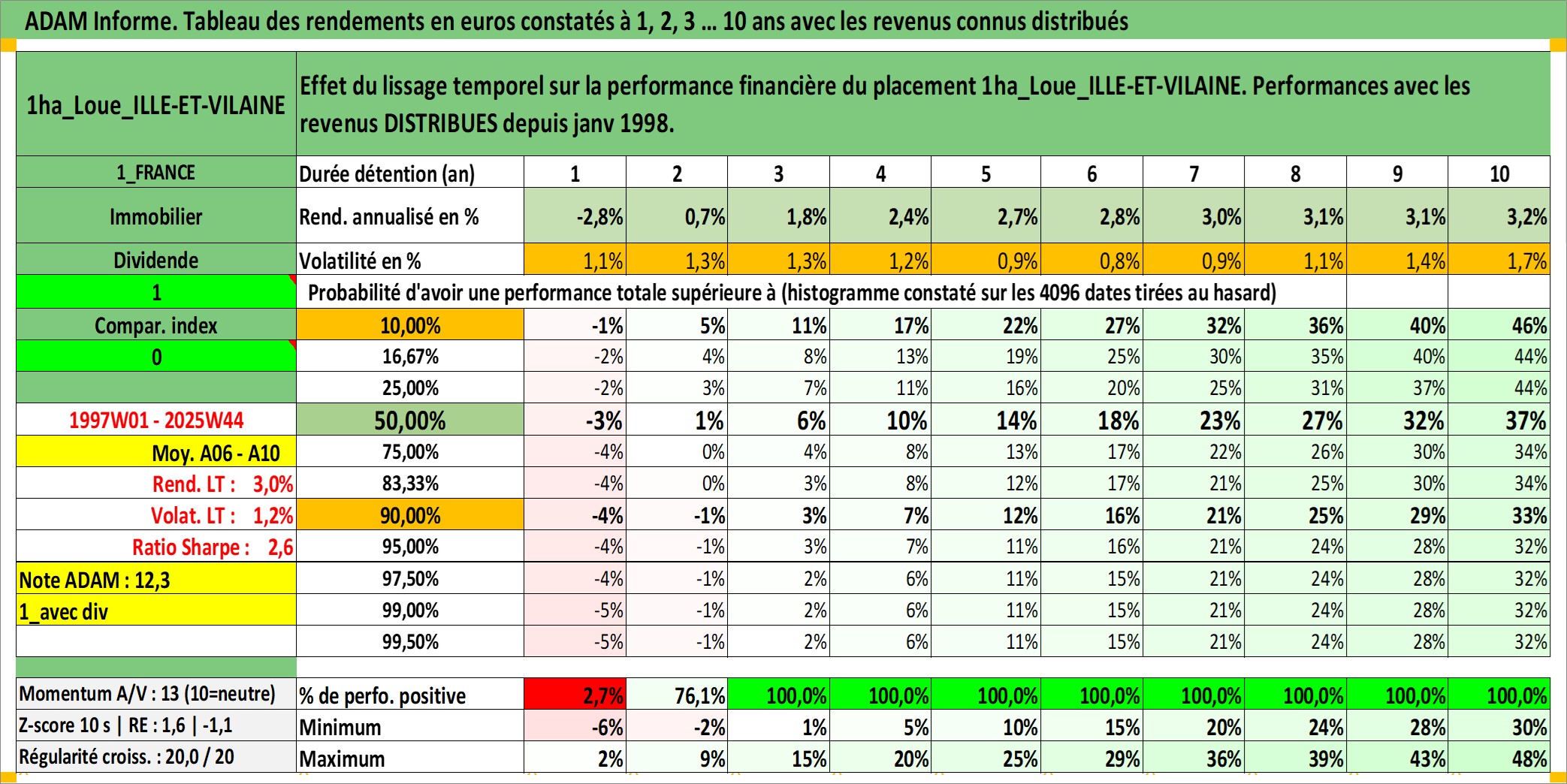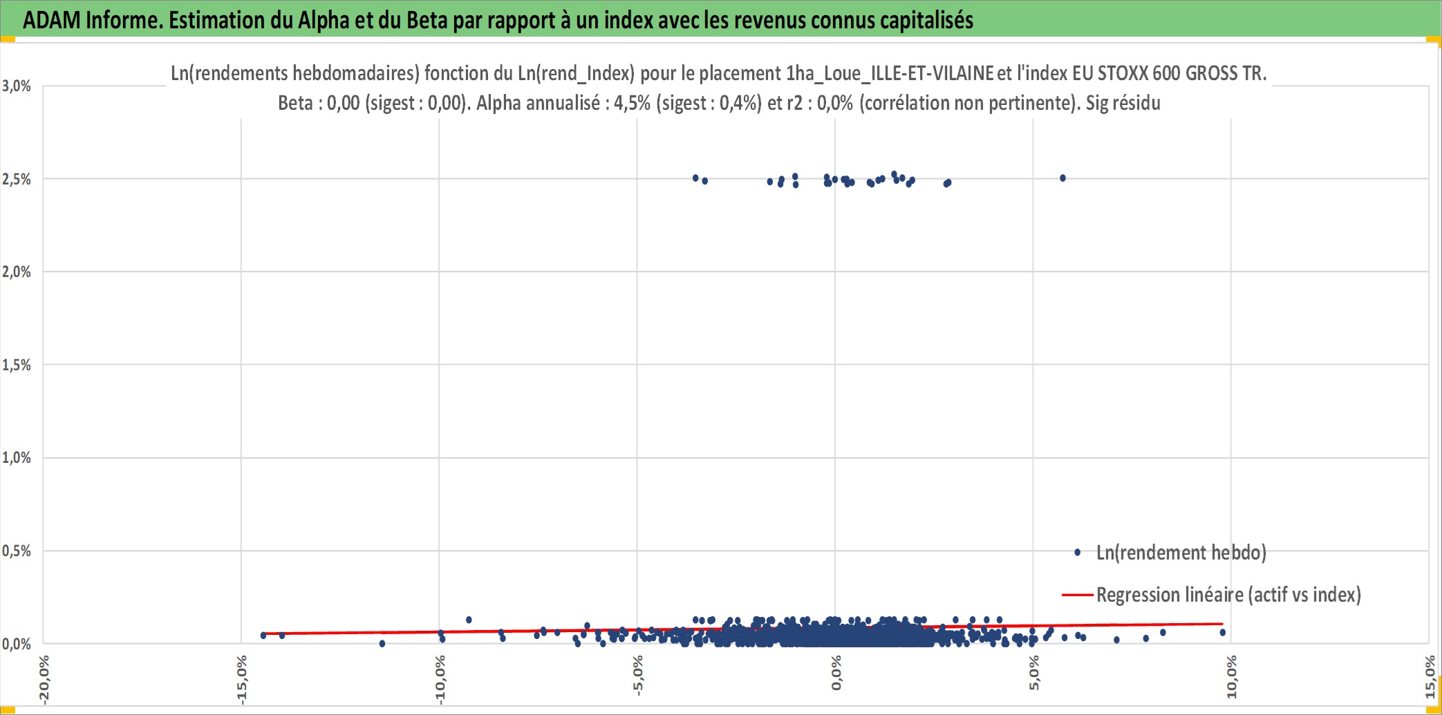 Site dédié aux investisseursPage dédiée sur site financeAnalyse des valorisations hebdomadaires de l'actif 1ha_Loue_ILLE-ET-VILAINE. Cet actif est cote en EUR. Les valorisations couvrent les semaines 1997W01 a 2025W44. Les fermages de ce bien foncier sont pris egaux a 2,5% annuels de la valeur venale du bien.