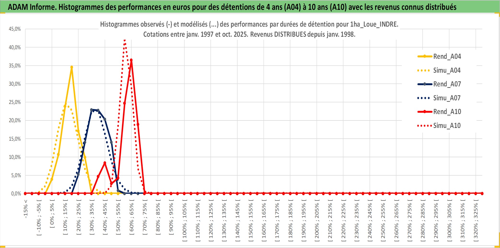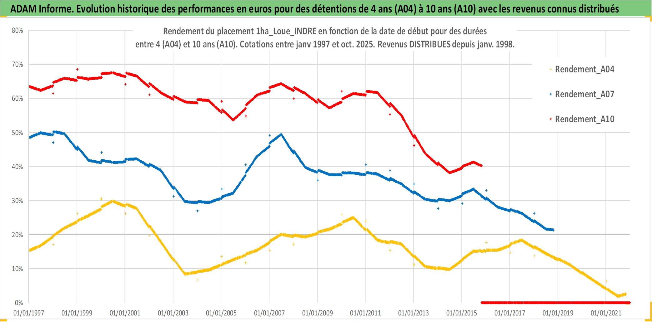 Site dédié aux investisseursPage dédiée sur site financeAnalyse des valorisations hebdomadaires de l'actif 1ha_Loue_INDRE. Cet actif est cote en EUR. Les valorisations couvrent les semaines 1997W01 a 2025W44. Les fermages de ce bien foncier sont pris egaux a 2,5% annuels de la valeur venale du bien.