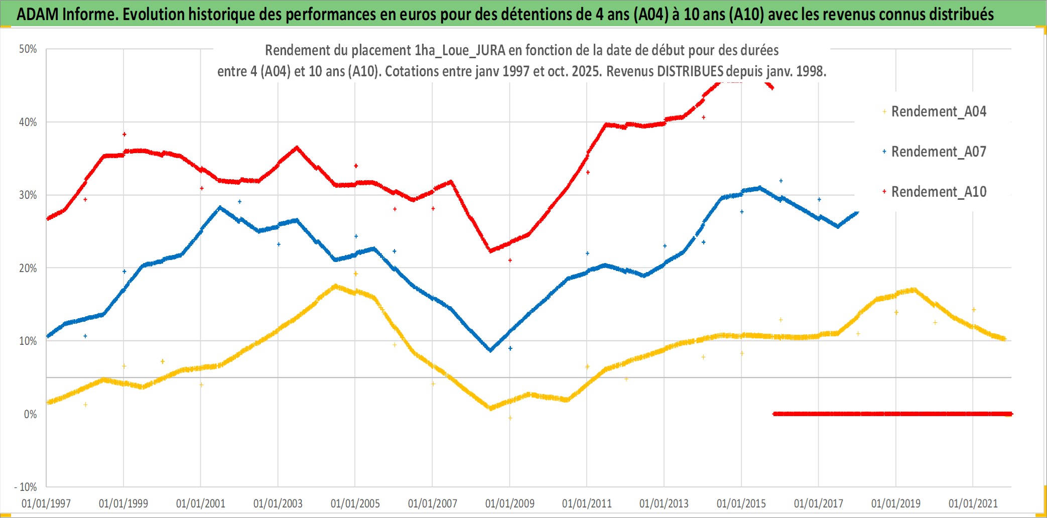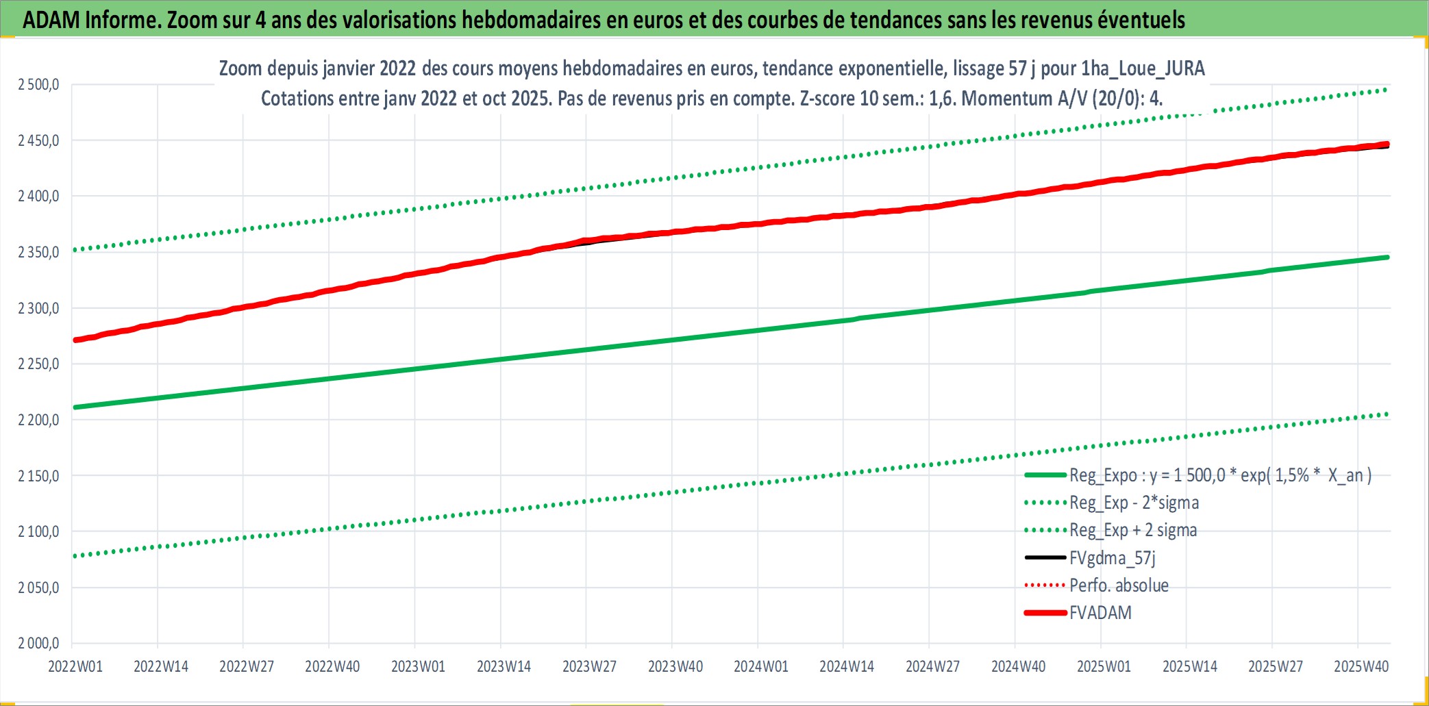 Site dédié aux investisseursPage dédiée sur site financeAnalyse des valorisations hebdomadaires de l'actif 1ha_Loue_JURA. Cet actif est cote en EUR. Les valorisations couvrent les semaines 1997W01 a 2025W44. Les fermages de ce bien foncier sont pris egaux a 2,5% annuels de la valeur venale du bien.