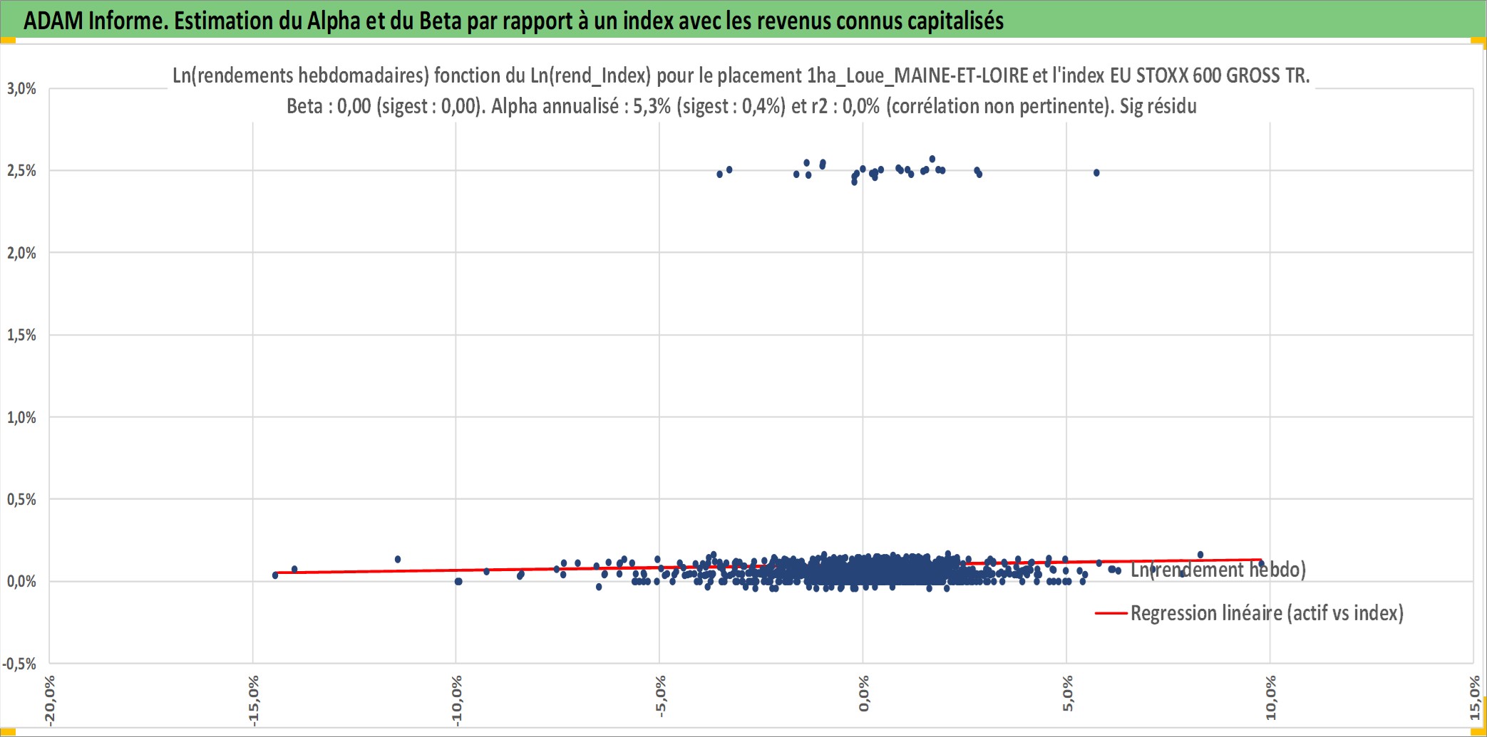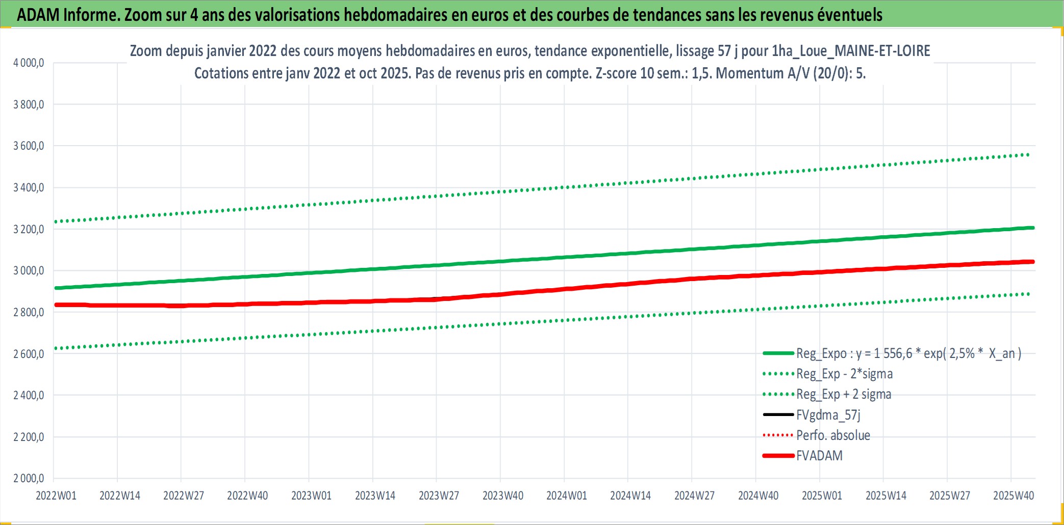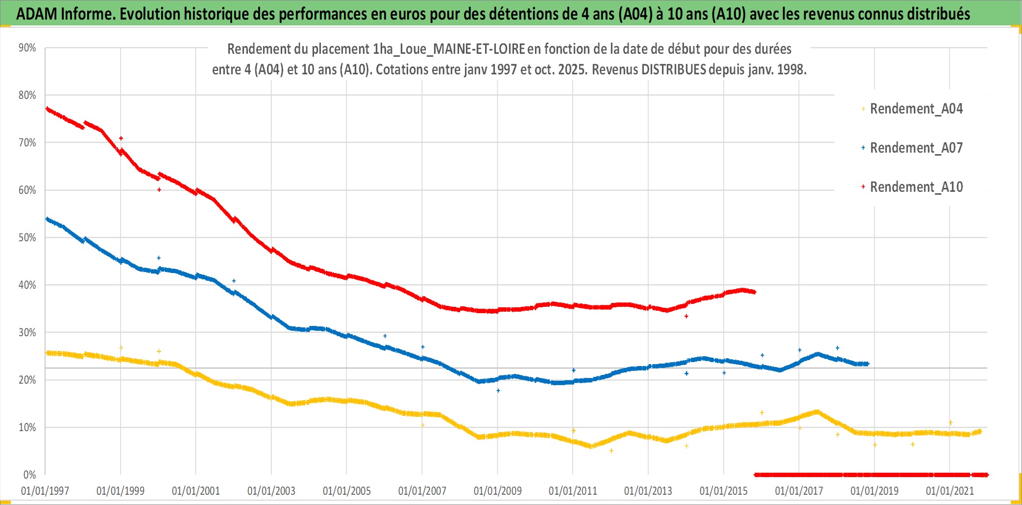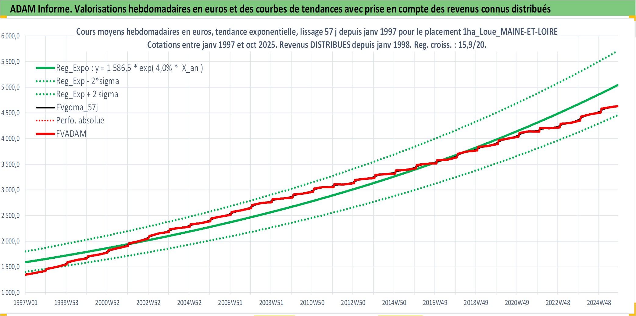 Site dédié aux investisseursPage dédiée sur site financeAnalyse des valorisations hebdomadaires de l'actif 1ha_Loue_MAINE-ET-LOIRE. Cet actif est cote en EUR. Les valorisations couvrent les semaines 1997W01 a 2025W44. Les fermages de ce bien foncier sont pris egaux a 2,5% annuels de la valeur venale du bien.
