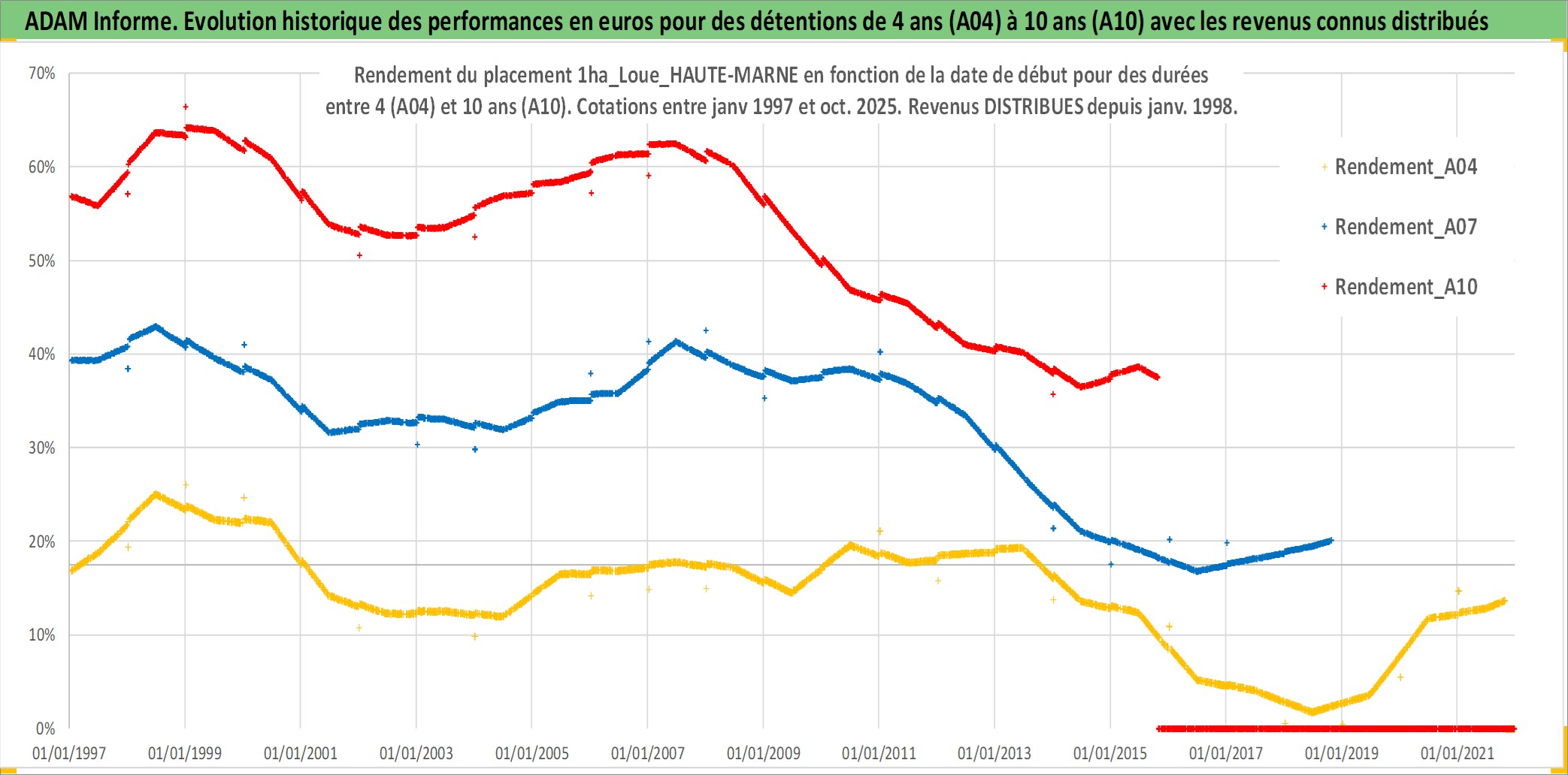Site dédié aux investisseursPage dédiée sur site financeAnalyse des valorisations hebdomadaires de l'actif 1ha_Loue_HAUTE-MARNE. Cet actif est cote en EUR. Les valorisations couvrent les semaines 1997W01 a 2025W44. Les fermages de ce bien foncier sont pris egaux a 2,5% annuels de la valeur venale du bien.