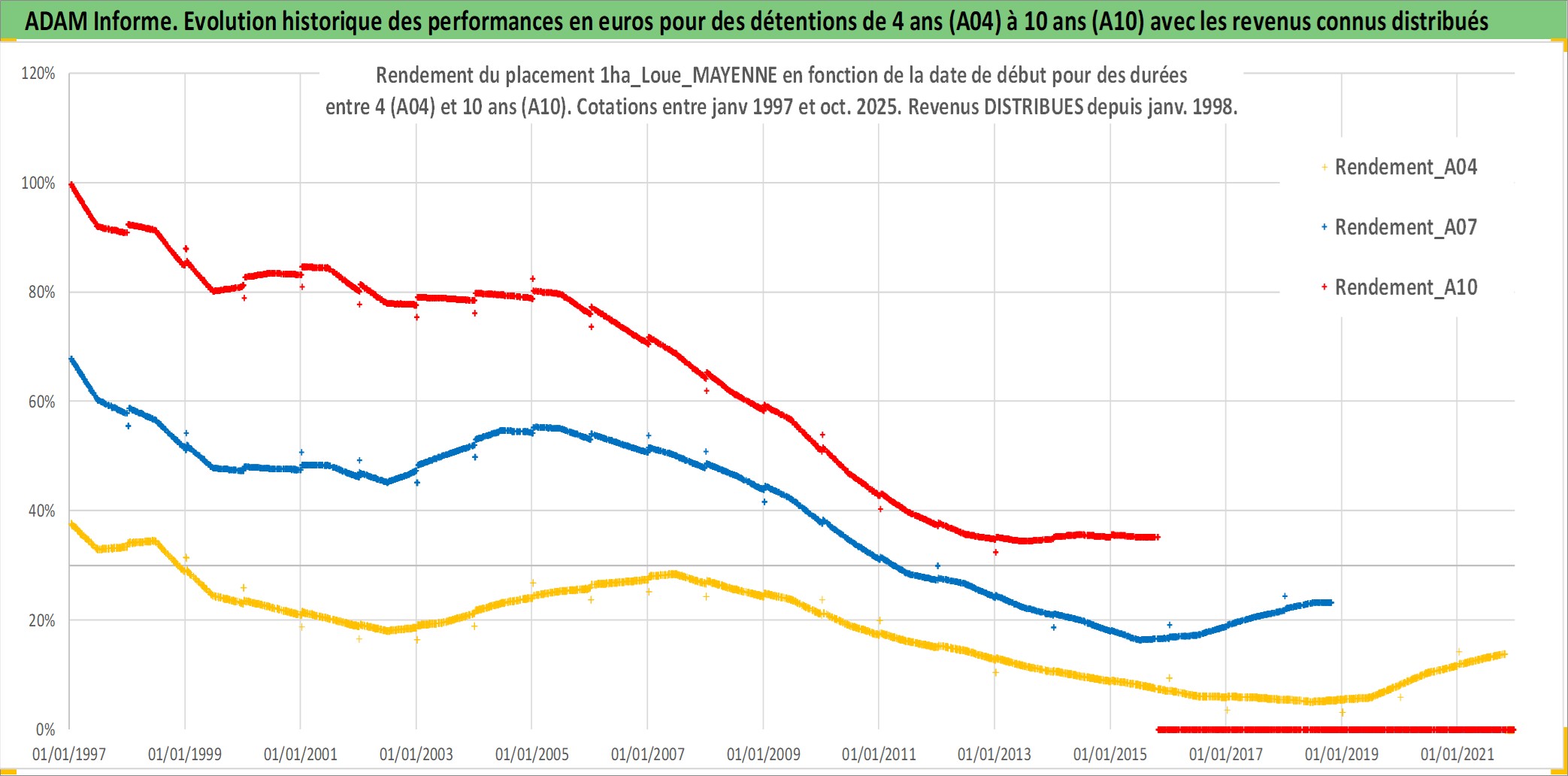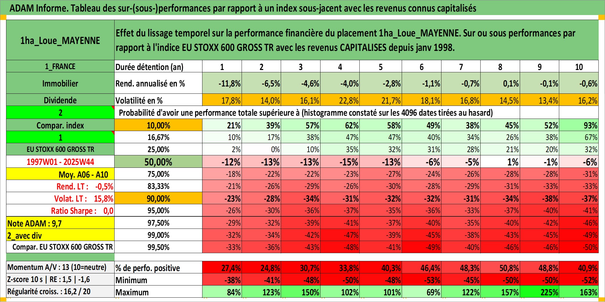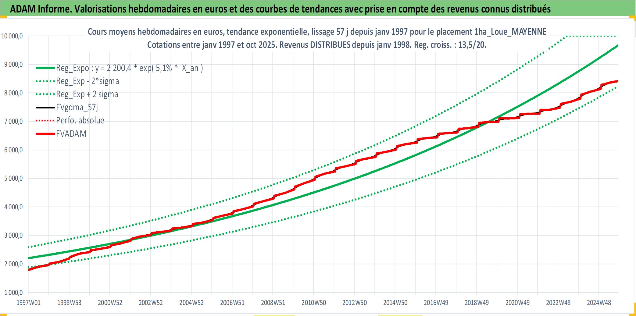 Site dédié aux investisseursPage dédiée sur site financeAnalyse des valorisations hebdomadaires de l'actif 1ha_Loue_MAYENNE. Cet actif est cote en EUR. Les valorisations couvrent les semaines 1997W01 a 2025W44. Les fermages de ce bien foncier sont pris egaux a 2,5% annuels de la valeur venale du bien.