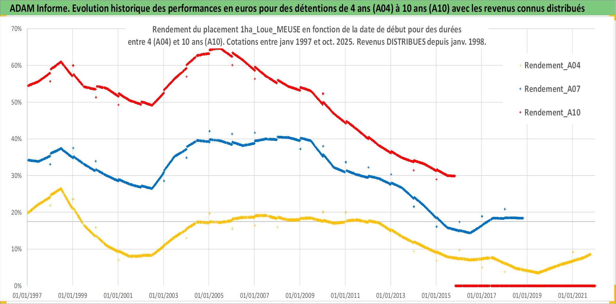 Site dédié aux investisseursPage dédiée sur site financeAnalyse des valorisations hebdomadaires de l'actif 1ha_Loue_MEUSE. Cet actif est cote en EUR. Les valorisations couvrent les semaines 1997W01 a 2025W44. Les fermages de ce bien foncier sont pris egaux a 2,5% annuels de la valeur venale du bien.