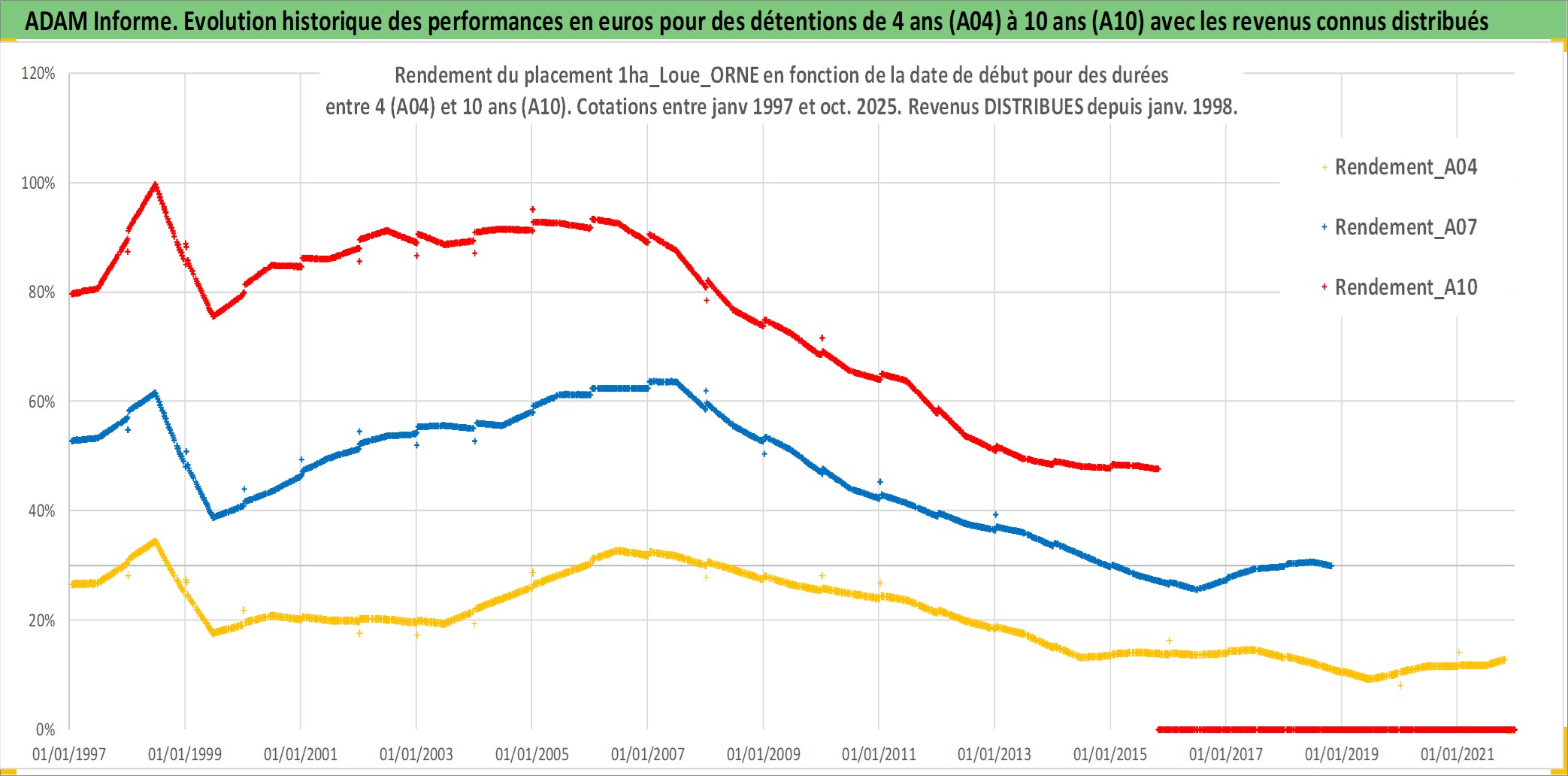 Site dédié aux investisseursPage dédiée sur site financeAnalyse des valorisations hebdomadaires de l'actif 1ha_Loue_ORNE. Cet actif est cote en EUR. Les valorisations couvrent les semaines 1997W01 a 2025W44. Les fermages de ce bien foncier sont pris egaux a 2,5% annuels de la valeur venale du bien.