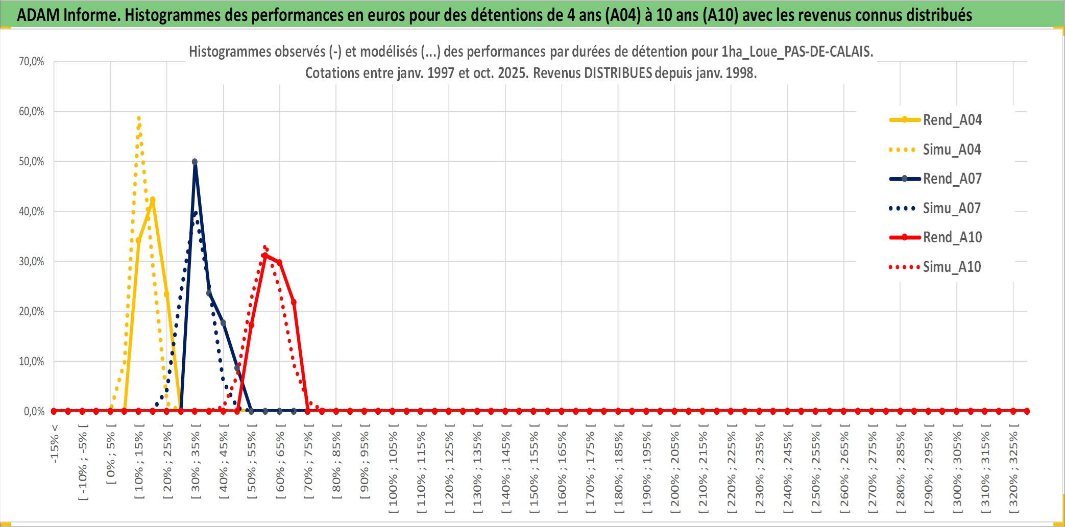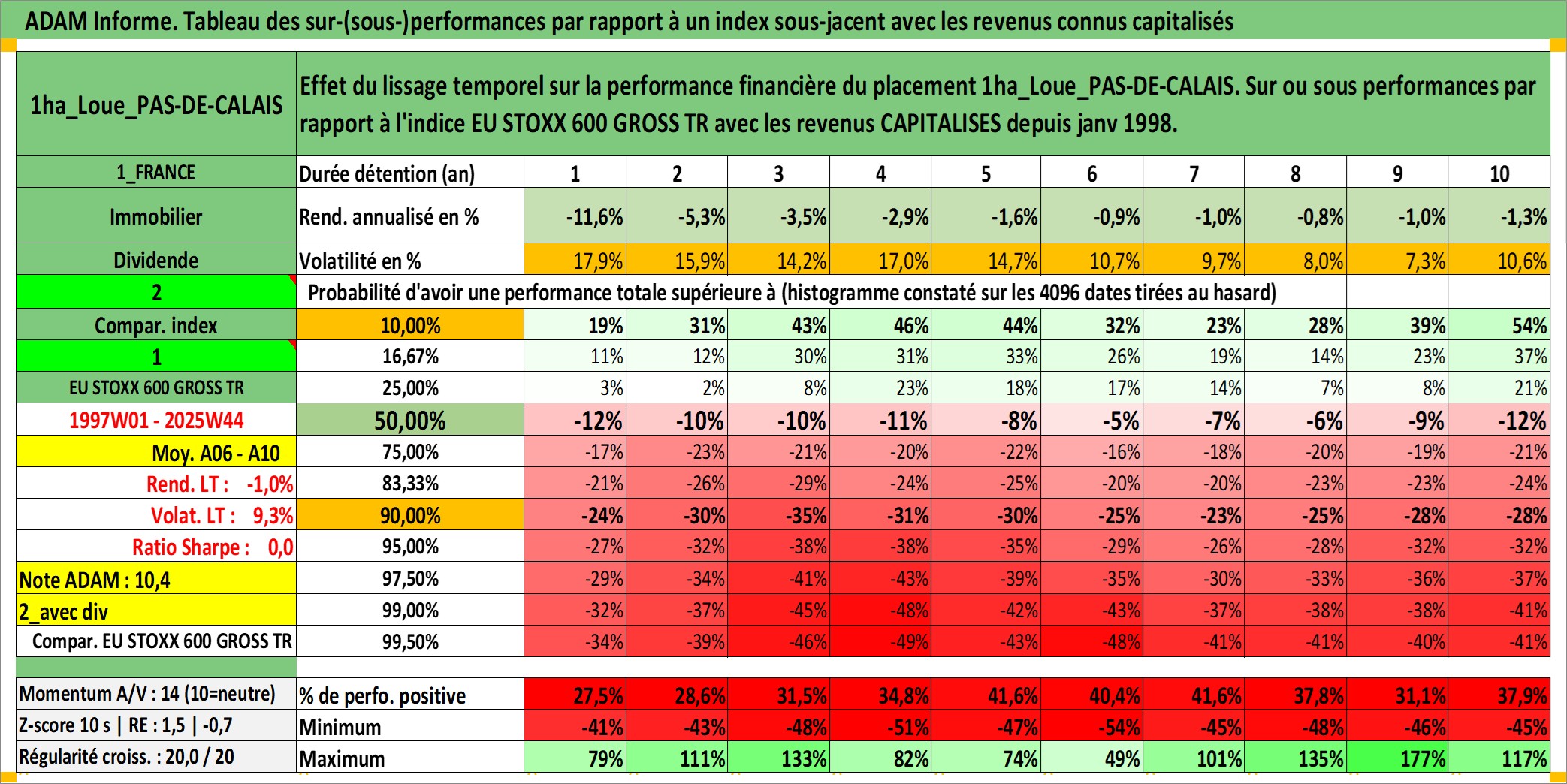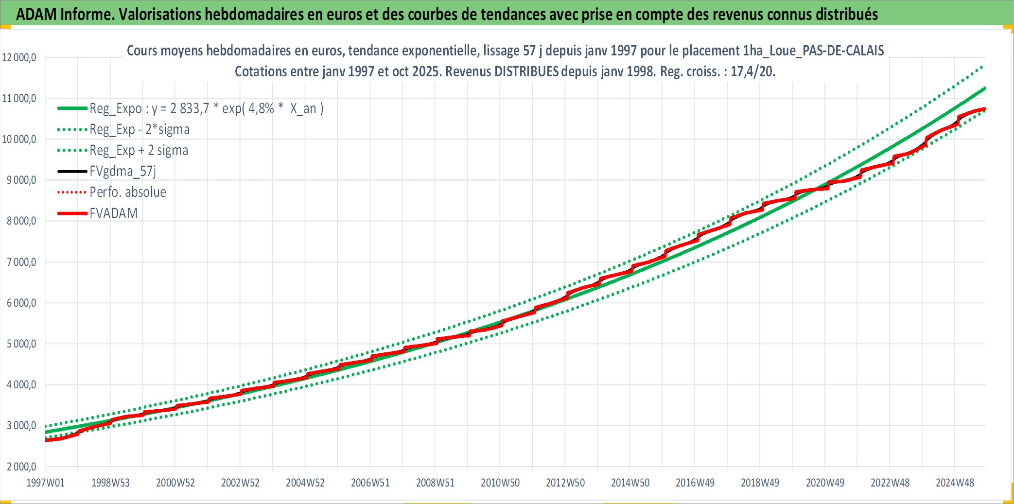 Site dédié aux investisseursPage dédiée sur site financeAnalyse des valorisations hebdomadaires de l'actif 1ha_Loue_PAS-DE-CALAIS. Cet actif est cote en EUR. Les valorisations couvrent les semaines 1997W01 a 2025W44. Les fermages de ce bien foncier sont pris egaux a 2,5% annuels de la valeur venale du bien.