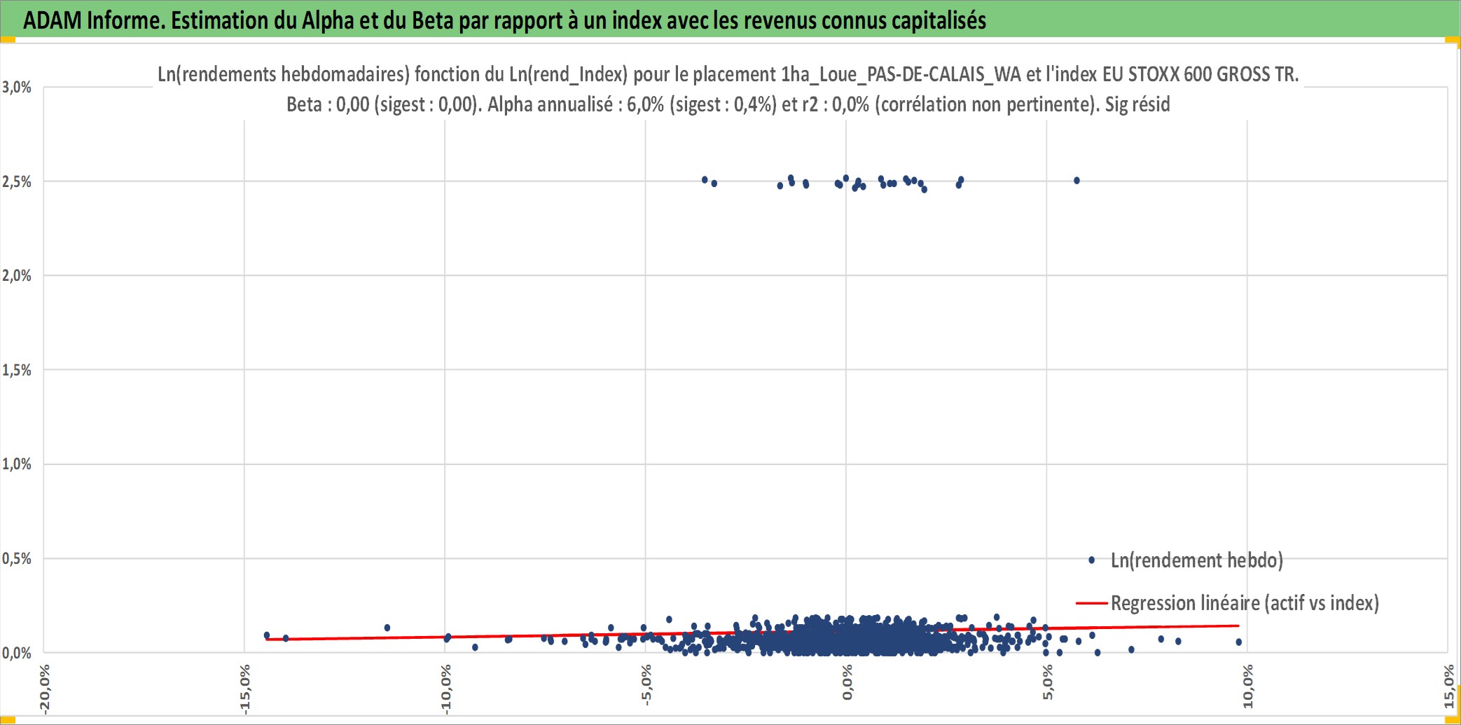 Site dédié aux investisseursPage dédiée sur site financeAnalyse des valorisations hebdomadaires de l'actif 1ha_Loue_PAS-DE-CALAIS_WATERINGUES - COLLINES GUINOISES. Cet actif est cote en EUR. Les valorisations couvrent les semaines 1997W01 a 2025W44. Les fermages de ce bien foncier sont pris egaux a 2,5% annuels de la valeur venale du bien.