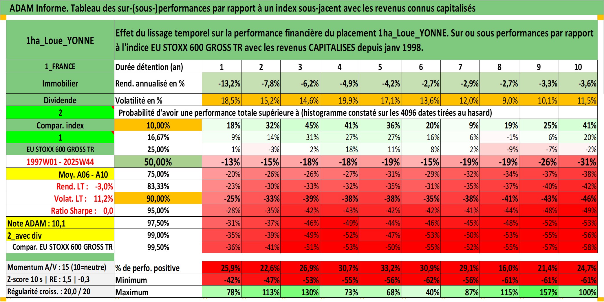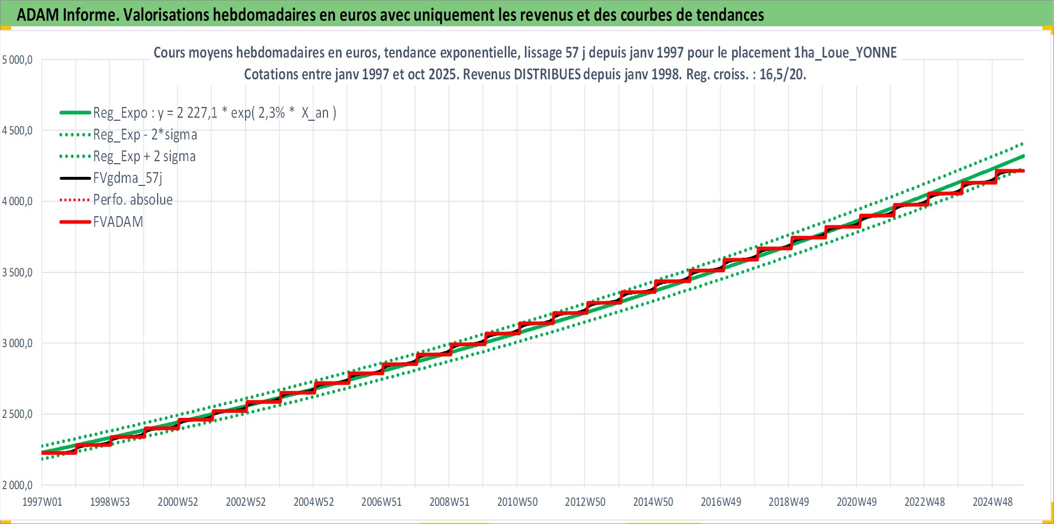 Site dédié aux investisseursPage dédiée sur site financeAnalyse des valorisations hebdomadaires de l'actif 1ha_Loue_YONNE. Cet actif est cote en EUR. Les valorisations couvrent les semaines 1997W01 a 2025W44. Les fermages de ce bien foncier sont pris egaux a 2,5% annuels de la valeur venale du bien.