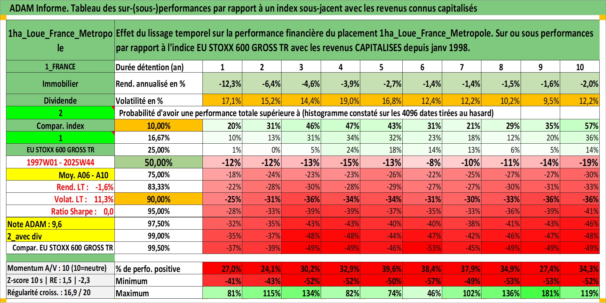 Site dédié aux investisseursPage dédiée sur site financeAnalyse des valorisations hebdomadaires de l'actif 1ha_Loue_France_Metropole. Cet actif est cote en EUR. Les valorisations couvrent les semaines 1997W01 a 2025W44. Les fermages de ce bien foncier sont pris egaux a 2,5% annuels de la valeur venale du bien.