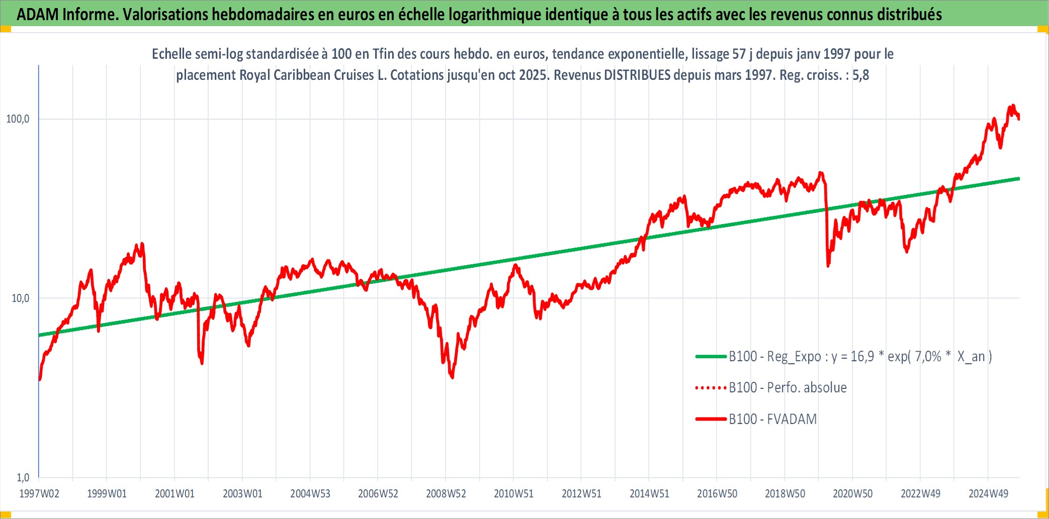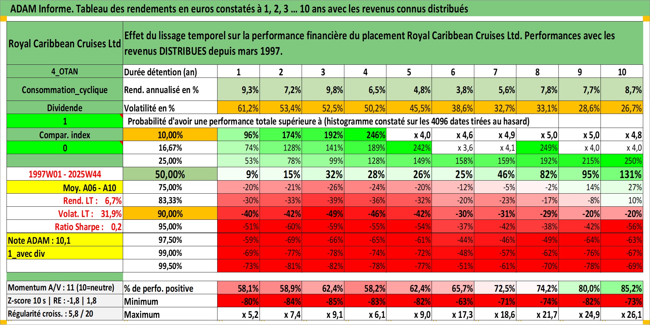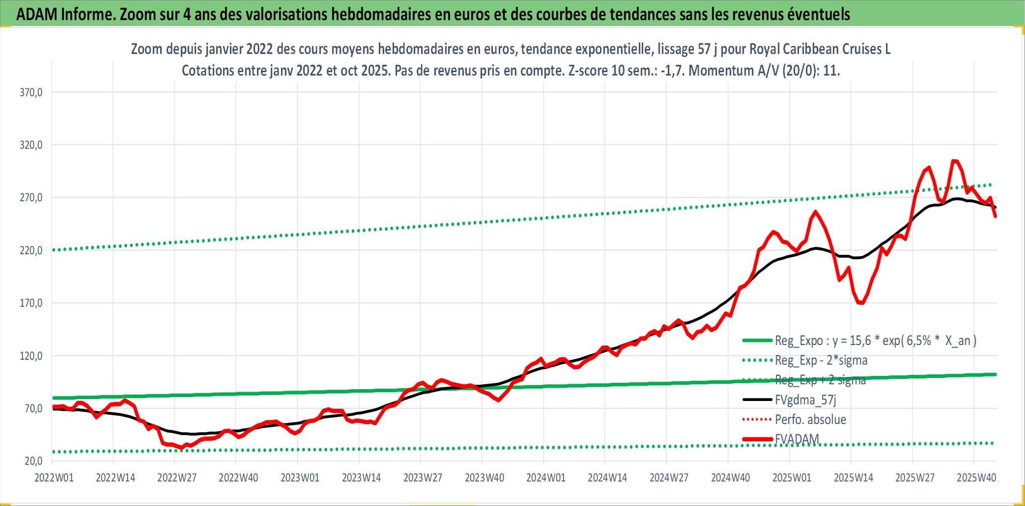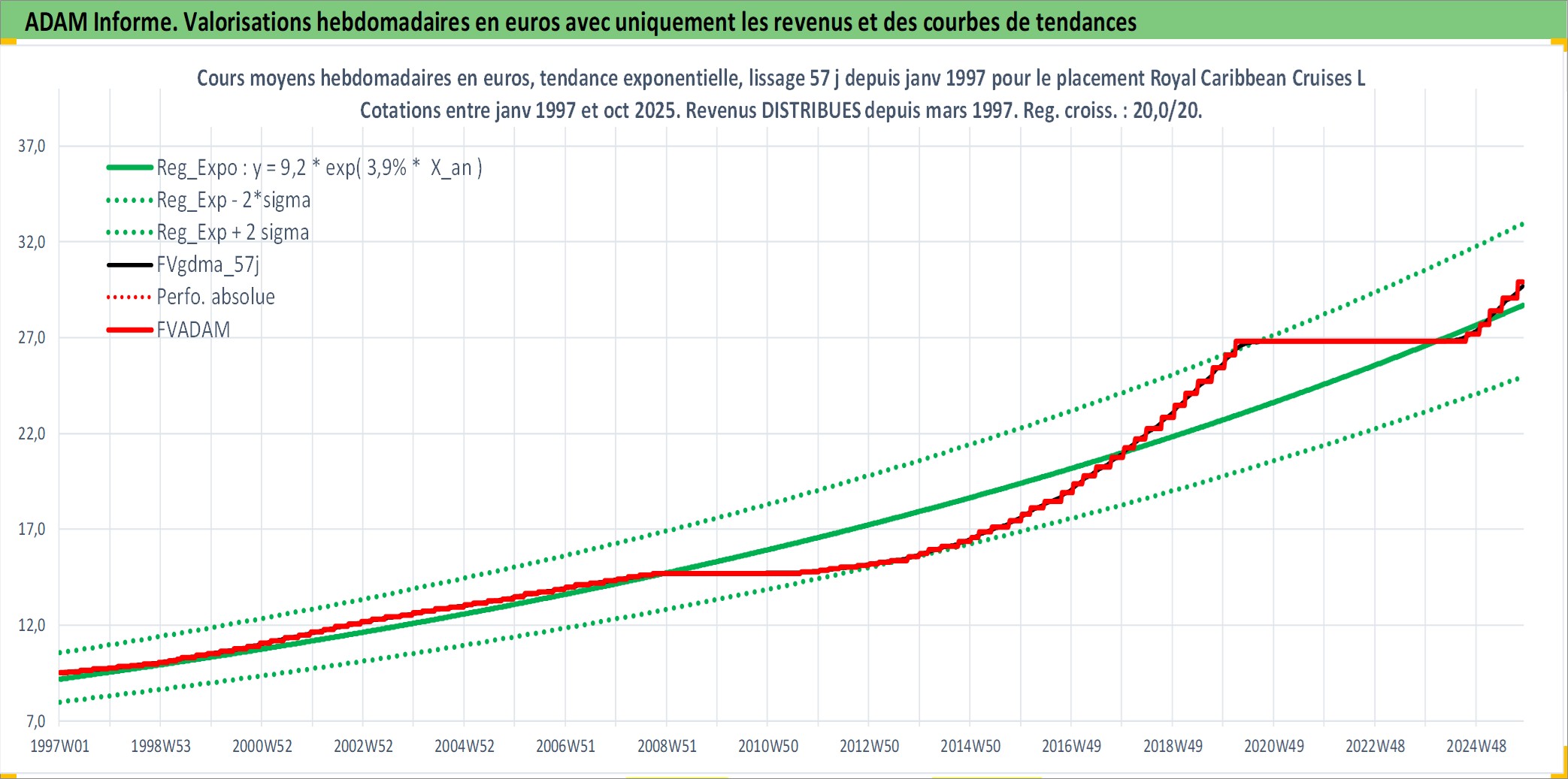 Site dédié aux investisseursPage dédiée sur site financeAnalyse des valorisations hebdomadaires de l'action Royal Caribbean Cruises Ltd. Cet actif est cote en USD. Les valorisations sont en contrevaleur EURO et couvrent les semaines 1997W01 a 2025W44. Les revenus de cet actif financier sont pris en compte depuis la semaine 1997W10. La note globale ESG de cet actif est estimee a 10.0 (apres rebasage entre 0 et 20).