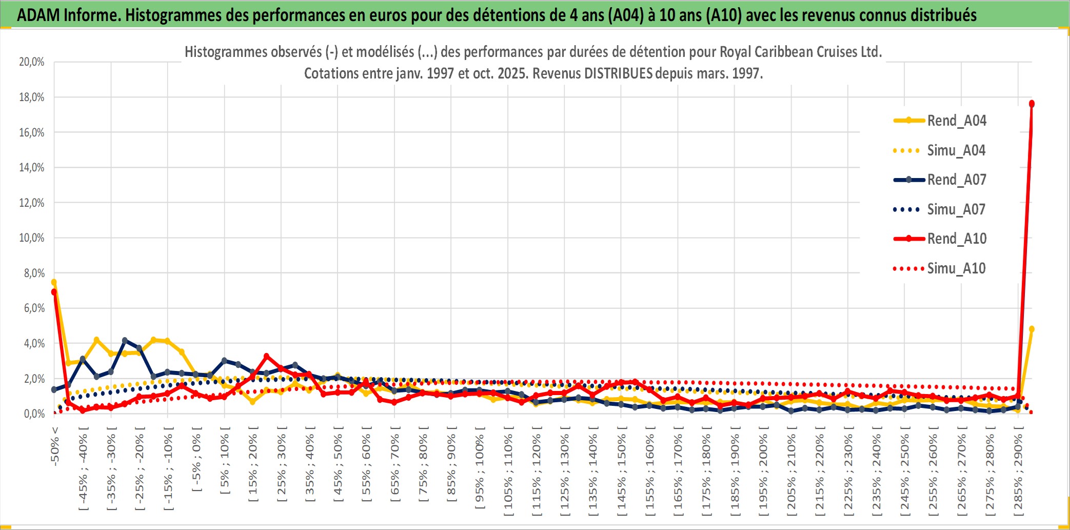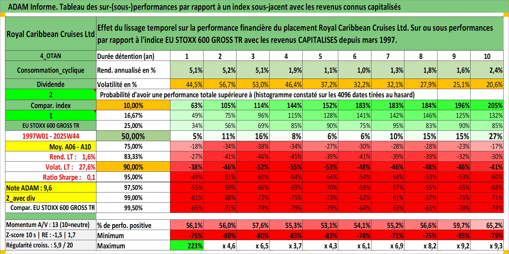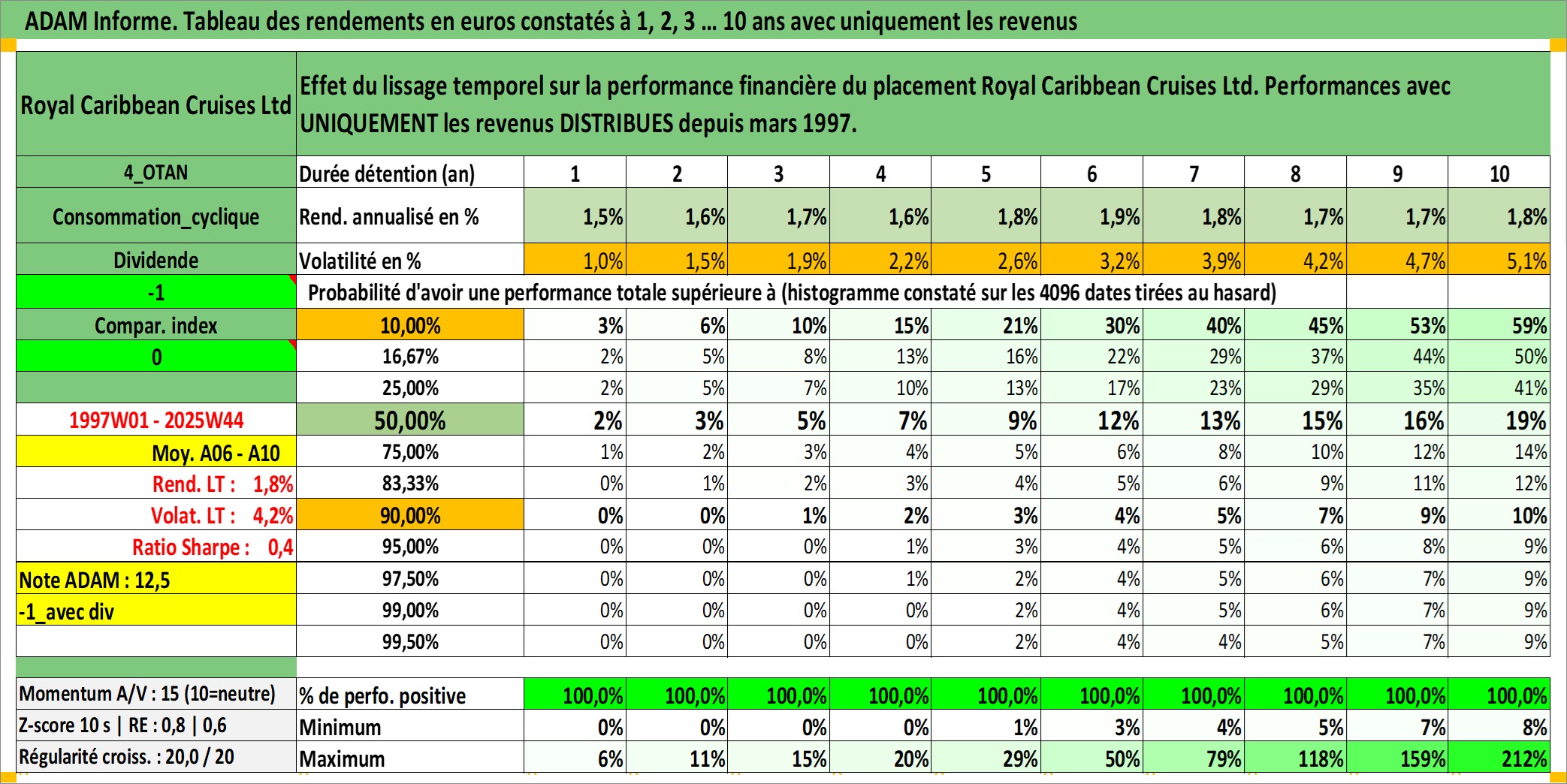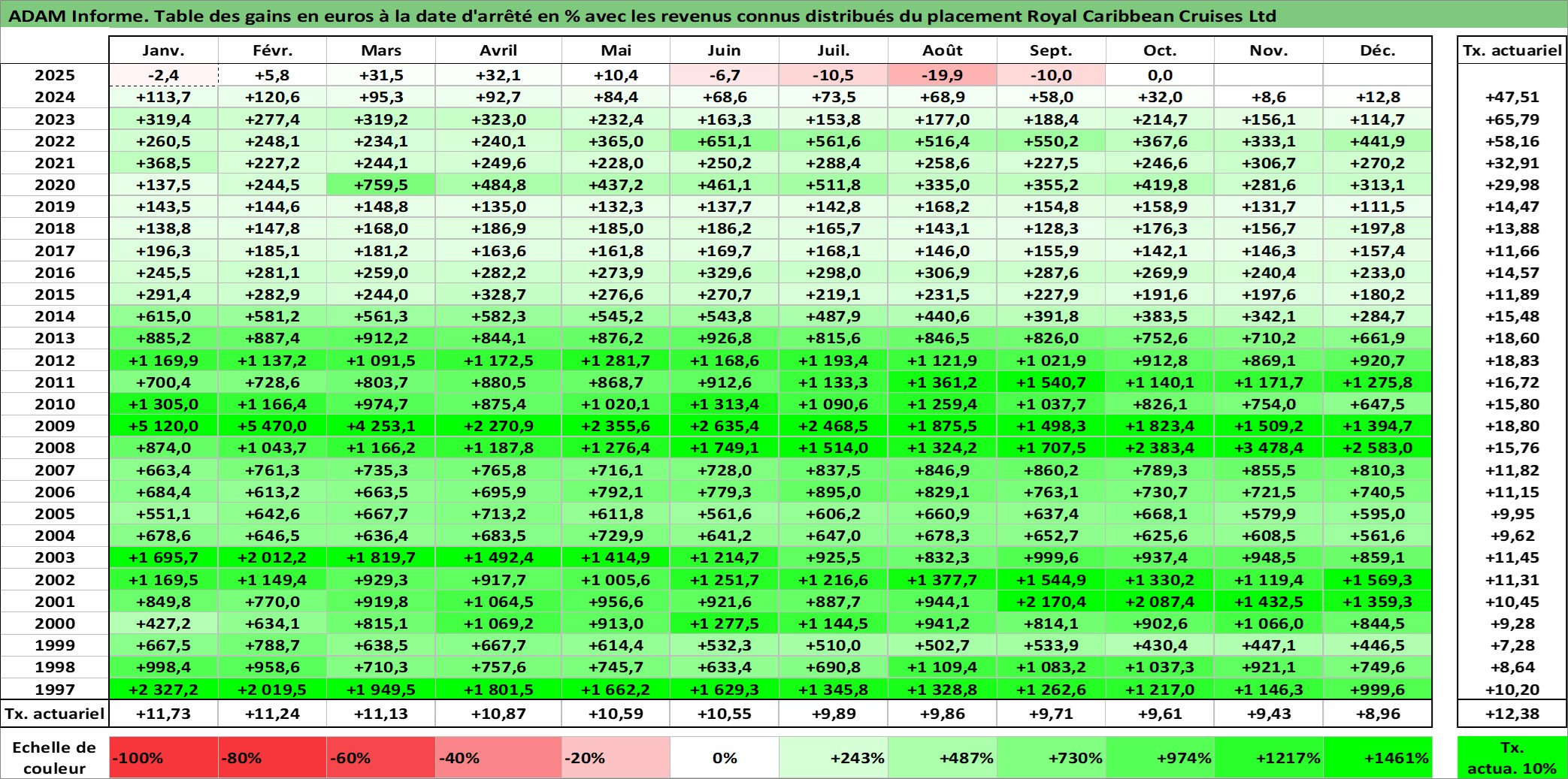 Site dédié aux investisseursPage dédiée sur site financeAnalyse des valorisations hebdomadaires de l'action Royal Caribbean Cruises Ltd. Cet actif est cote en USD. Les valorisations sont en contrevaleur EURO et couvrent les semaines 1997W01 a 2025W44. Les revenus de cet actif financier sont pris en compte depuis la semaine 1997W10. La note globale ESG de cet actif est estimee a 10.0 (apres rebasage entre 0 et 20).