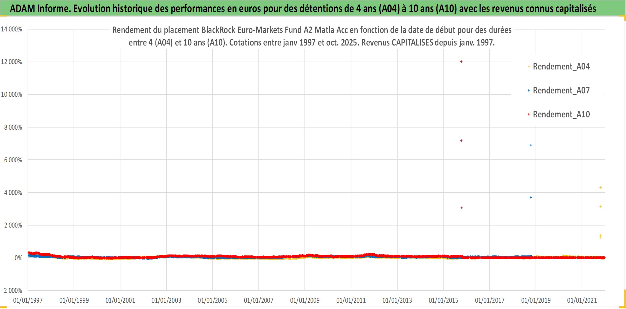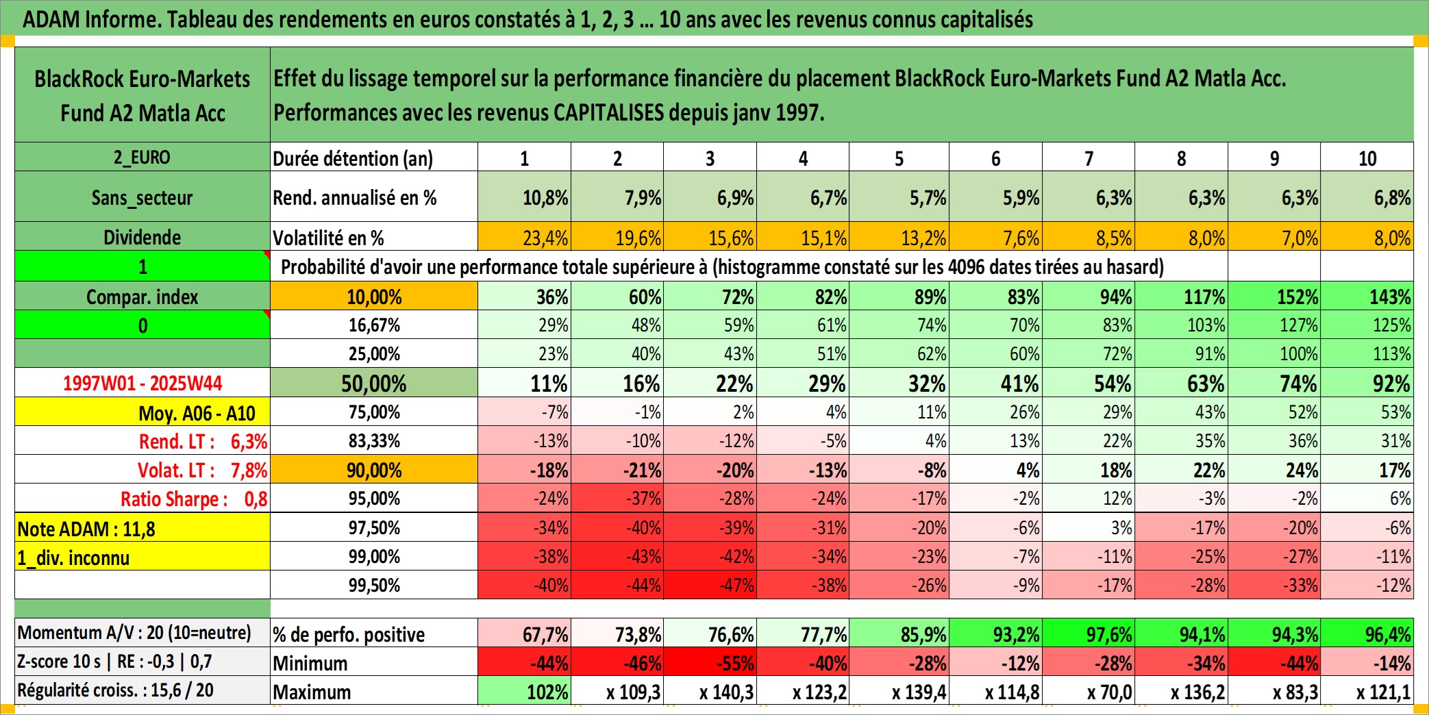 Site dédié aux investisseursPage dédiée sur site financeAnalyse des valorisations hebdomadaires du fonds BlackRock Euro-Markets Fund A2 Matla Acc. Cet actif est cote en EUR. Les valorisations couvrent les semaines 1997W01 a 2025W44. Les revenus de cet actif financier sont pris en compte depuis la semaine 1997W01. La note globale ESG de cet actif est estimee a 7.9 (apres rebasage entre 0 et 20).