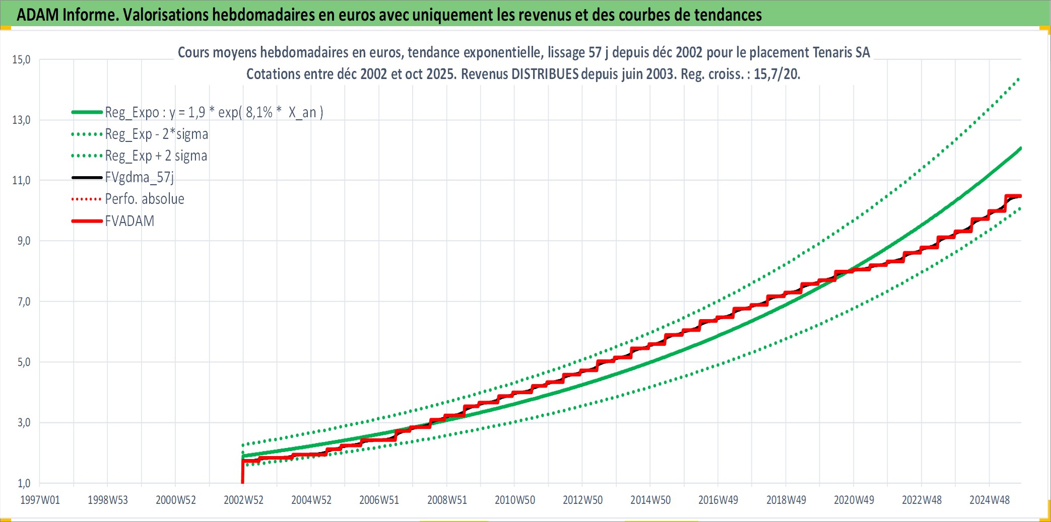 Site dédié aux investisseursPage dédiée sur site financeAnalyse des valorisations hebdomadaires de l'action Tenaris SA. Cet actif est cote en EUR. Les valorisations couvrent les semaines 2002W51 a 2025W44. Les revenus de cet actif financier sont pris en compte depuis la semaine 2003W25. La note globale ESG de cet actif est estimee a 9.0 (apres rebasage entre 0 et 20).