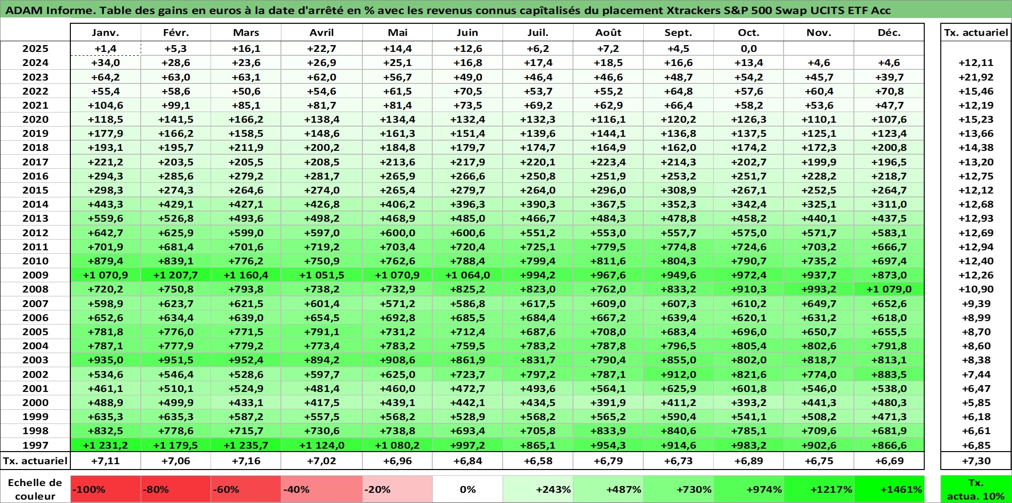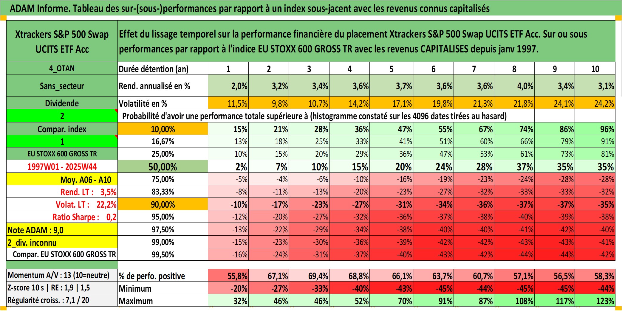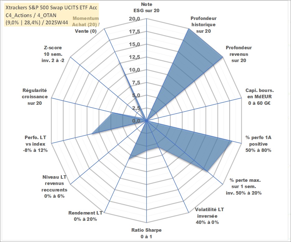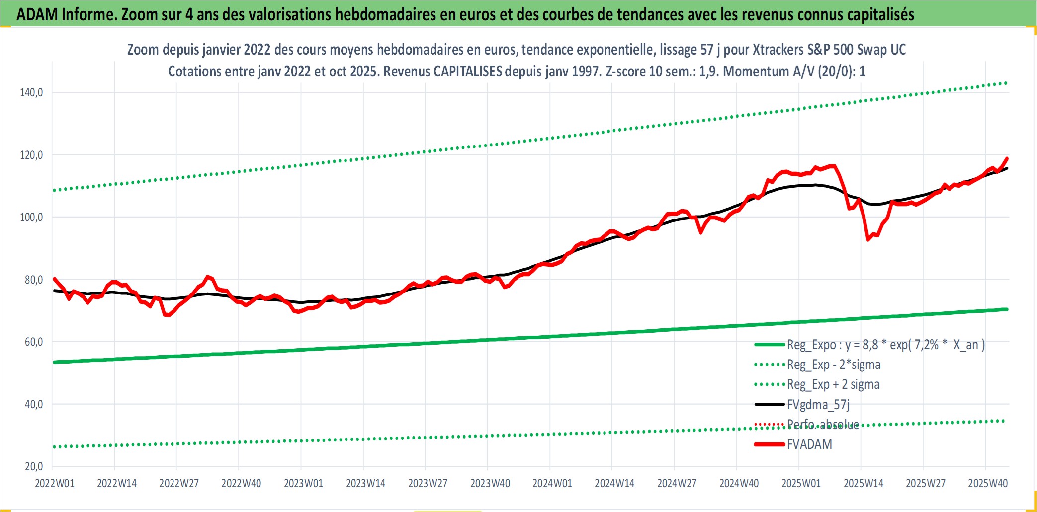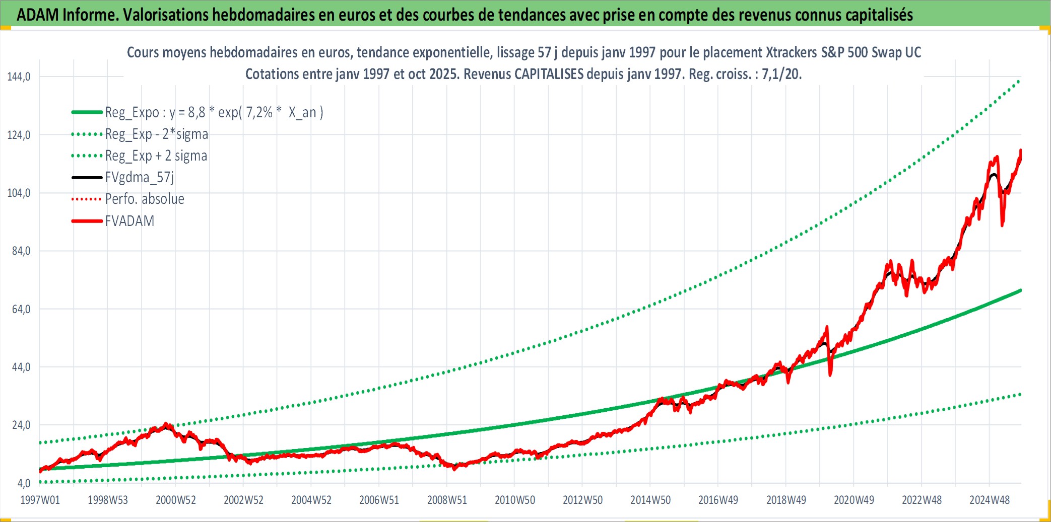 Site dédié aux investisseursPage dédiée sur site financeAnalyse des valorisations hebdomadaires du fonds Xtrackers S&P 500 Swap UCITS ETF Acc. Cet actif est cote en USD. Les valorisations sont en contrevaleur EURO et couvrent les semaines 1997W01 a 2025W44. Les revenus de cet actif financier sont pris en compte depuis la semaine 1997W01. La note ESG de cet actif n'est pas connue.