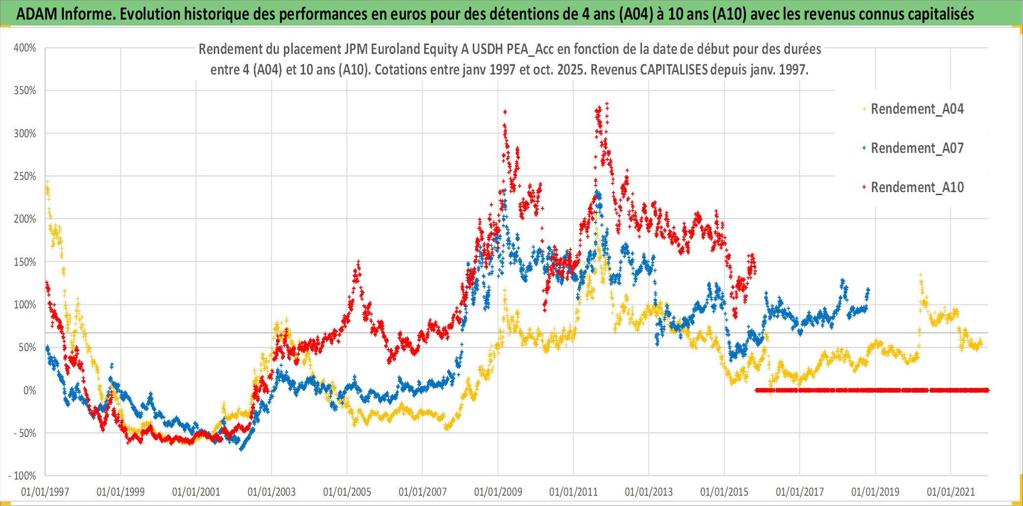 Site dédié aux investisseursPage dédiée sur site financeAnalyse des valorisations hebdomadaires du fonds JPM Euroland Equity A USDH PEA_Acc. Cet actif est cote en USD. Les valorisations sont en contrevaleur EURO et couvrent les semaines 1997W01 a 2025W44. Les revenus de cet actif financier sont pris en compte depuis la semaine 1997W01. La note ESG de cet actif n'est pas connue.