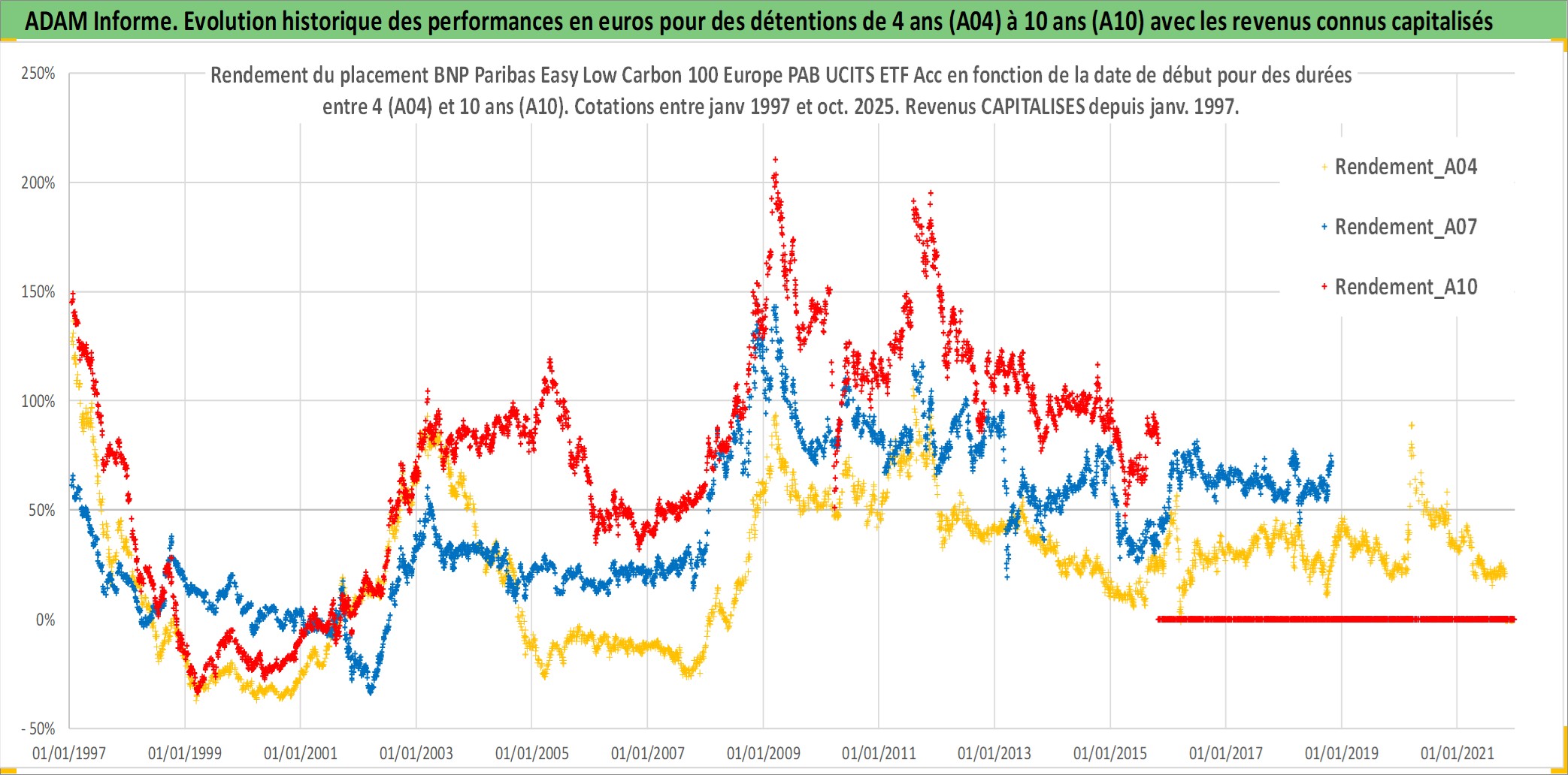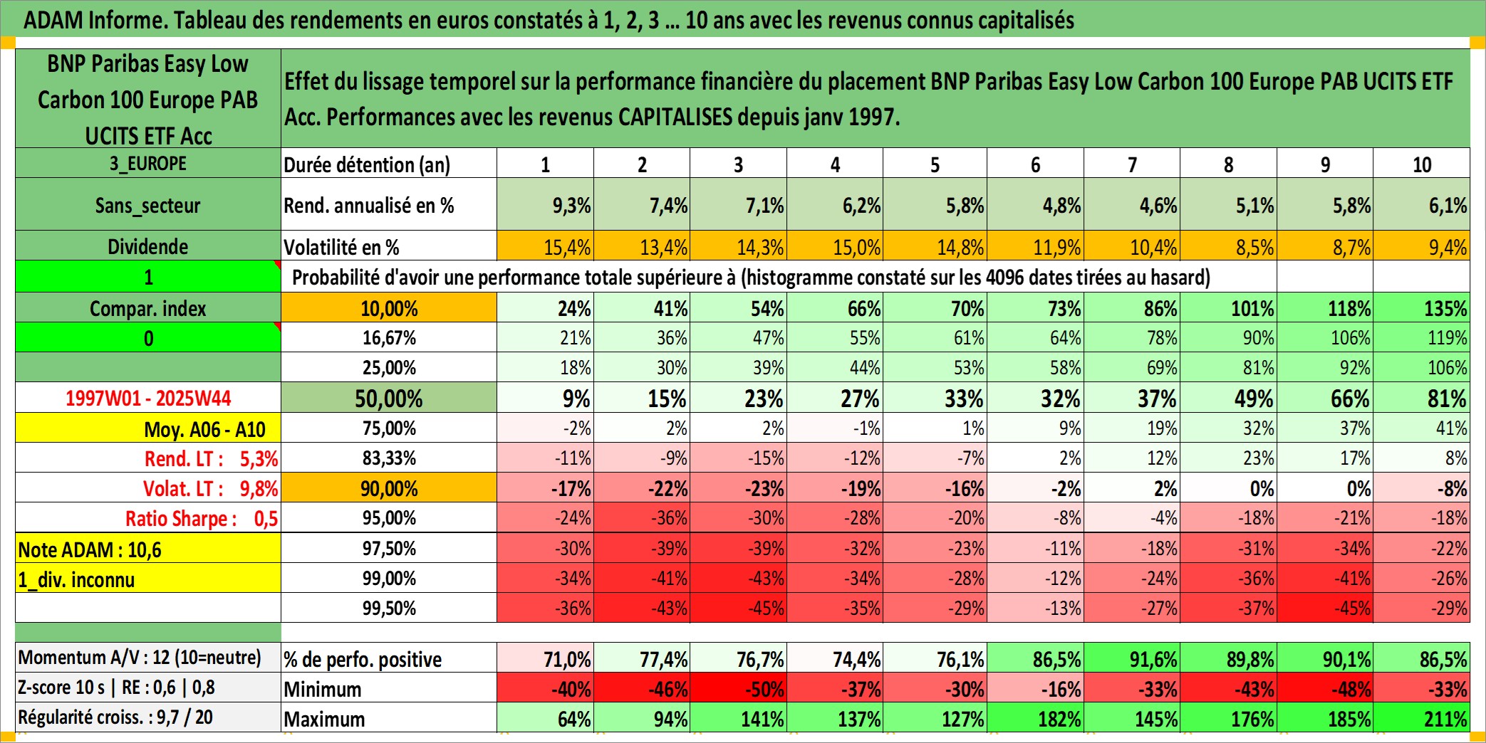 Site dédié aux investisseursPage dédiée sur site financeAnalyse des valorisations hebdomadaires du fonds BNP Paribas Easy Low Carbon 100 Europe PAB UCITS ETF Acc. Cet actif est cote en EUR. Les valorisations couvrent les semaines 1997W01 a 2025W44. Les revenus de cet actif financier sont pris en compte depuis la semaine 1997W01. La note ESG de cet actif n'est pas connue.