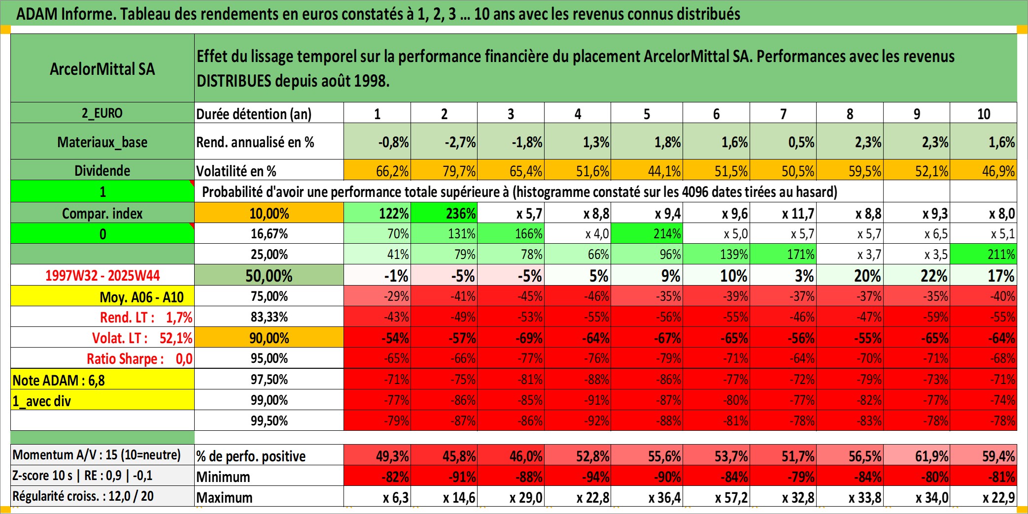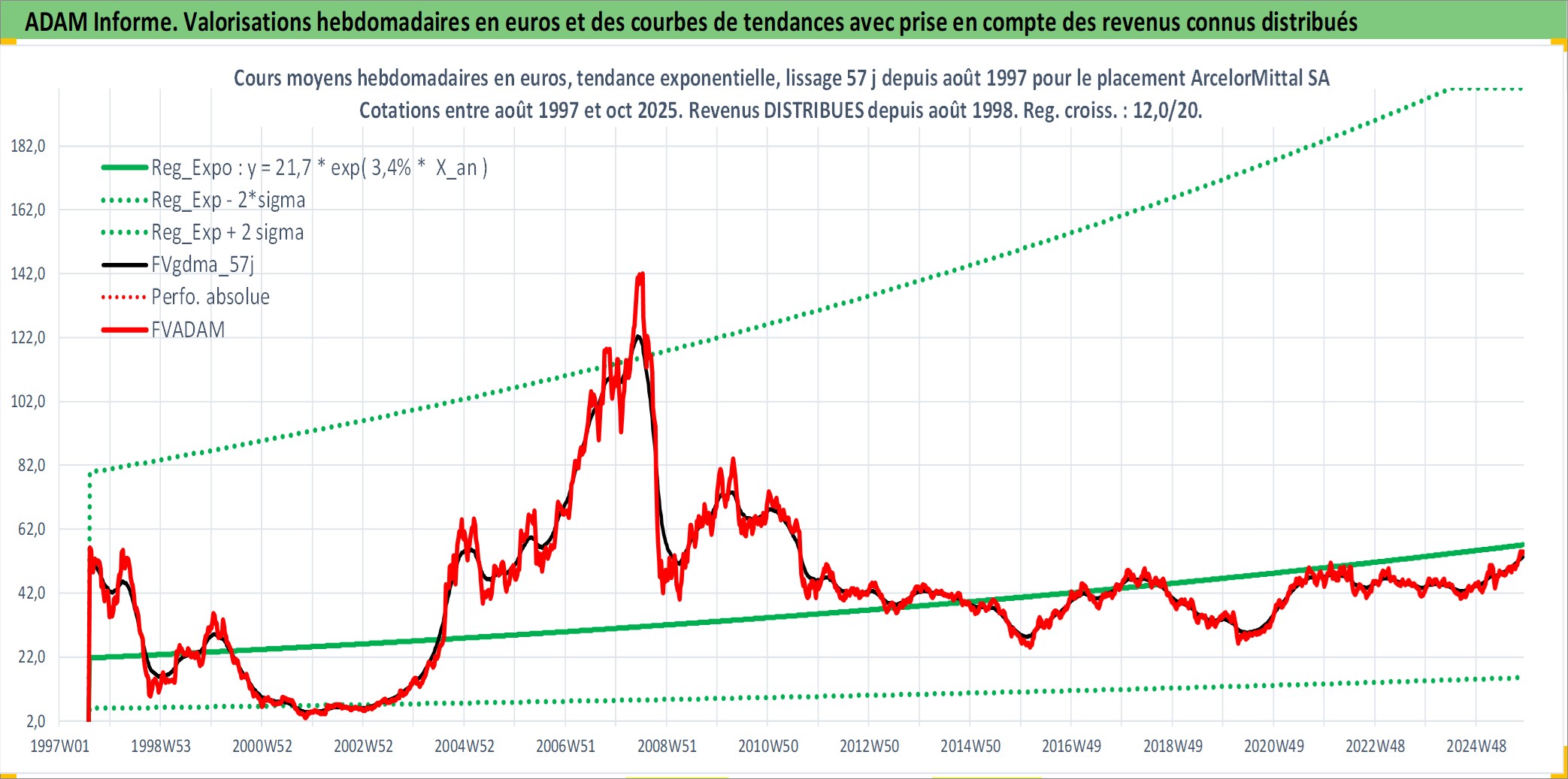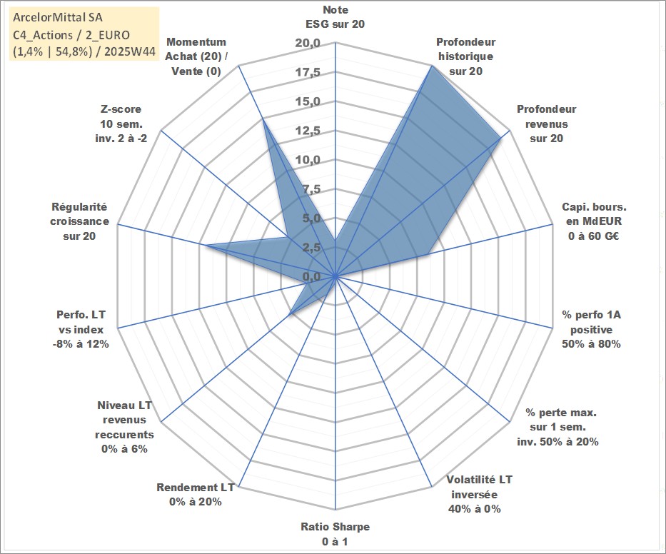 Site dédié aux investisseursPage dédiée sur site financeAnalyse des valorisations hebdomadaires de l'action ArcelorMittal SA. Cet actif est cote en EUR. Les valorisations couvrent les semaines 1997W32 a 2025W44. Les revenus de cet actif financier sont pris en compte depuis la semaine 1998W34. La note globale ESG de cet actif est estimee a 3.0 (apres rebasage entre 0 et 20).