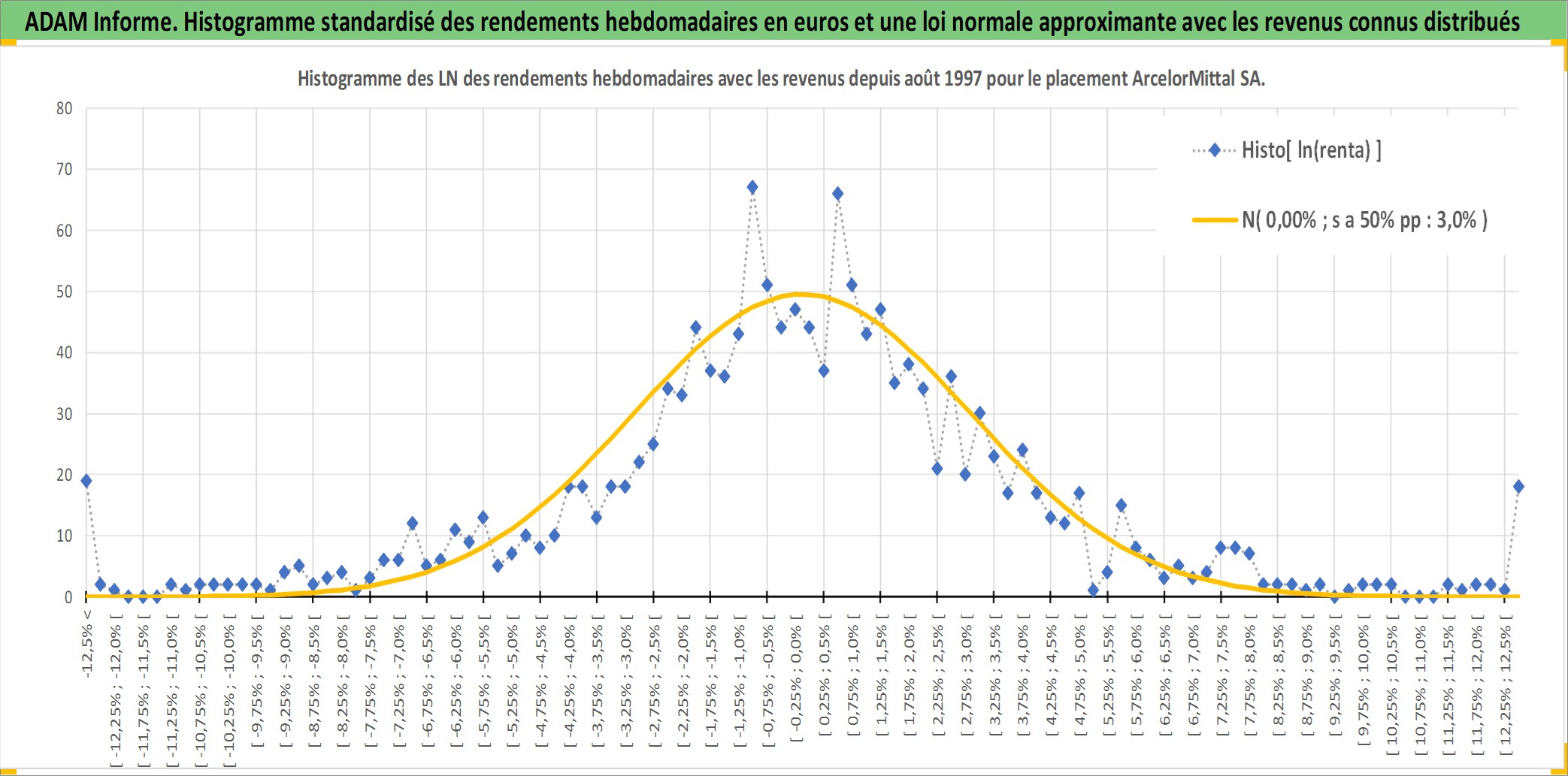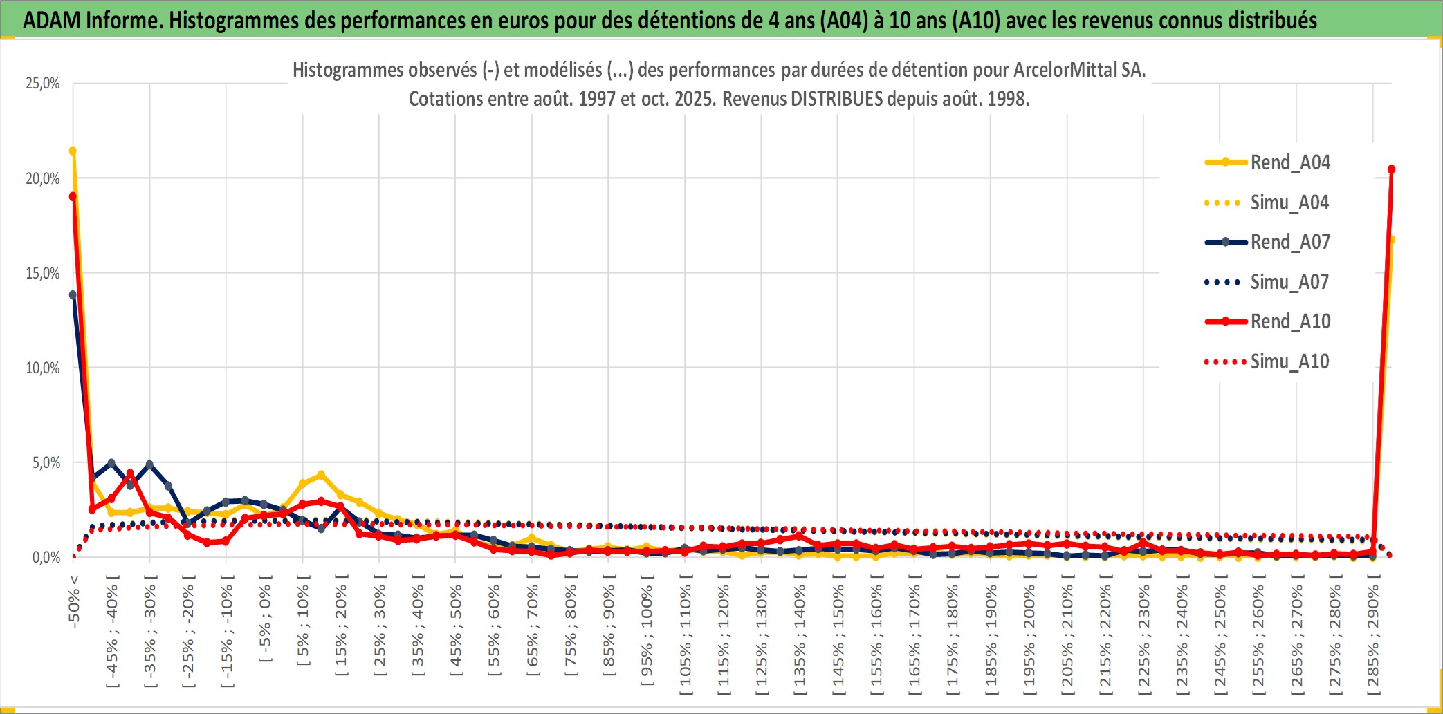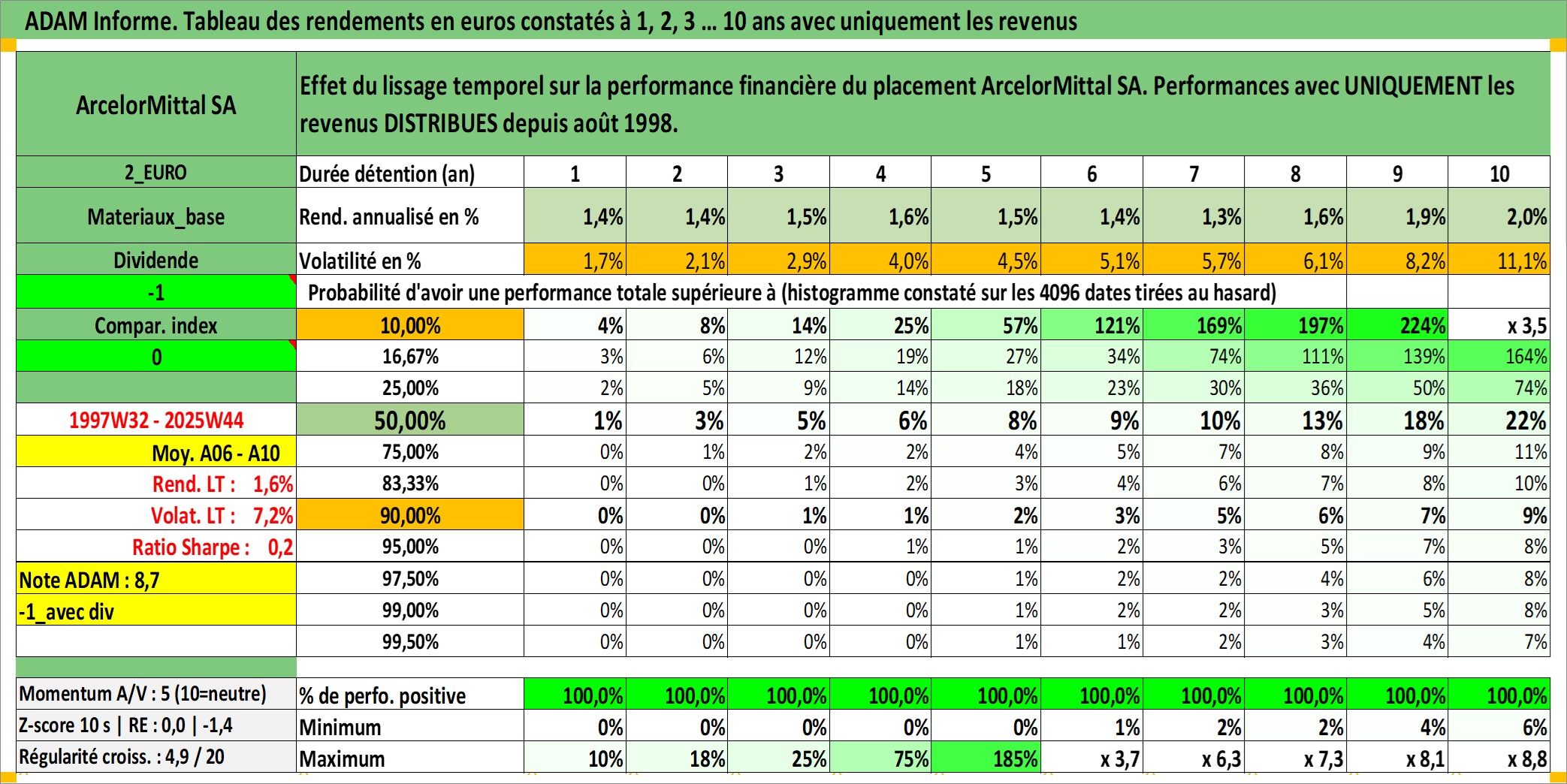 Site dédié aux investisseursPage dédiée sur site financeAnalyse des valorisations hebdomadaires de l'action ArcelorMittal SA. Cet actif est cote en EUR. Les valorisations couvrent les semaines 1997W32 a 2025W44. Les revenus de cet actif financier sont pris en compte depuis la semaine 1998W34. La note globale ESG de cet actif est estimee a 3.0 (apres rebasage entre 0 et 20).