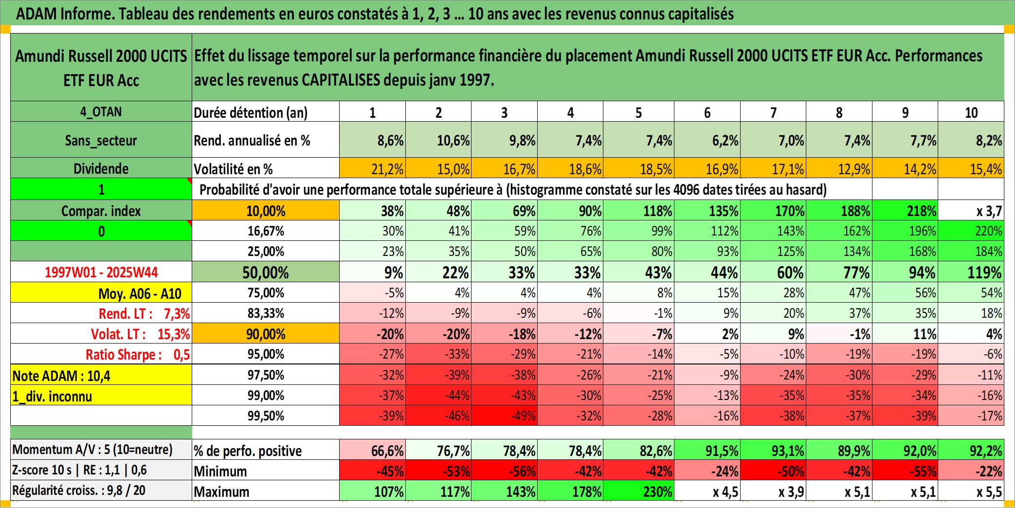 Site dédié aux investisseursPage dédiée sur site financeAnalyse des valorisations hebdomadaires du fonds Amundi Russell 2000 UCITS ETF EUR Acc. Cet actif est cote en EUR. Les valorisations couvrent les semaines 1997W01 a 2025W44. Les revenus de cet actif financier sont pris en compte depuis la semaine 1997W01. La note ESG de cet actif n'est pas connue.