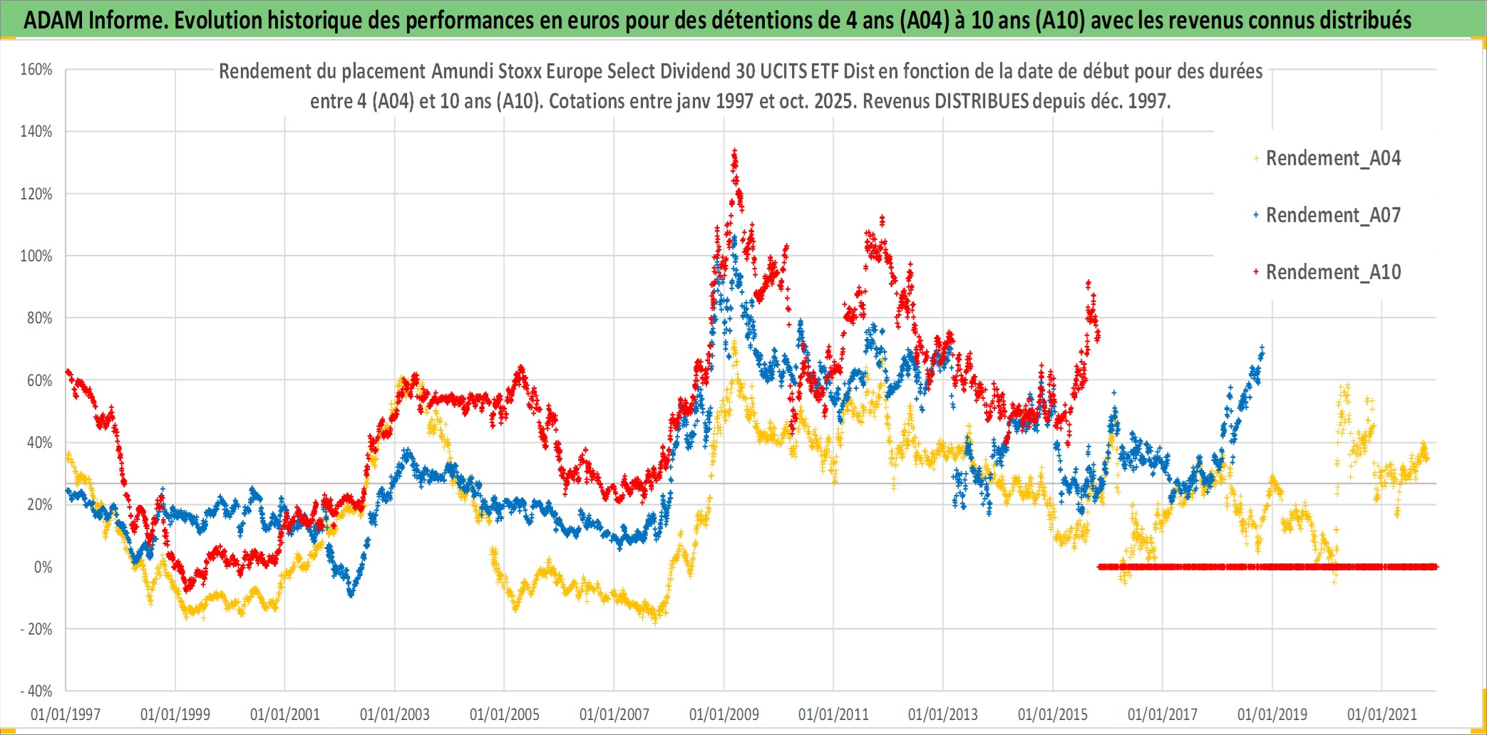 Site dédié aux investisseursPage dédiée sur site financeAnalyse des valorisations hebdomadaires du fonds Amundi Stoxx Europe Select Dividend 30 UCITS ETF Dist. Cet actif est cote en EUR. Les valorisations couvrent les semaines 1997W01 a 2025W44. Les revenus de cet actif financier sont pris en compte depuis la semaine 1997W49. La note ESG de cet actif n'est pas connue.