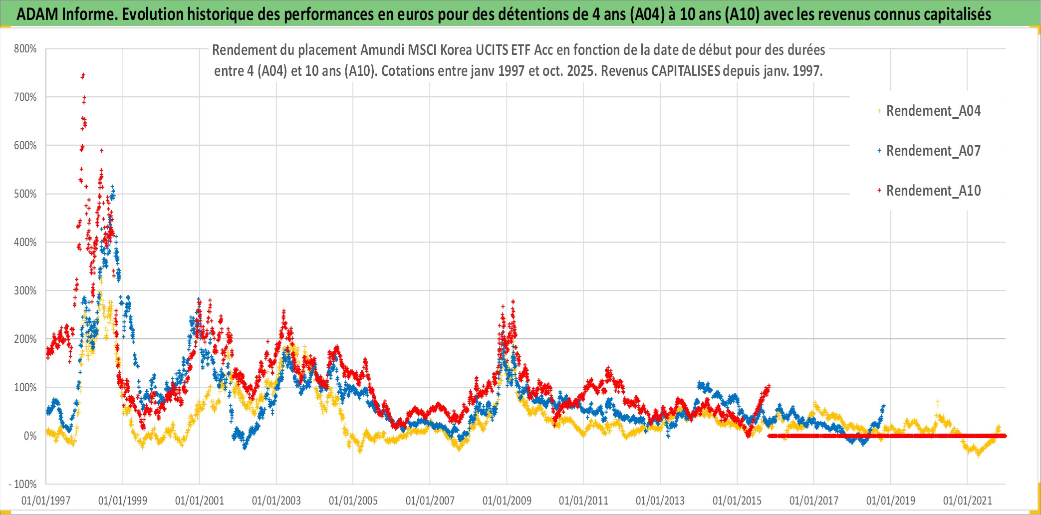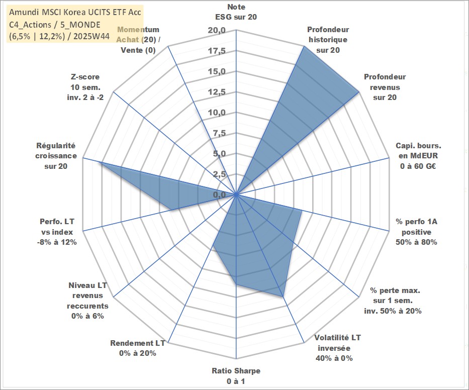 Site dédié aux investisseursPage dédiée sur site financeAnalyse des valorisations hebdomadaires du fonds Amundi MSCI Korea UCITS ETF Acc. Cet actif est cote en EUR. Les valorisations couvrent les semaines 1997W01 a 2025W44. Les revenus de cet actif financier sont pris en compte depuis la semaine 1997W01. La note ESG de cet actif n'est pas connue.