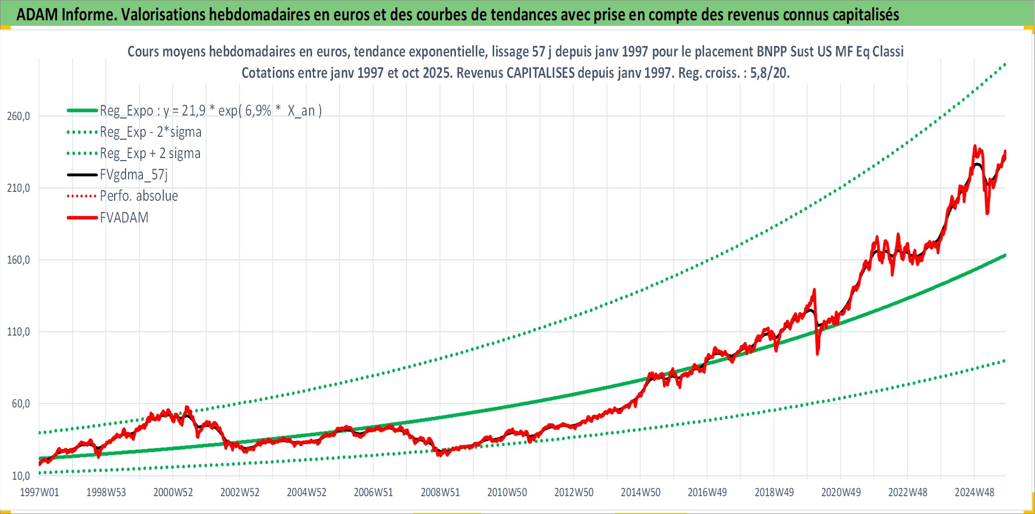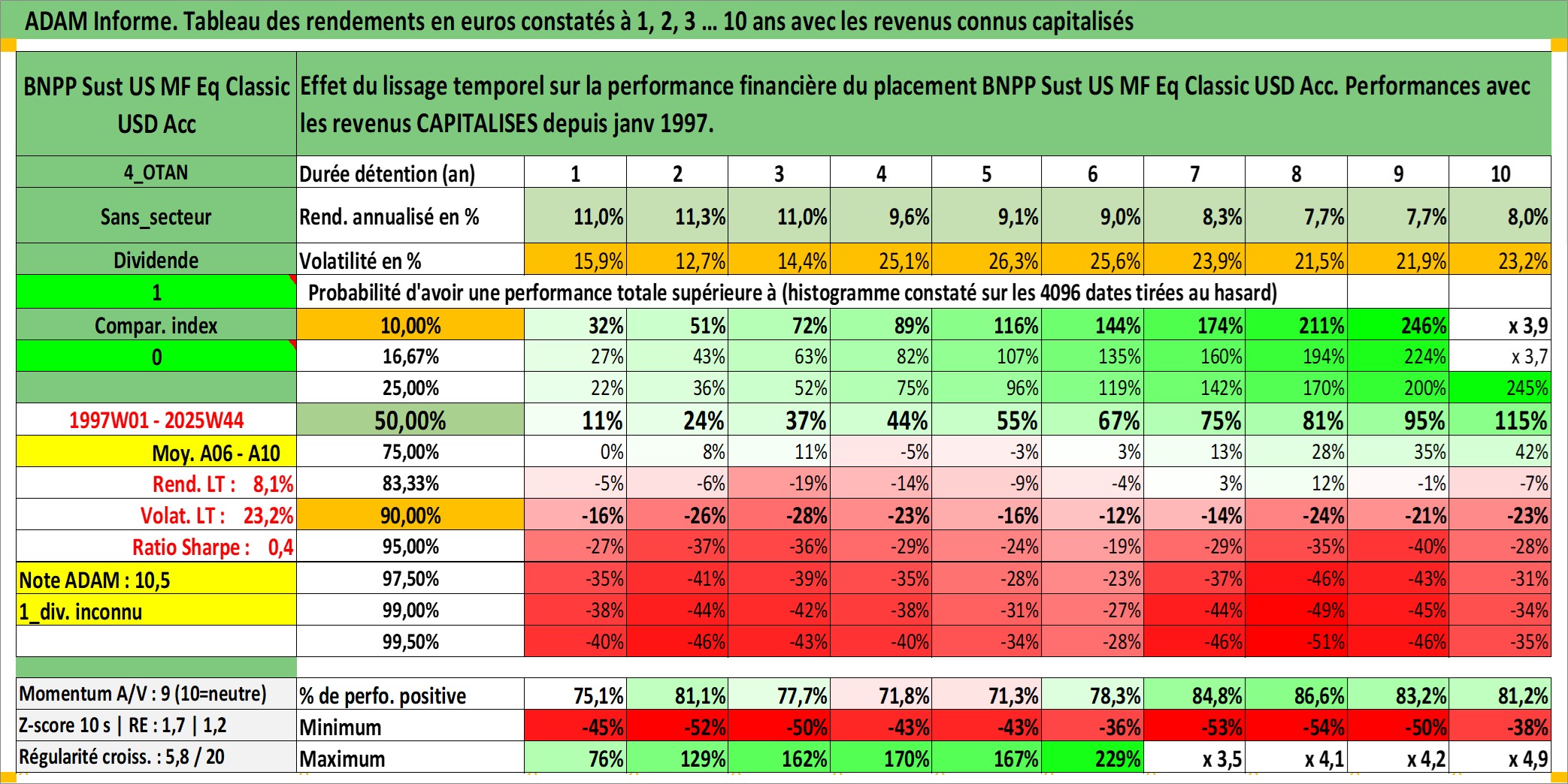 Site dédié aux investisseursPage dédiée sur site financeAnalyse des valorisations hebdomadaires du fonds BNPP Sust US MF Eq Classic USD Acc. Cet actif est cote en USD. Les valorisations sont en contrevaleur EURO et couvrent les semaines 1997W01 a 2025W44. Les revenus de cet actif financier sont pris en compte depuis la semaine 1997W01. La note globale ESG de cet actif est estimee a 10.0 (apres rebasage entre 0 et 20).
