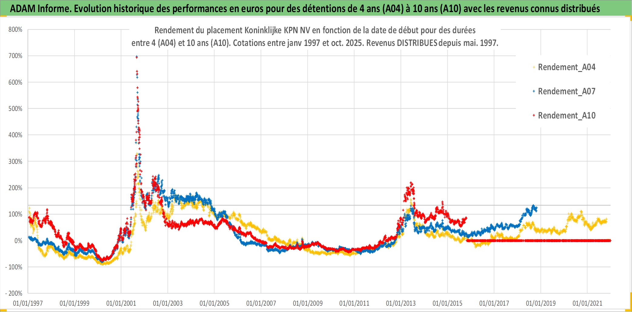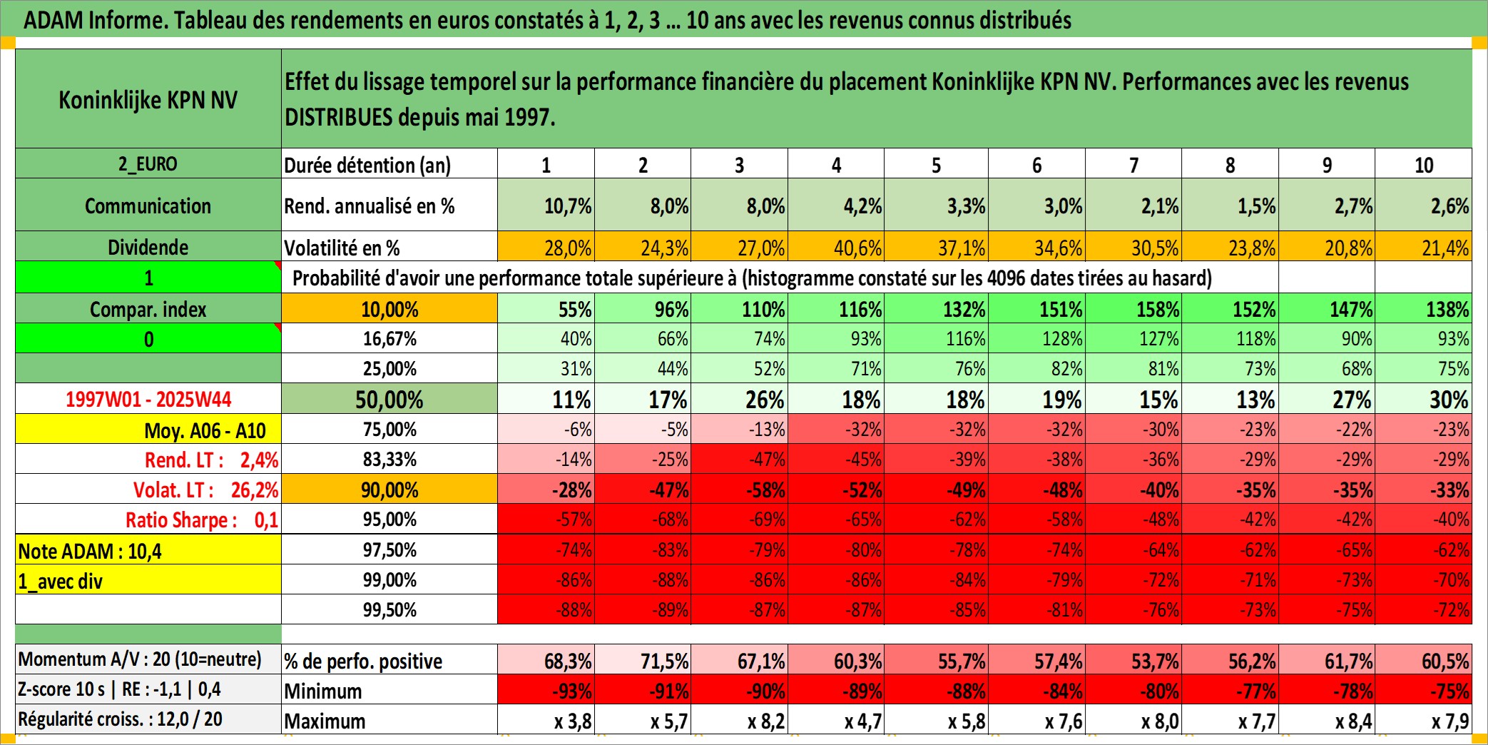 Site dédié aux investisseursPage dédiée sur site financeAnalyse des valorisations hebdomadaires de l'action Koninklijke KPN NV. Cet actif est cote en EUR. Les valorisations couvrent les semaines 1997W01 a 2025W44. Les revenus de cet actif financier sont pris en compte depuis la semaine 1997W19. La note globale ESG de cet actif est estimee a 11.0 (apres rebasage entre 0 et 20).