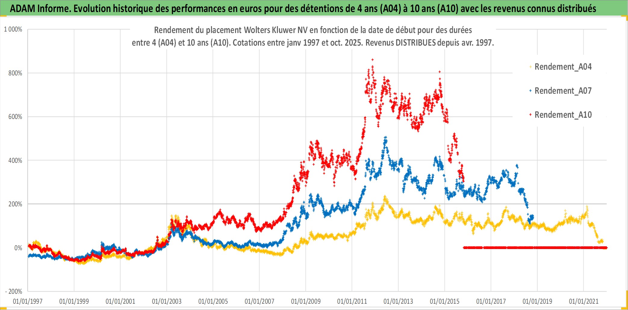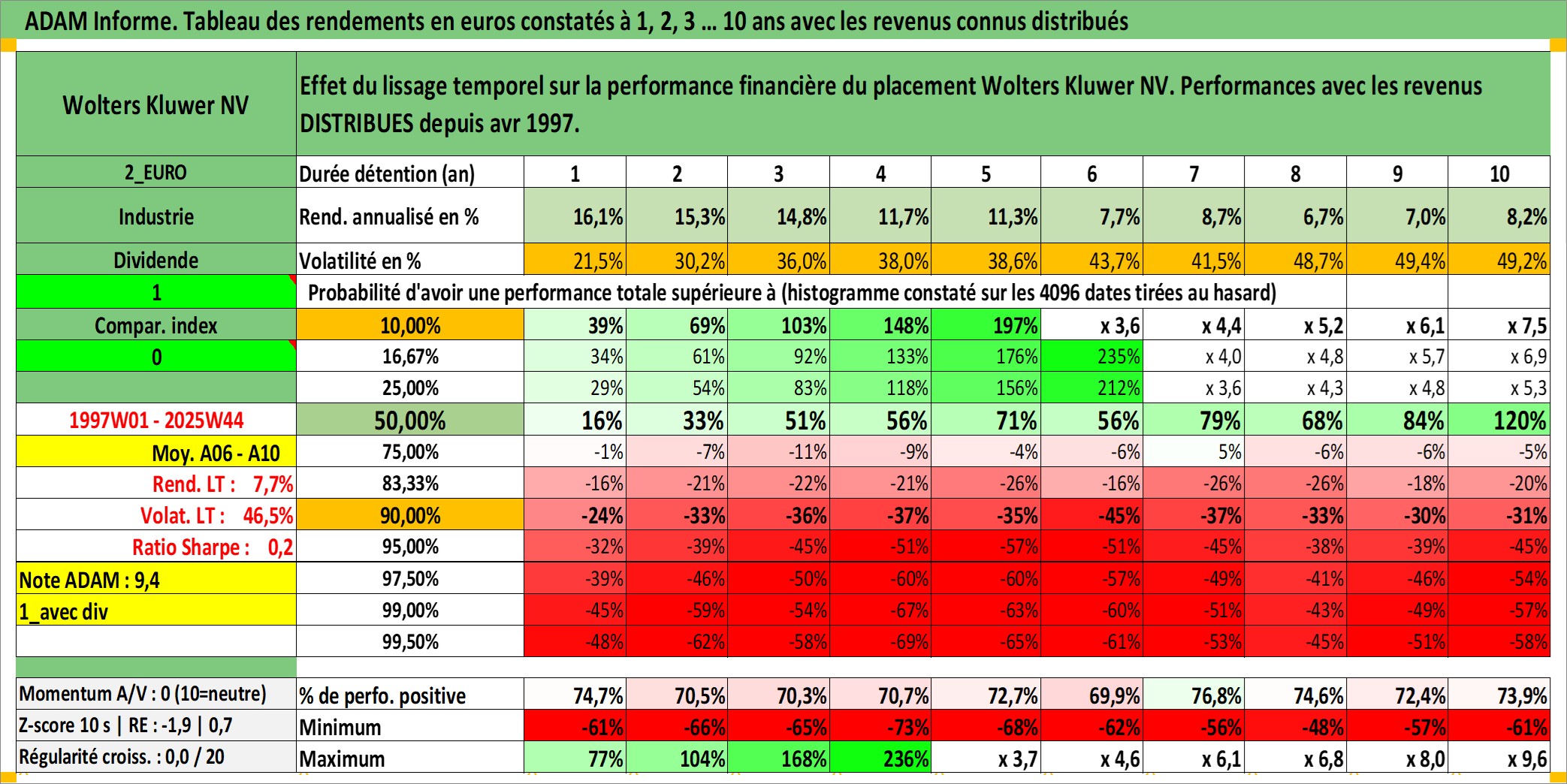 Site dédié aux investisseursPage dédiée sur site financeAnalyse des valorisations hebdomadaires de l'action Wolters Kluwer NV. Cet actif est cote en EUR. Les valorisations couvrent les semaines 1997W01 a 2025W44. Les revenus de cet actif financier sont pris en compte depuis la semaine 1997W16. La note globale ESG de cet actif est estimee a 12.0 (apres rebasage entre 0 et 20).