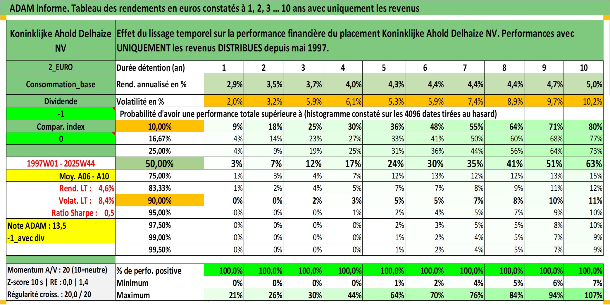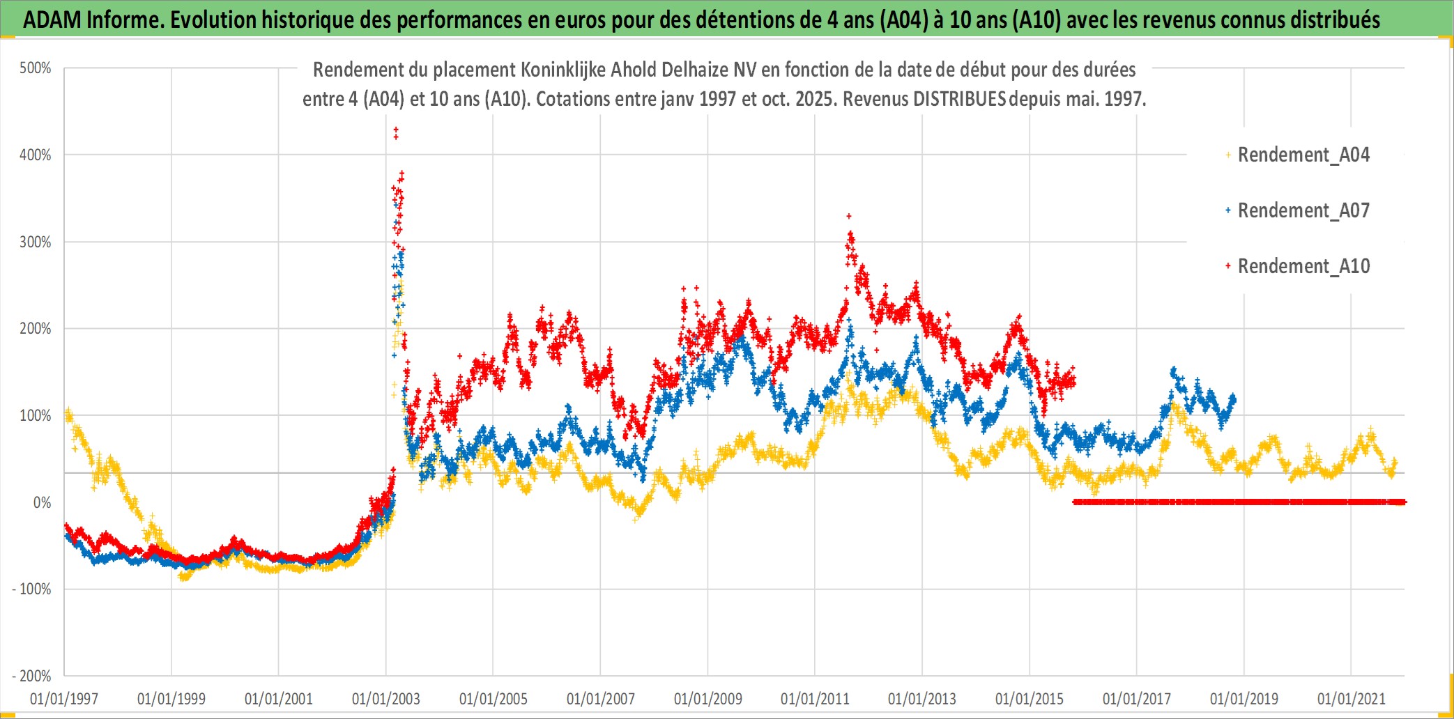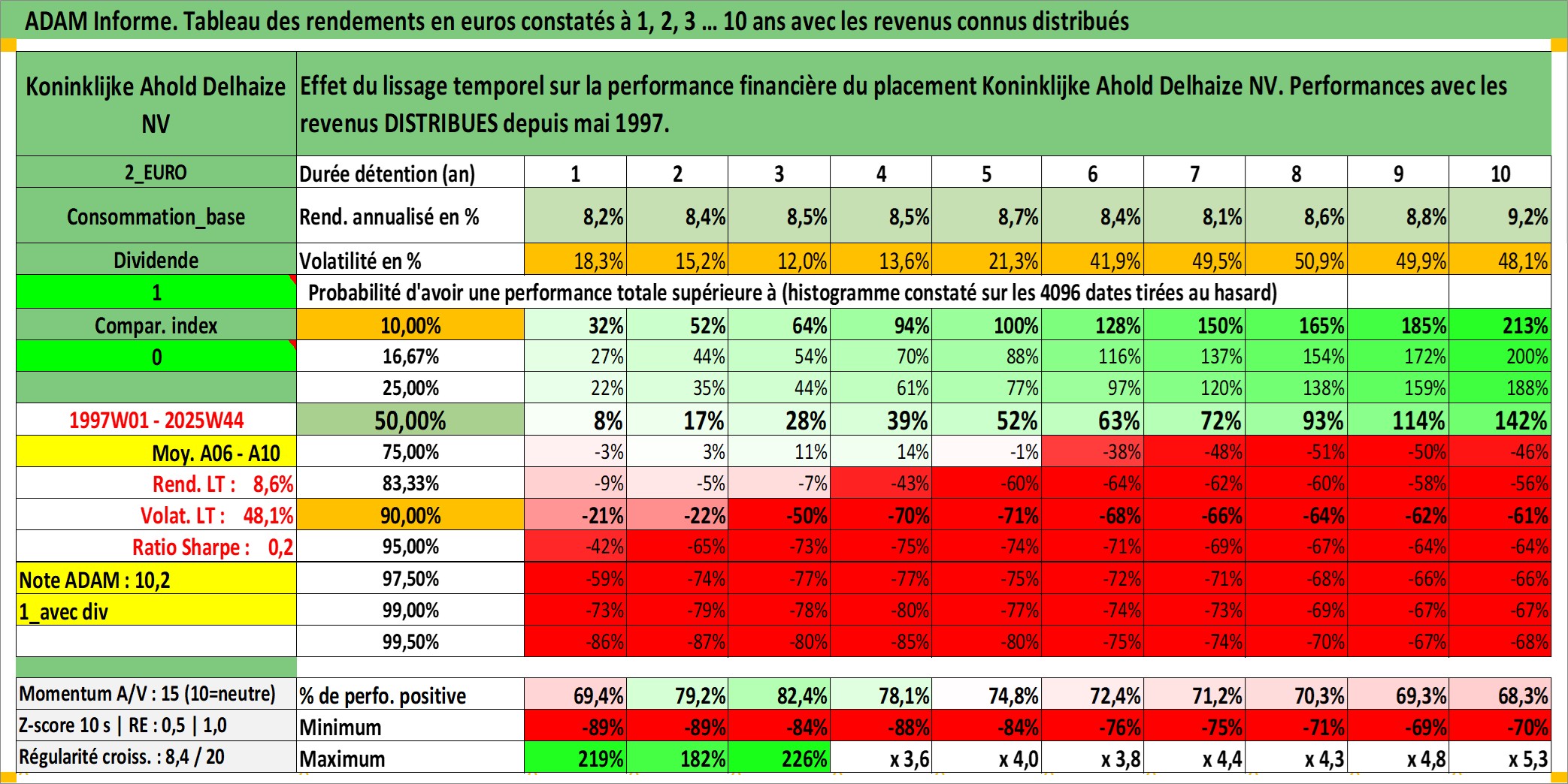 Site dédié aux investisseursPage dédiée sur site financeAnalyse des valorisations hebdomadaires de l'action Koninklijke Ahold Delhaize NV. Cet actif est cote en EUR. Les valorisations couvrent les semaines 1997W01 a 2025W44. Les revenus de cet actif financier sont pris en compte depuis la semaine 1997W19. La note globale ESG de cet actif est estimee a 10.0 (apres rebasage entre 0 et 20).