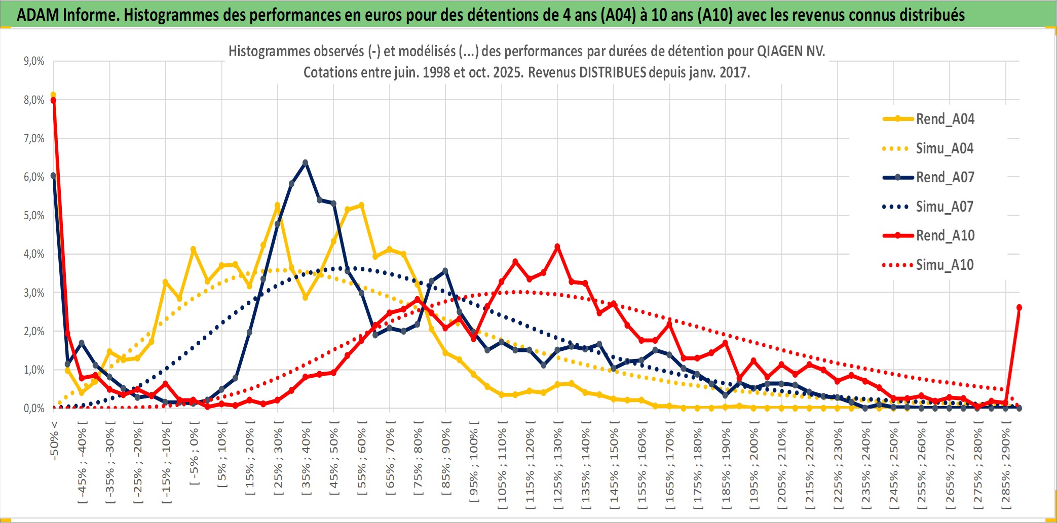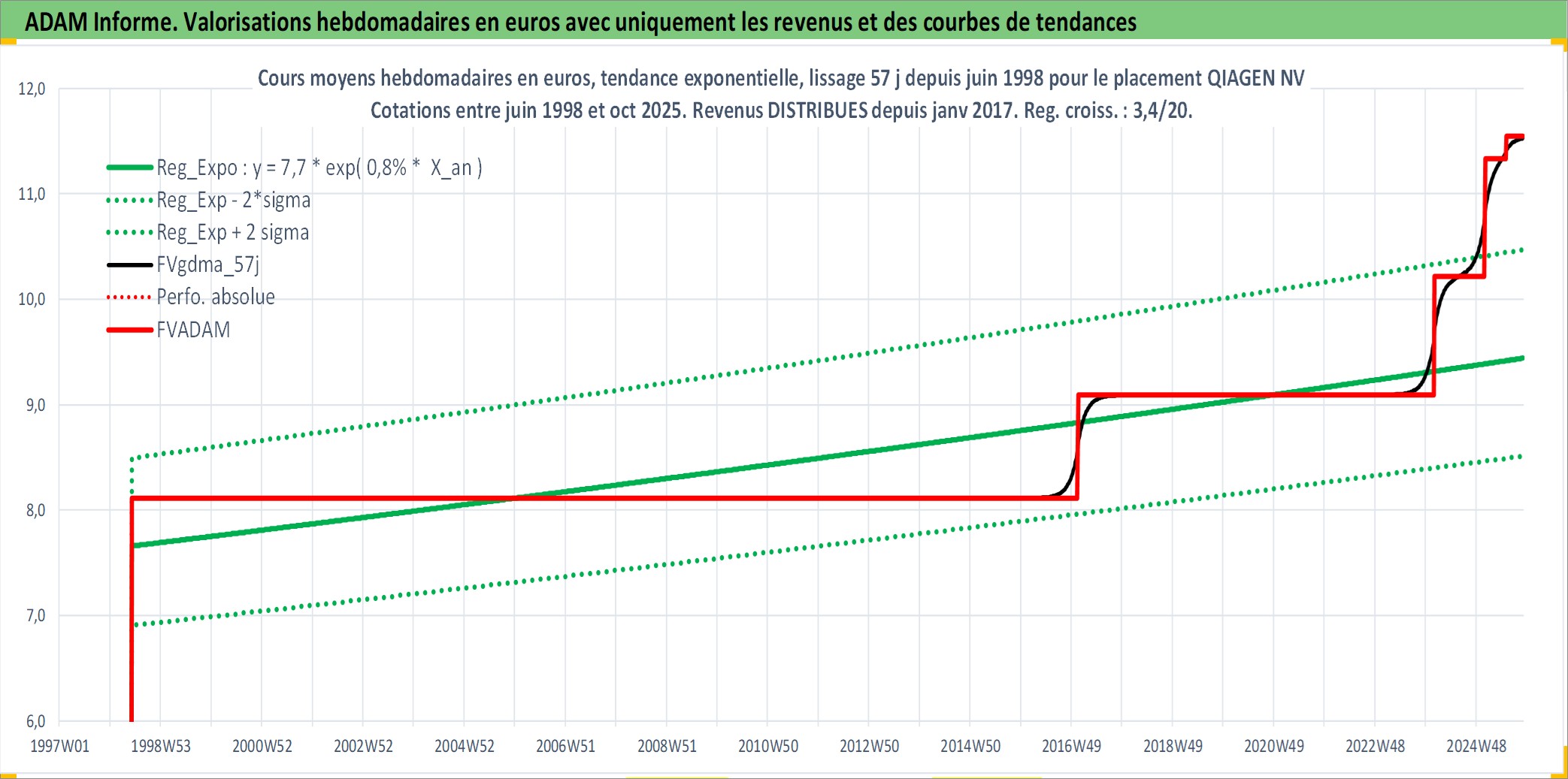 Site dédié aux investisseursPage dédiée sur site financeAnalyse des valorisations hebdomadaires de l'action QIAGEN NV. Cet actif est cote en EUR. Les valorisations couvrent les semaines 1998W23 a 2025W44. Les revenus de cet actif financier sont pris en compte depuis la semaine 2017W04. La note globale ESG de cet actif est estimee a 13.0 (apres rebasage entre 0 et 20).